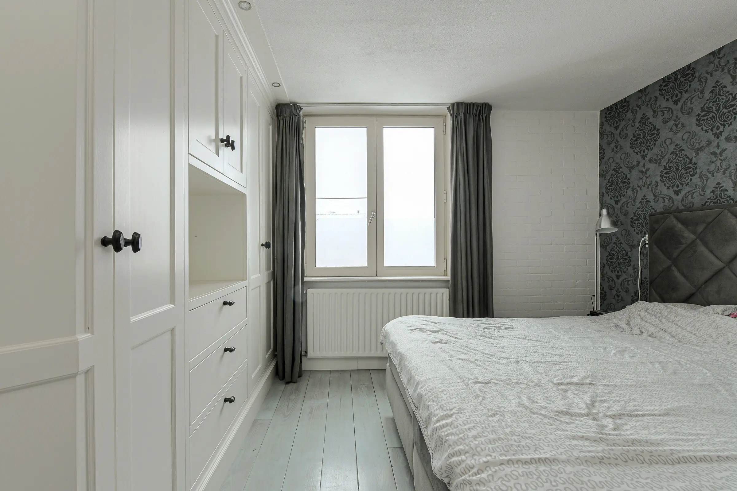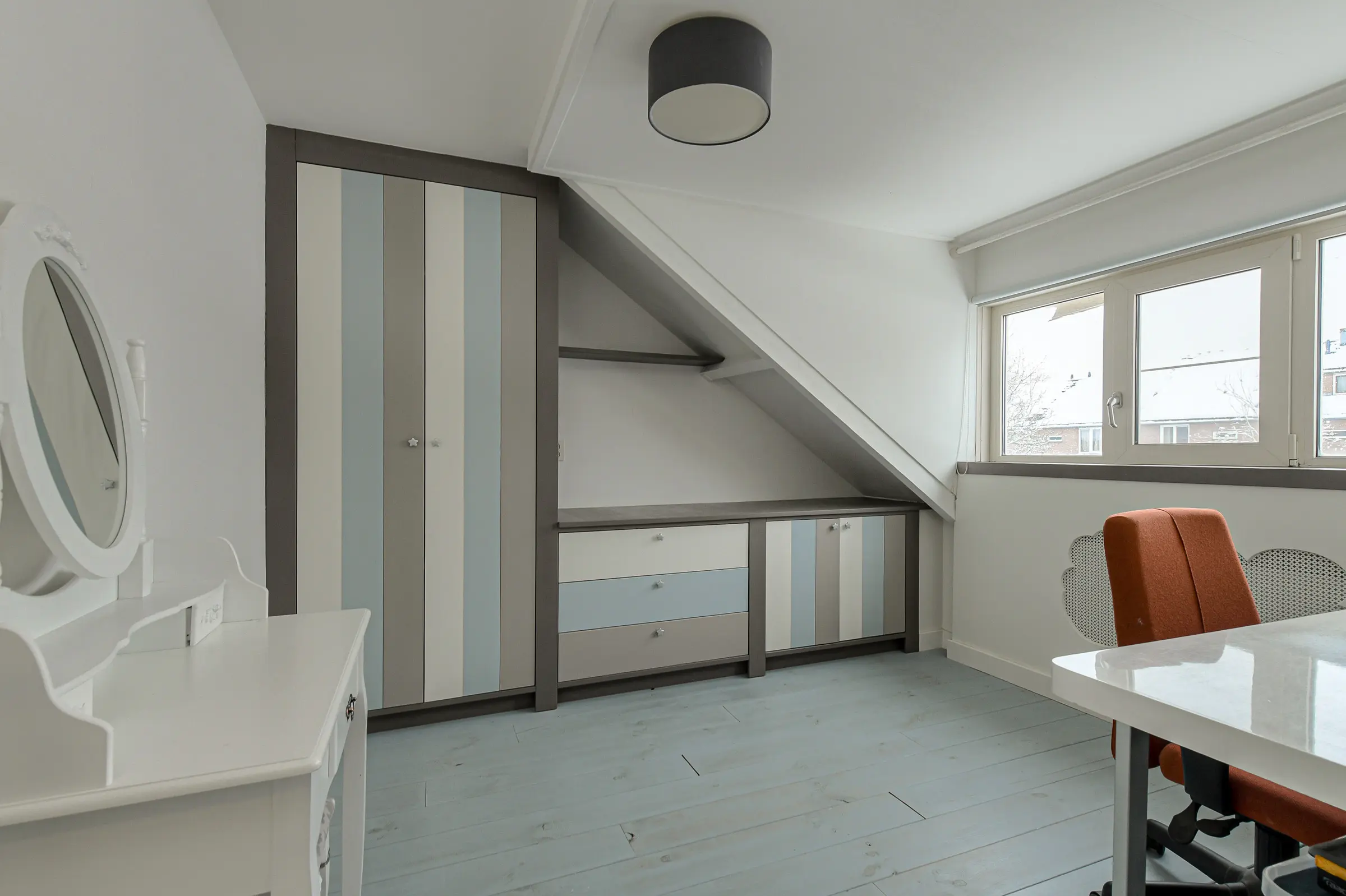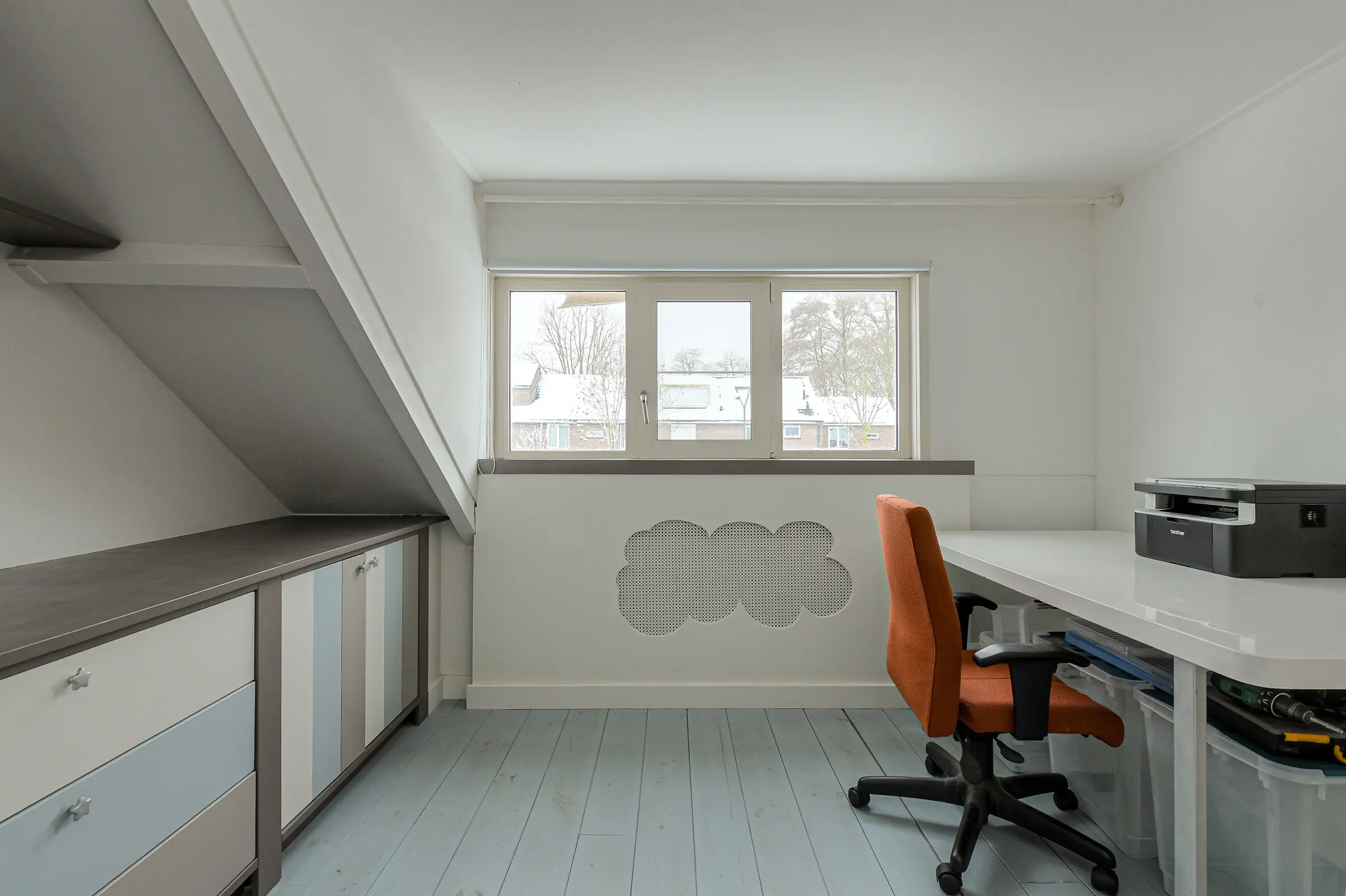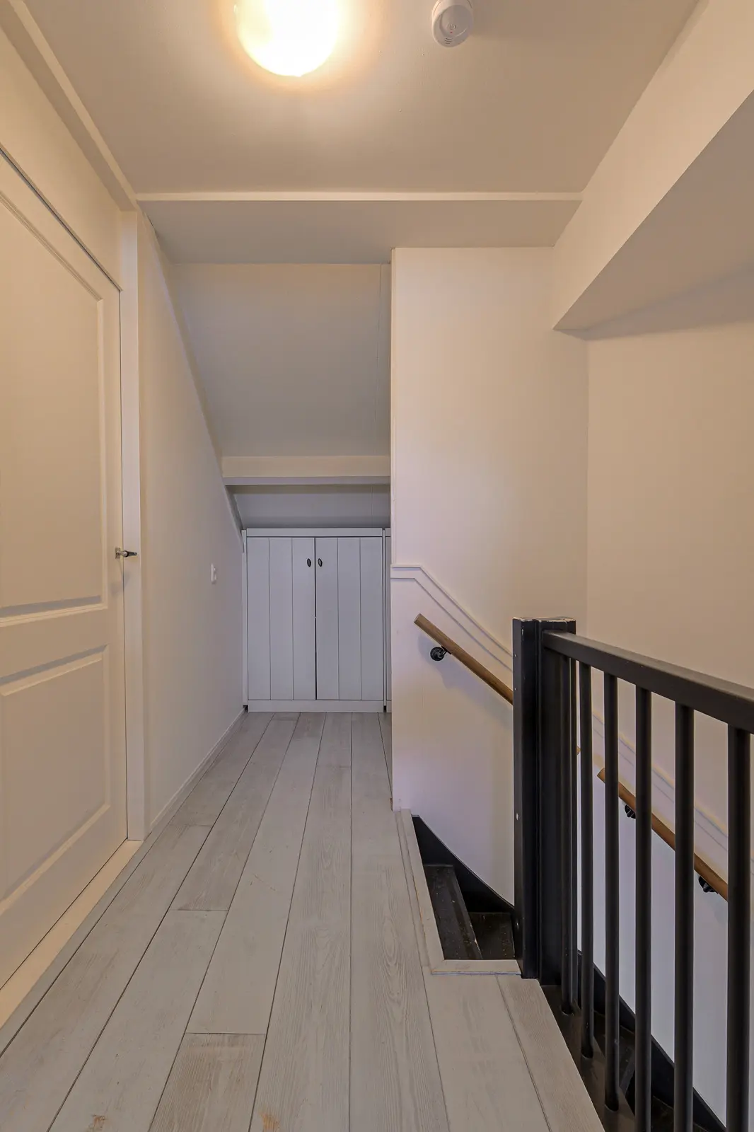 De bovenverdieping is voorzien van een houten vloer. Stookruimte met de plaats voor de HR combiketel bevindt zich op de overloop. Tevens vindt u hier de vlizotrap naar de zolder. Slaapkamer aan de achterzijde is voorzien van een vaste kast en dakkapel. Slaapkamer aan de voorzijde is voorzien van een vaste kast; de badkamer is fraai betegeld en voorzien van een inloopdouche, een hangend closet, designradiator en een wasmachine aansluiting.