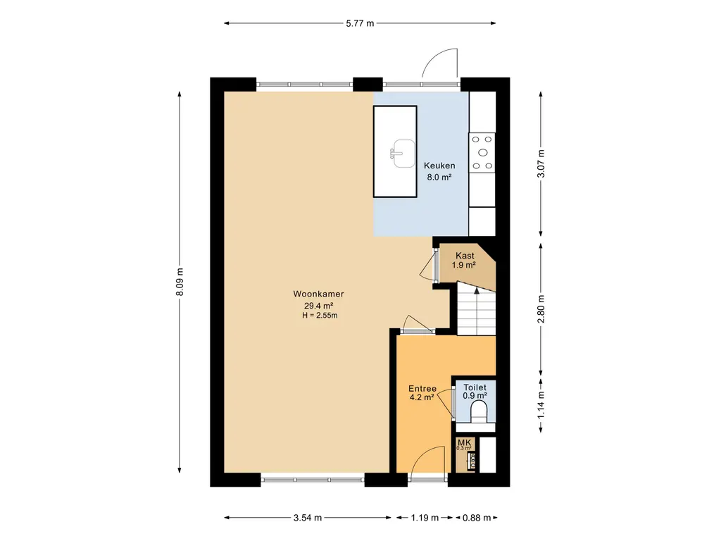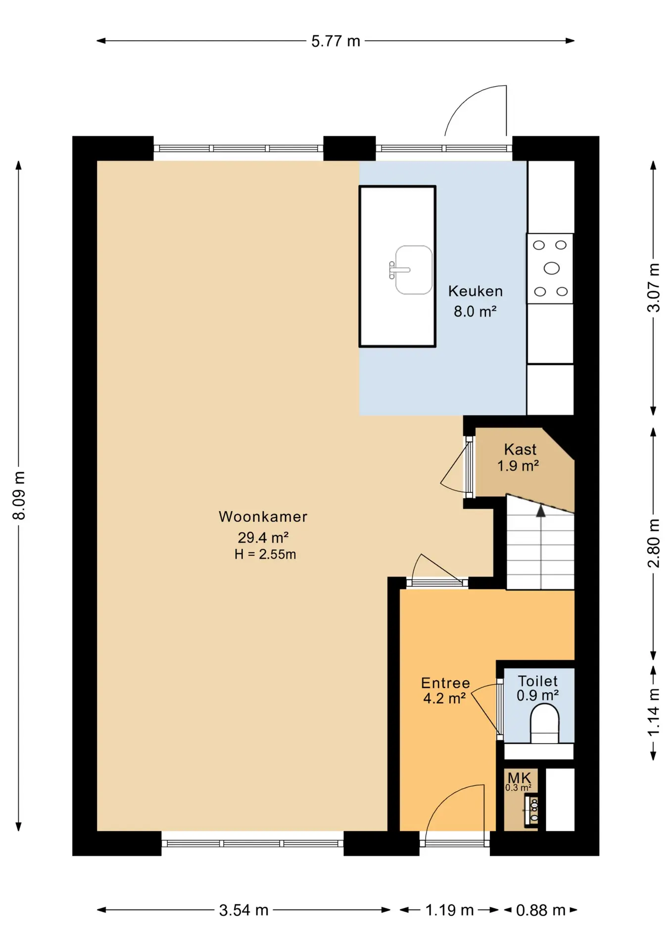 Entree/hal met plavuizenvloer, meterkast en trapopgang; toilet met hangend closet; royale woonkamer met een laminaatvloer en trapakst; open keuken met een tuindeur en een luxe inrichtingen voorzien van een granito aanrechtblad met eiland. Verder is er een 5 pits Falcon gaskookplaat met 2 ovens en een salamander grill, een koelkast, vaatwasmachine en een afzuigkap.