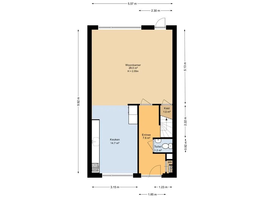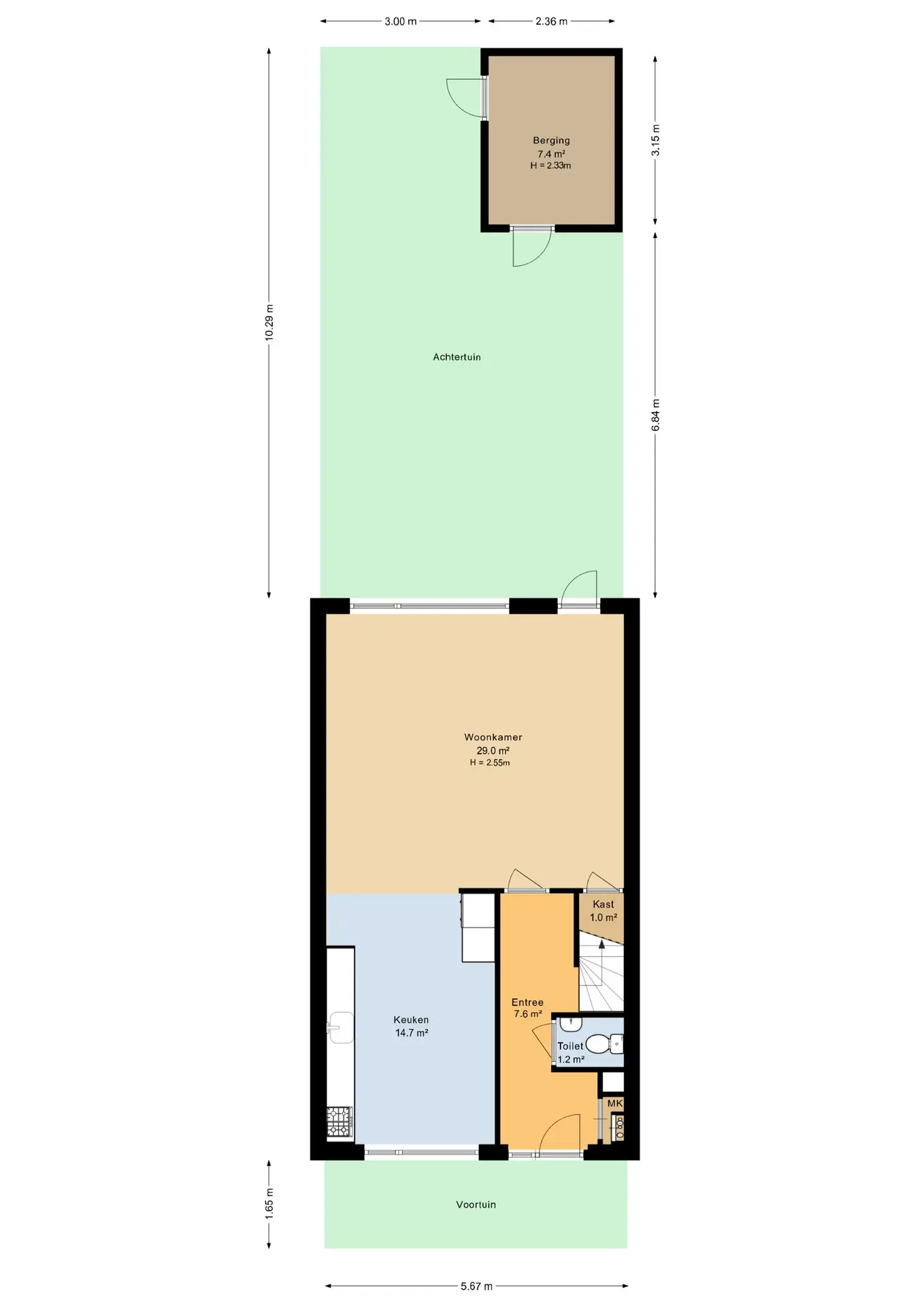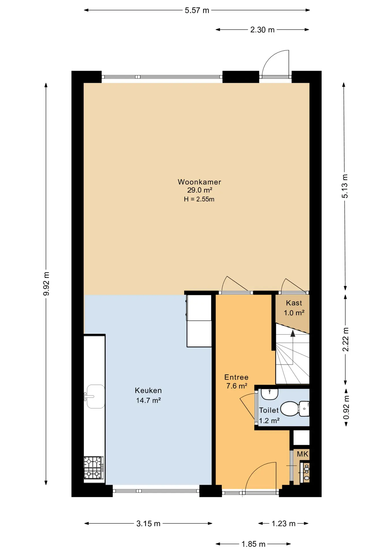 Entree/hal met meterkast en trapopgang; toilet met fonteintje; tuingerichte woonkamer (ca. 5.57 x 5.13 m.) met een fraaie laminaatvloer, trapkast en een deur naar de achtertuin; leefkeuken aan de voorzijde gelegen (ca. 3.15 x 4.64 m.) is ruim genoeg voor een eethoek te plaatsen. De keuken inrichting is modern, van recente datum en compleet uitgerust met o.a. een combimagnetron, een koel-/vriescombinatie, een vaatwasser, 4 pits gaskookplaat en een afzuigkap.