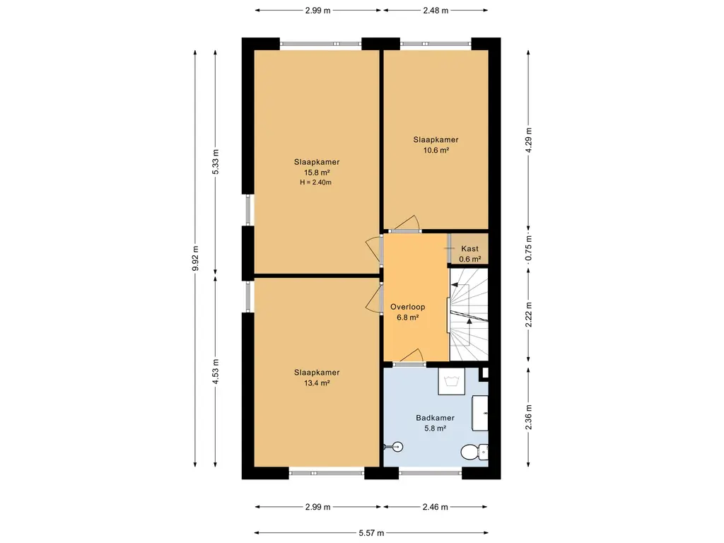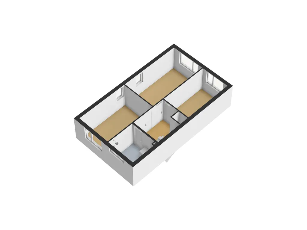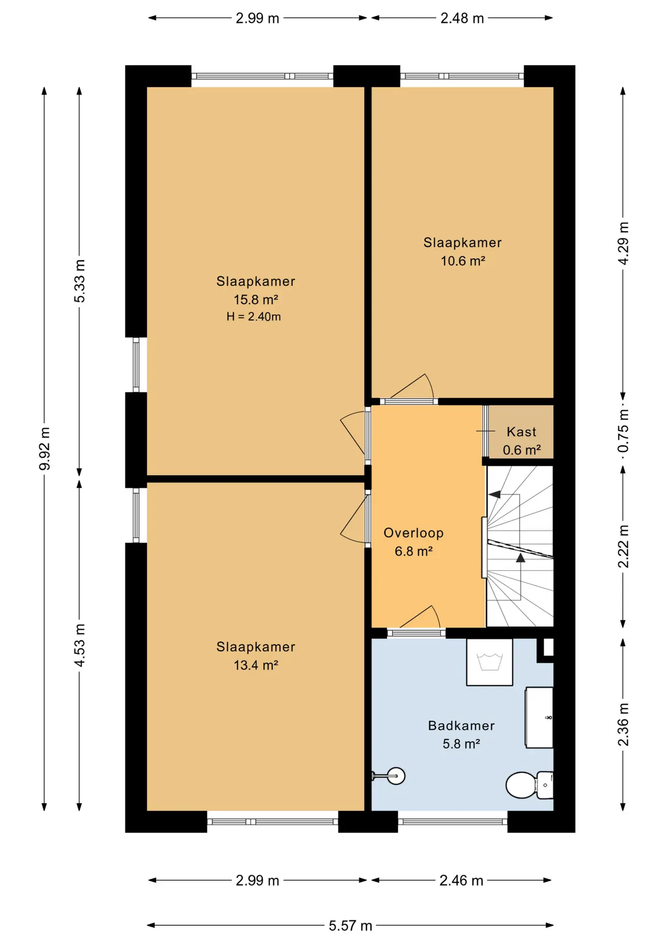 Overloop met trapopgang naar de tweede verdieping; slaapkamer voorzijde (ca. 3.00 x 4.53 m); slaapkamer achter (ca. 3.00 x 5.33 m.); slaapkamer achterzijde (ca. 2.45 x 4.30 m); badkamer (ca. 2.45 x 2.35 m.) is voorzien van een douche, toilet, een wastafelmeubel en een designradiator. Hier is ook een wasmachine aansluiting.