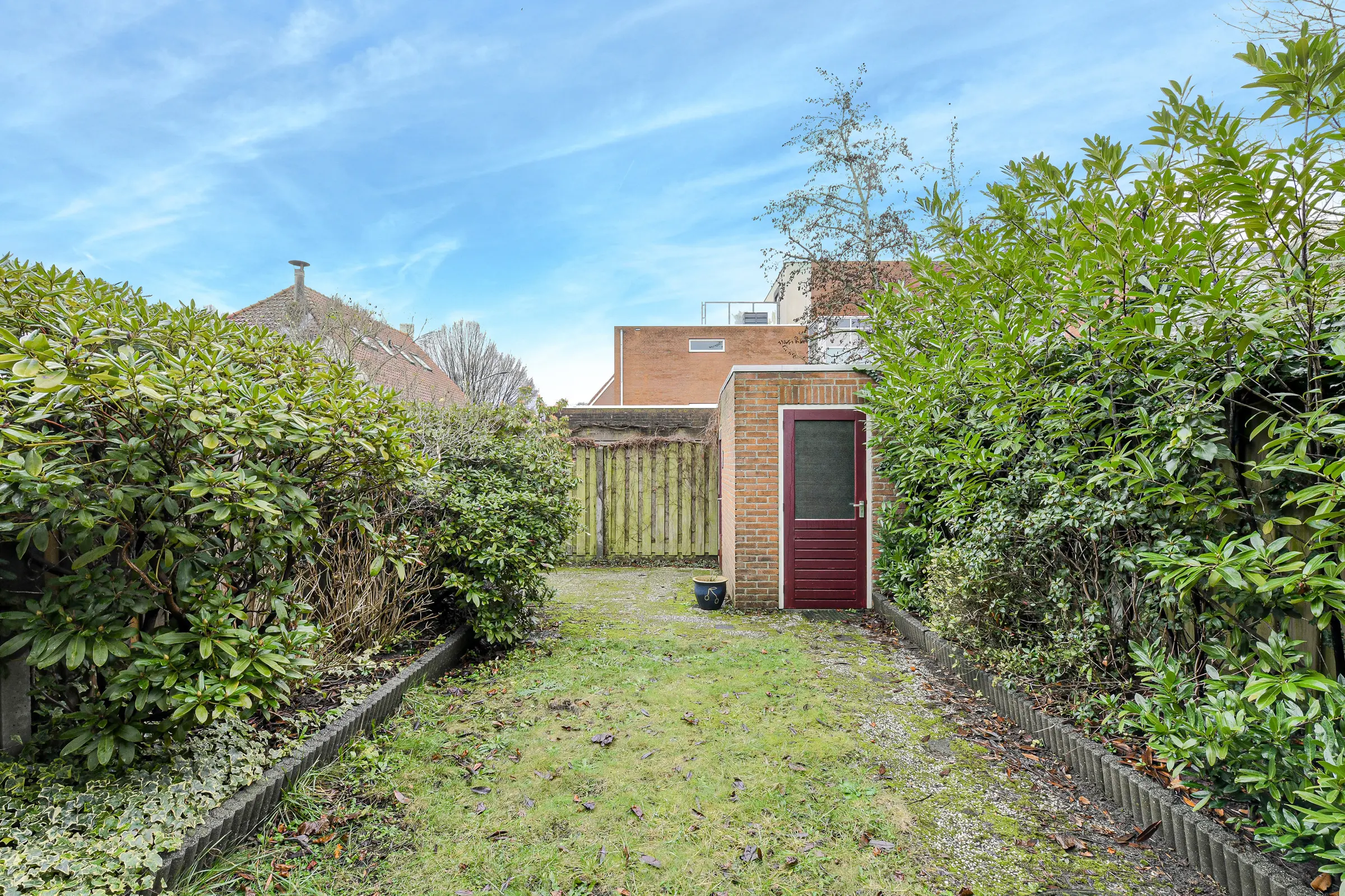 De achtertuin is ruim 10 meter diep en op het oosten gelegen. Door de diepte van de tuin is de ligging gunstig voor de zon. Verder is de tuin voorzien van een gazon, borders met vaste beplanting en houten erfafscheidingen. Uiteraard is er een achterom en de stenen berging voorzien van elektra is achterop het perceel gelegen.
