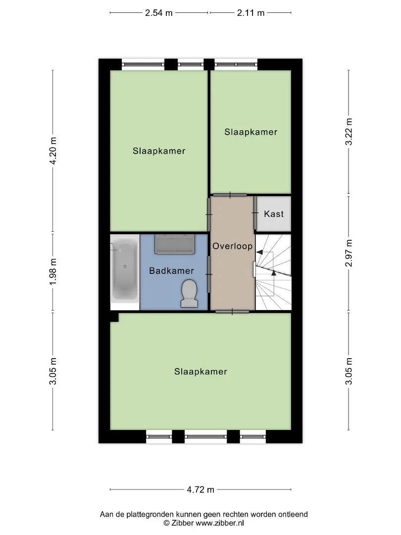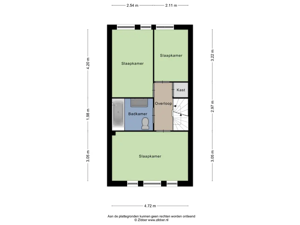 Overloop met trapopgang en vaste kast; slaapkamer voorzijde (afm. ca 3.05 x 4.72 m.); slaapkamer achterzijde (afm. ca. 3.22 x 2.11 m.); slaapkamer achterzijde (afm. 2.54 x 4.20 m.); geheel betegelde badkamer voorzien van ligbad, douchescherm, hangend closet, dubbele wastafel met meubel en een designradiator. Overloop en slaapkamers zijn voorzien van een fraaie laminaatvloer.