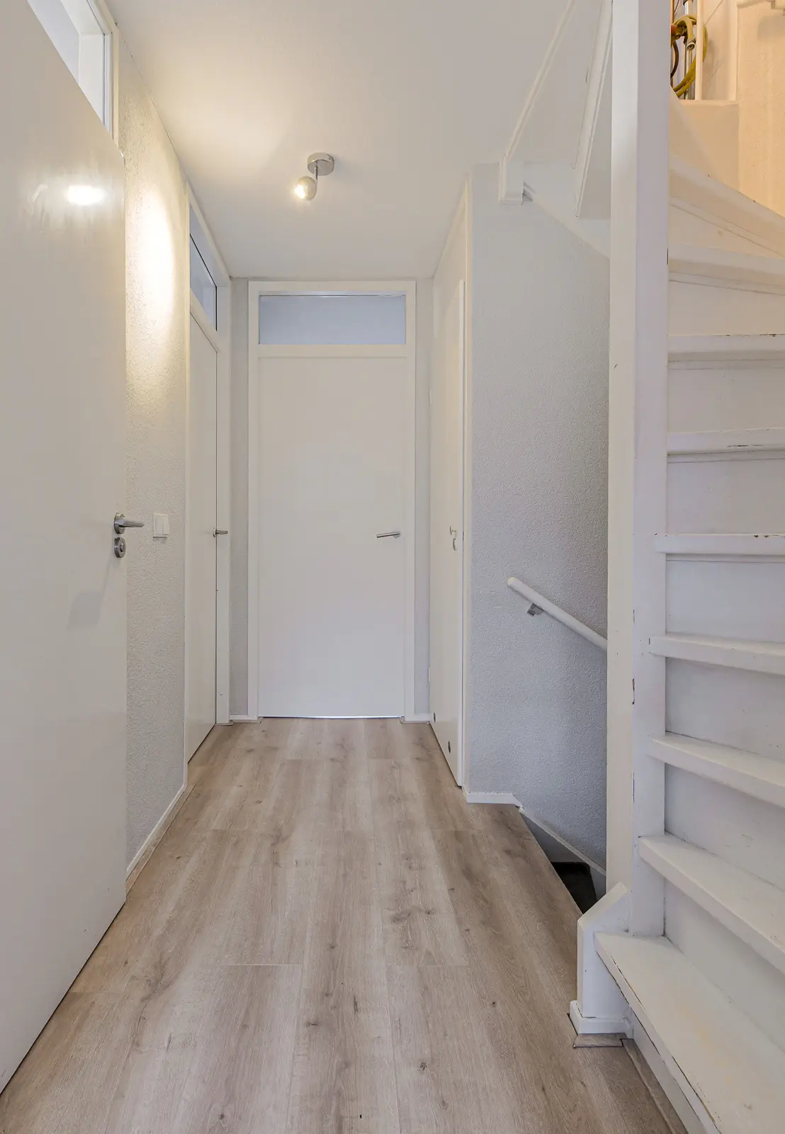 Entree/hal met meterkast (8 groepen en 2 aardlekschakelaars), trapopgang en toilet voorzien van hangend closet en fonteintje; lichte, zonnige woonkamer (afm. ca. 6.30 x 4.4 m.) met een fraaie laminaat vloer, trapkast en tuindeur; open keuken (afm. ca. 2.99 x 2.32 m.) met moderne U-vormige inbouw inrichting voorzien van een 5-pits gaskookplaat, afzuigkap, heteluchtoven, magnetron, vaatwasser, koelkast en indirecte verlichting maken deze keuken compleet.