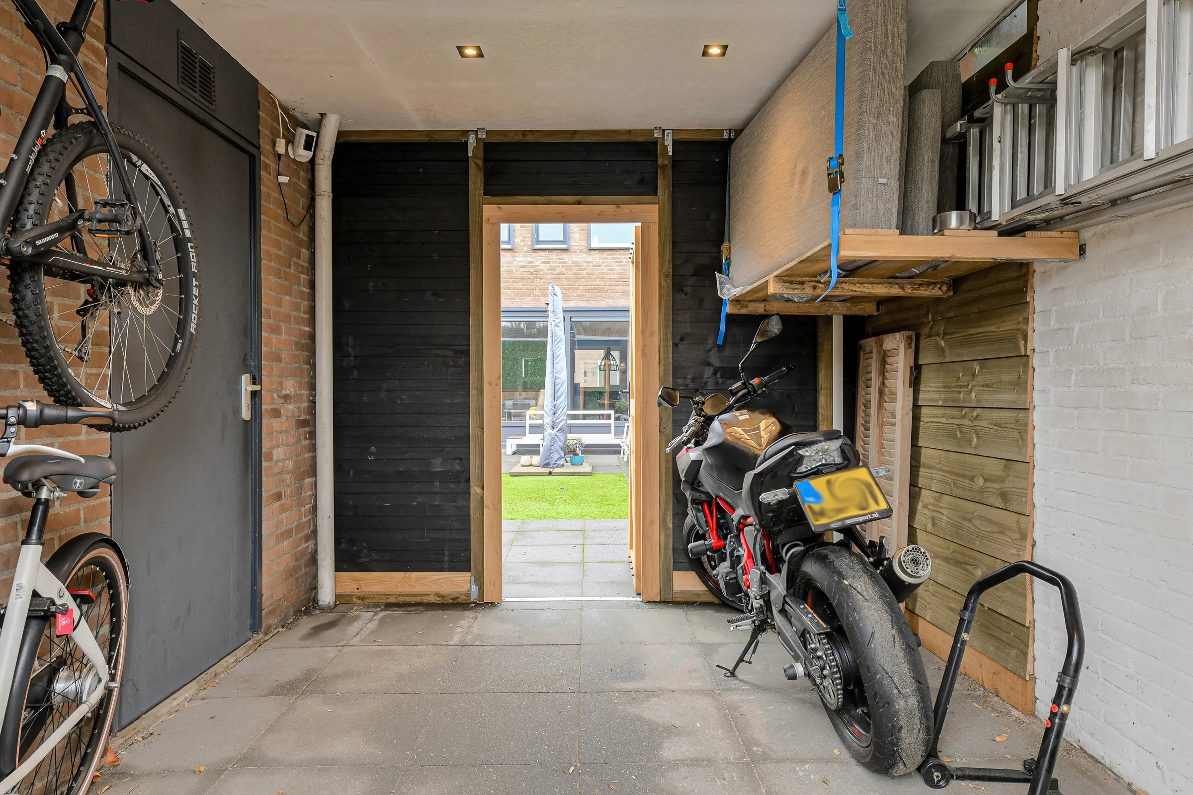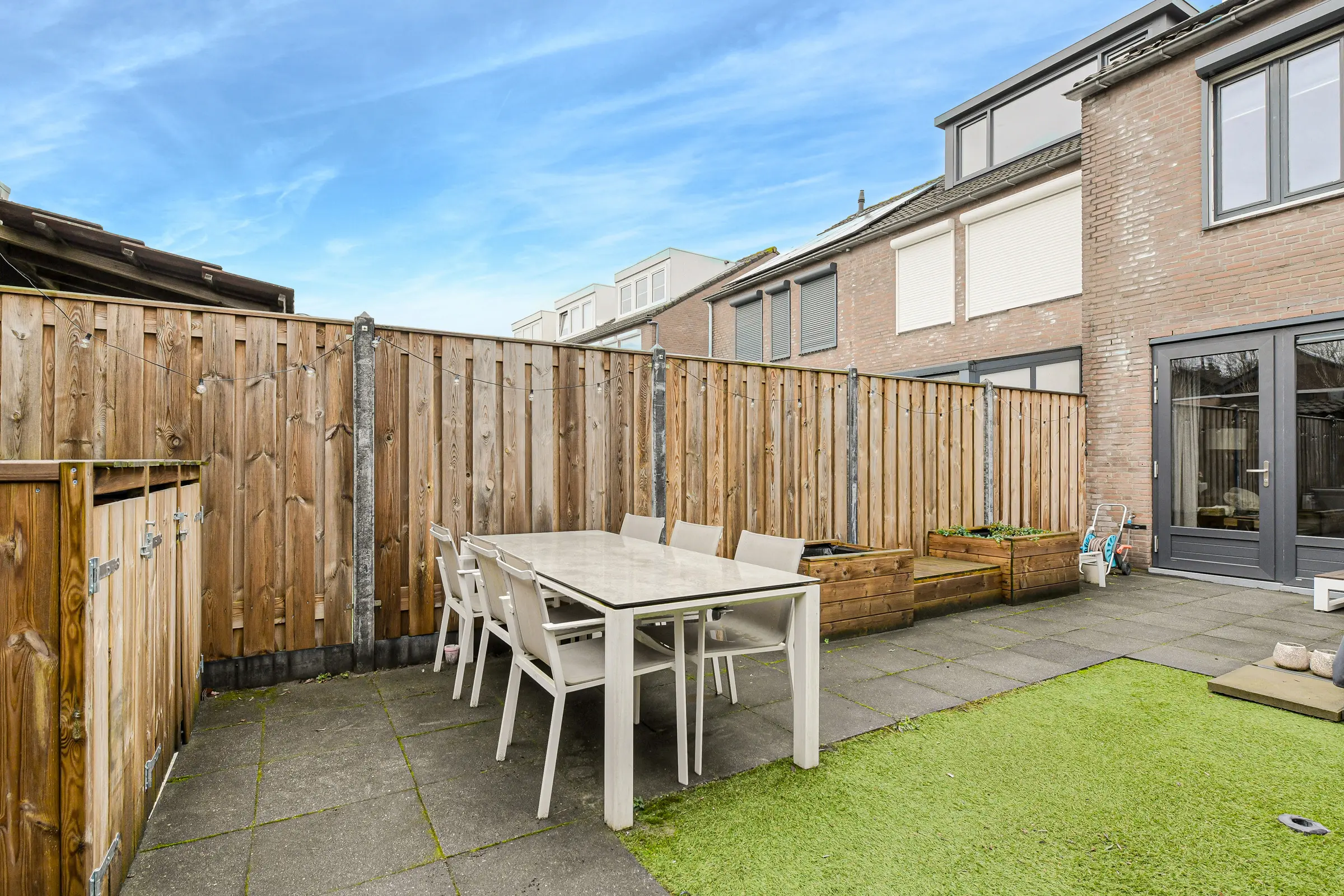 De achtertuin van ca. 13 meter diep, gelegen op het zuiden, is fraai aangelegd en voorzien van sierbestrating en kunstgras. De zonnige tuin heeft 2 terrassen. De erfafscheiding is van hout. In de achtertuin is de de stenen berging met elektriciteit en de carport met een dubbele deur welke uitkomt aan de achterzijde op straat.