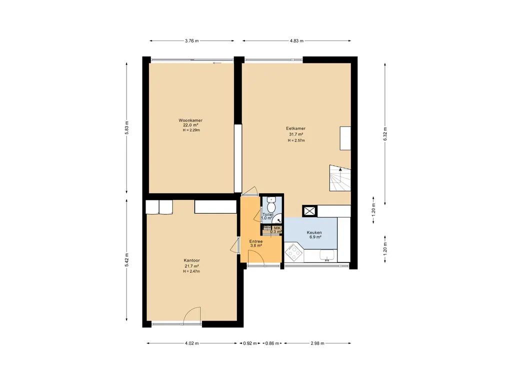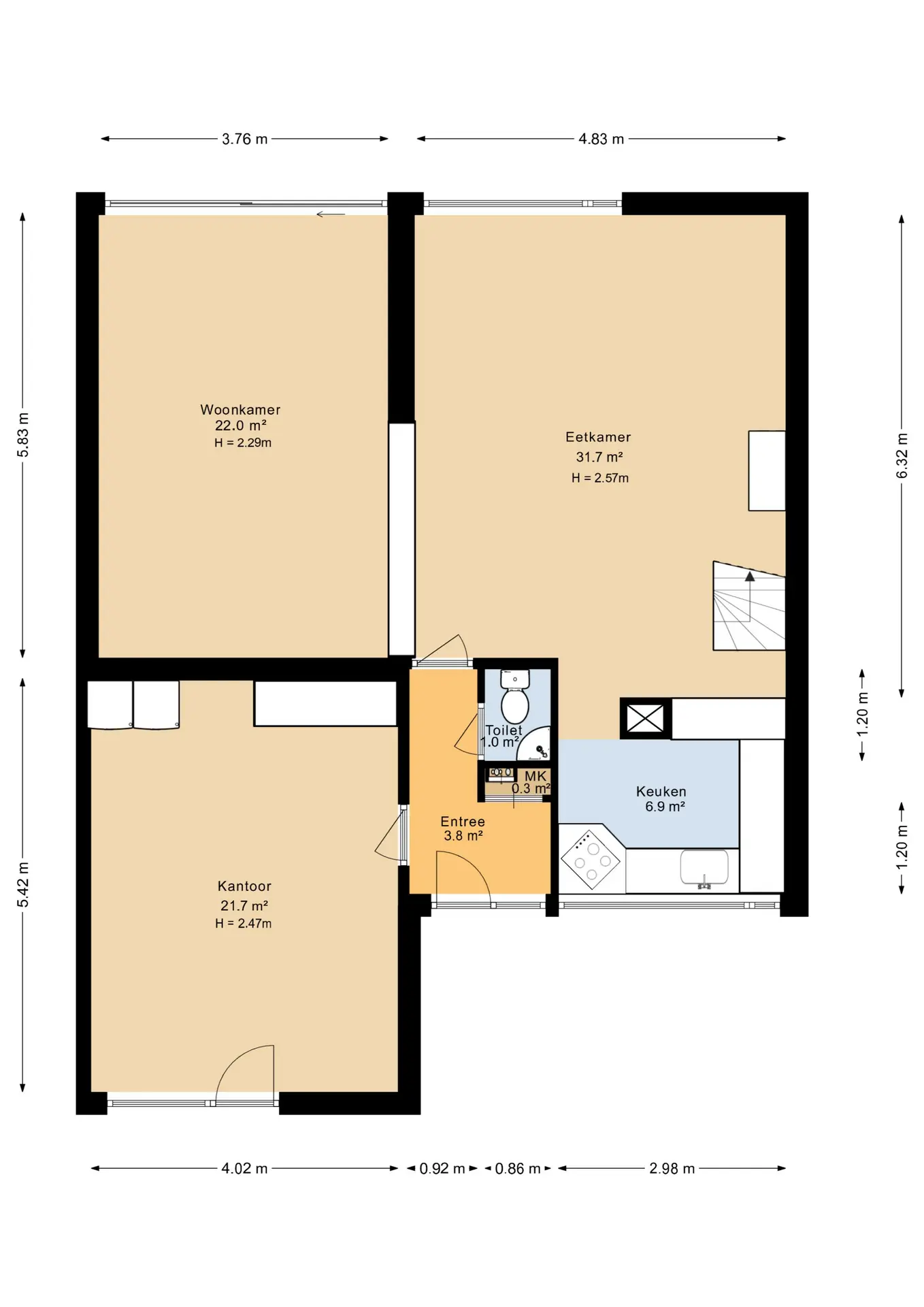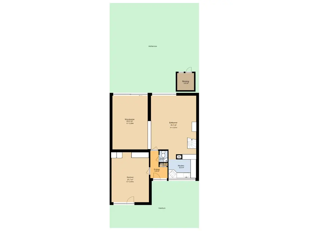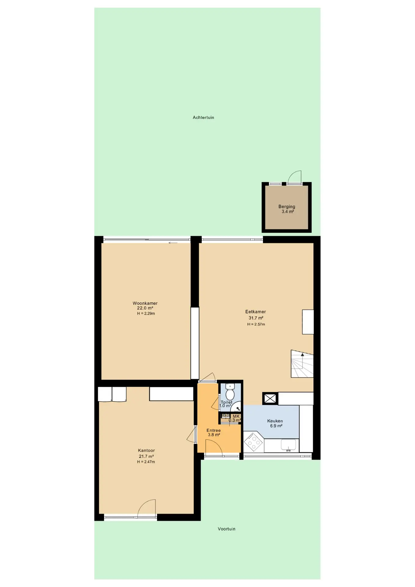 Entree/hal met de meterkast en toilet welke voorzien is van een duoblok en fonteintje. Vanuit de hal is de voormalige garage te bereiken. Deze ruimte is nu geschikt gemaakt als werkplek en/of kantoorruimte. Vanuit de hal is ook de woonkamer te bereiken, deze bestaat uit 2 delen, de zitkamer en de tuinkamer welke een speelse verhoging heeft. De woonkamer is voorzien van een open haard, een kastenwand, een schuifpui en de spiltrap naar de tweede verdieping. De open keuken is aan de voorzijde gelegen, heeft een doorkijk naar de woonkamer en is compleet ingericht met een U-vormige inrichting. Deze is voorzien van 1 1/2 spoelbak, inductie kookplaat, vaatwasmachine en een RVS afzuigkap.