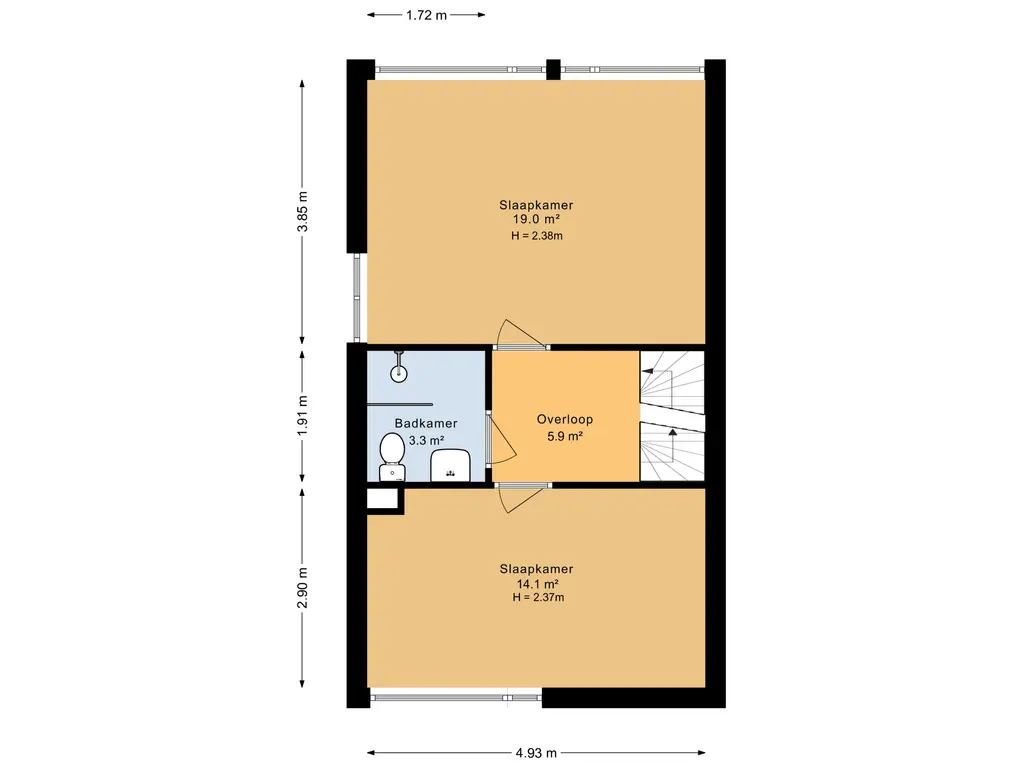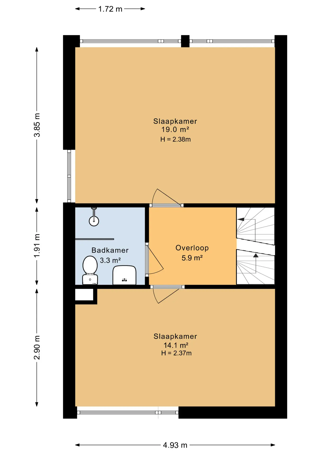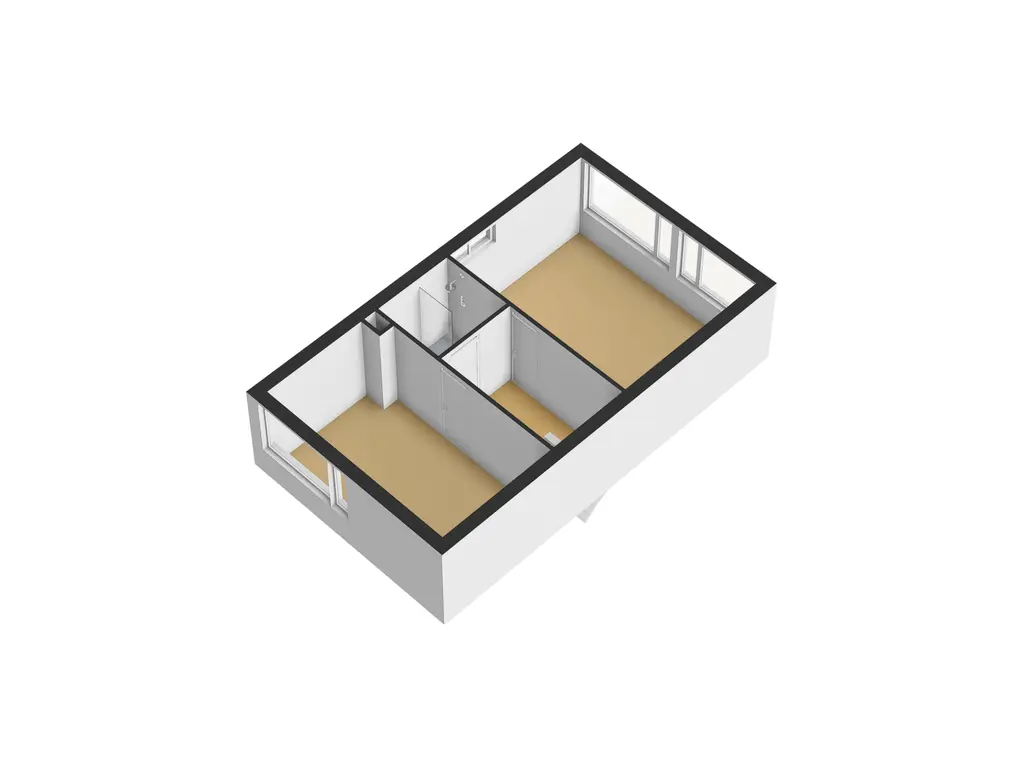 Overloop met vaste trap naar de tweede verdieping; slaapkamer voorzijde; slaapkamer achterzijde (voorheen 2 slaapkamers) met een vaste kastenwand en mogelijkheid voor een wastafel; badkamer voorzien van een inloopdouche, toilet en een wastafel.