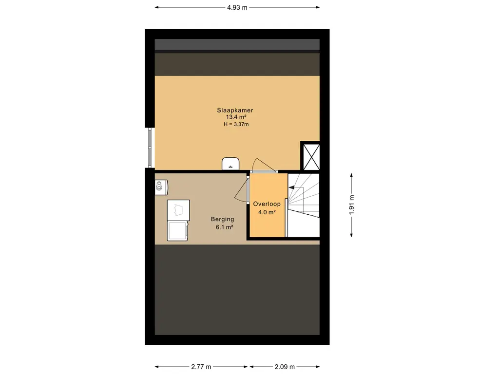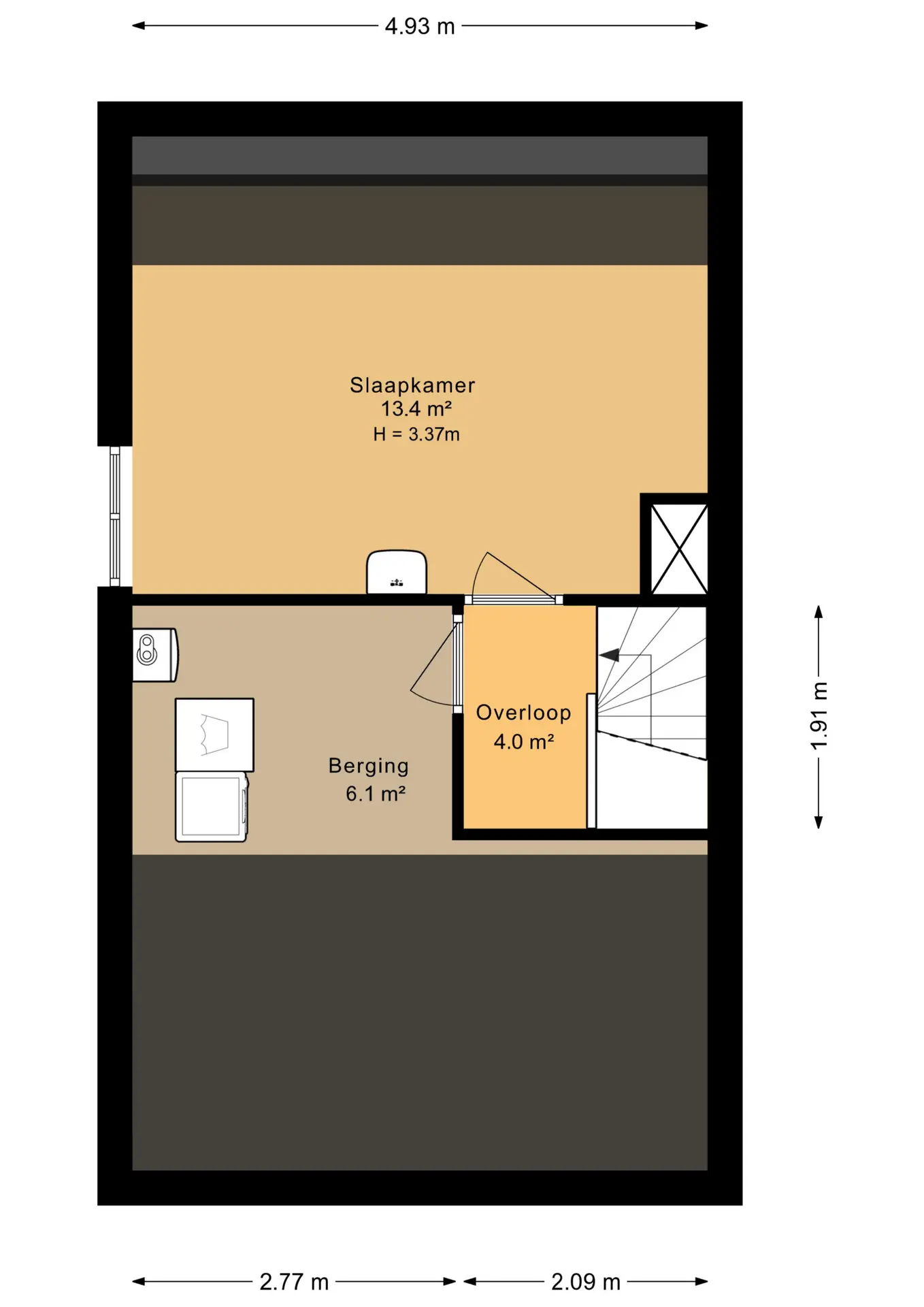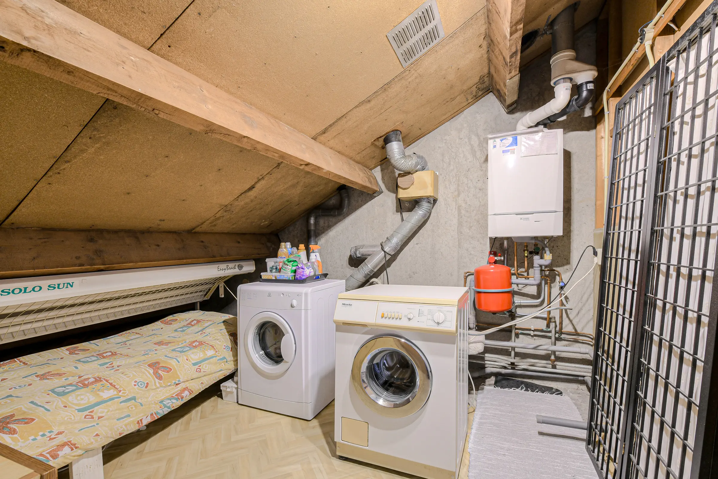 Overloop met toegang naar de stookruimte/berging met plaats van de HR combiketel, Remeha 2014 en de wasmachine aansluiting; slaapkamer met gevelraam en wastafel met koud en warmwater aansluiting.