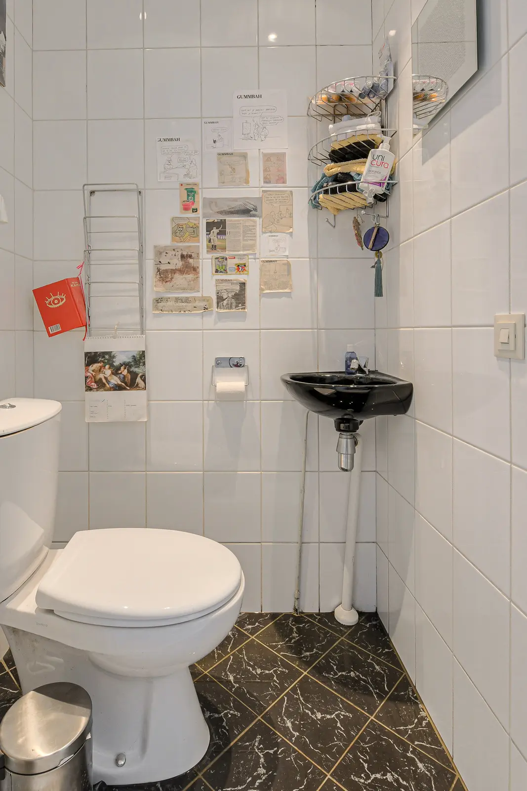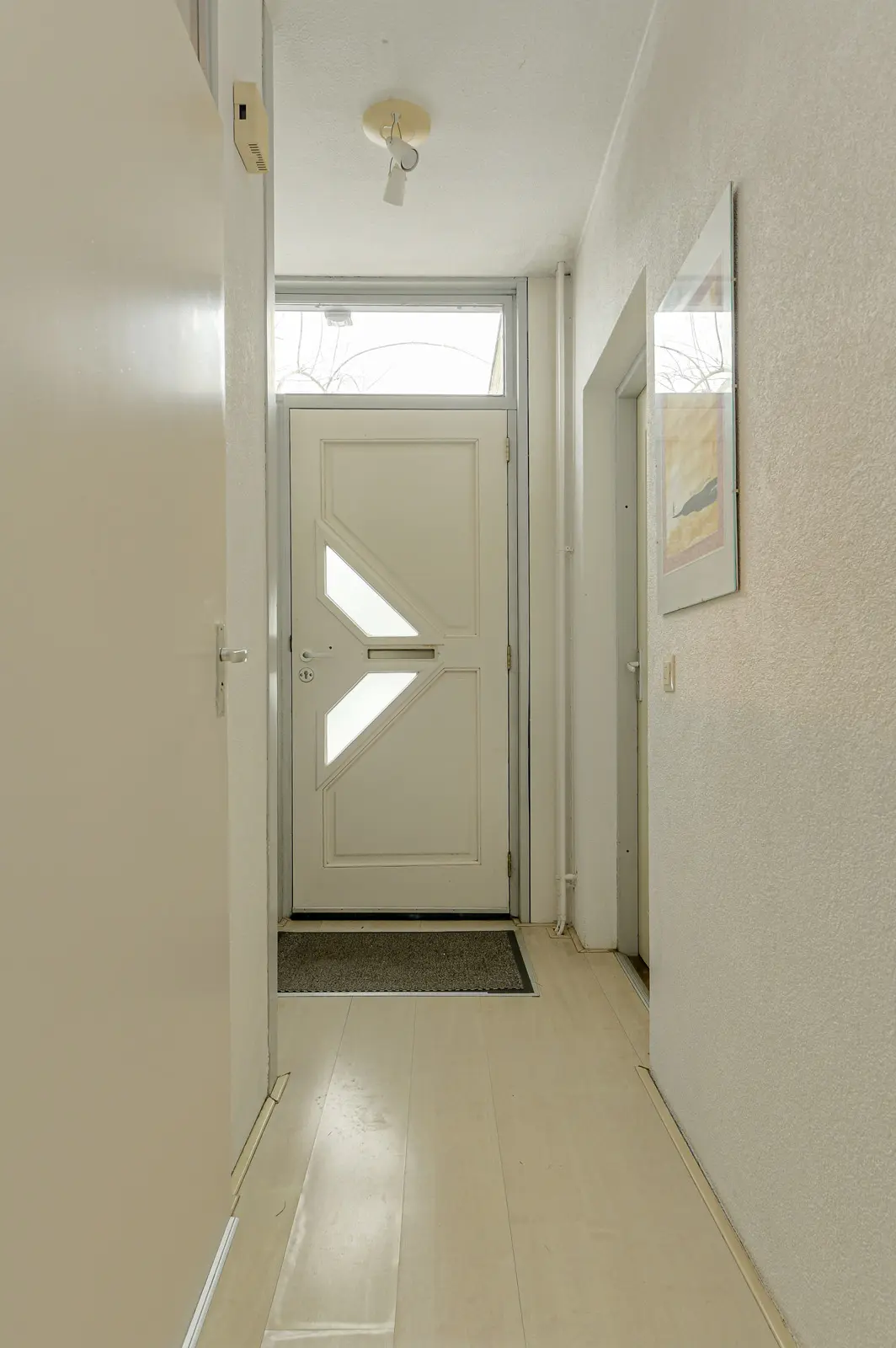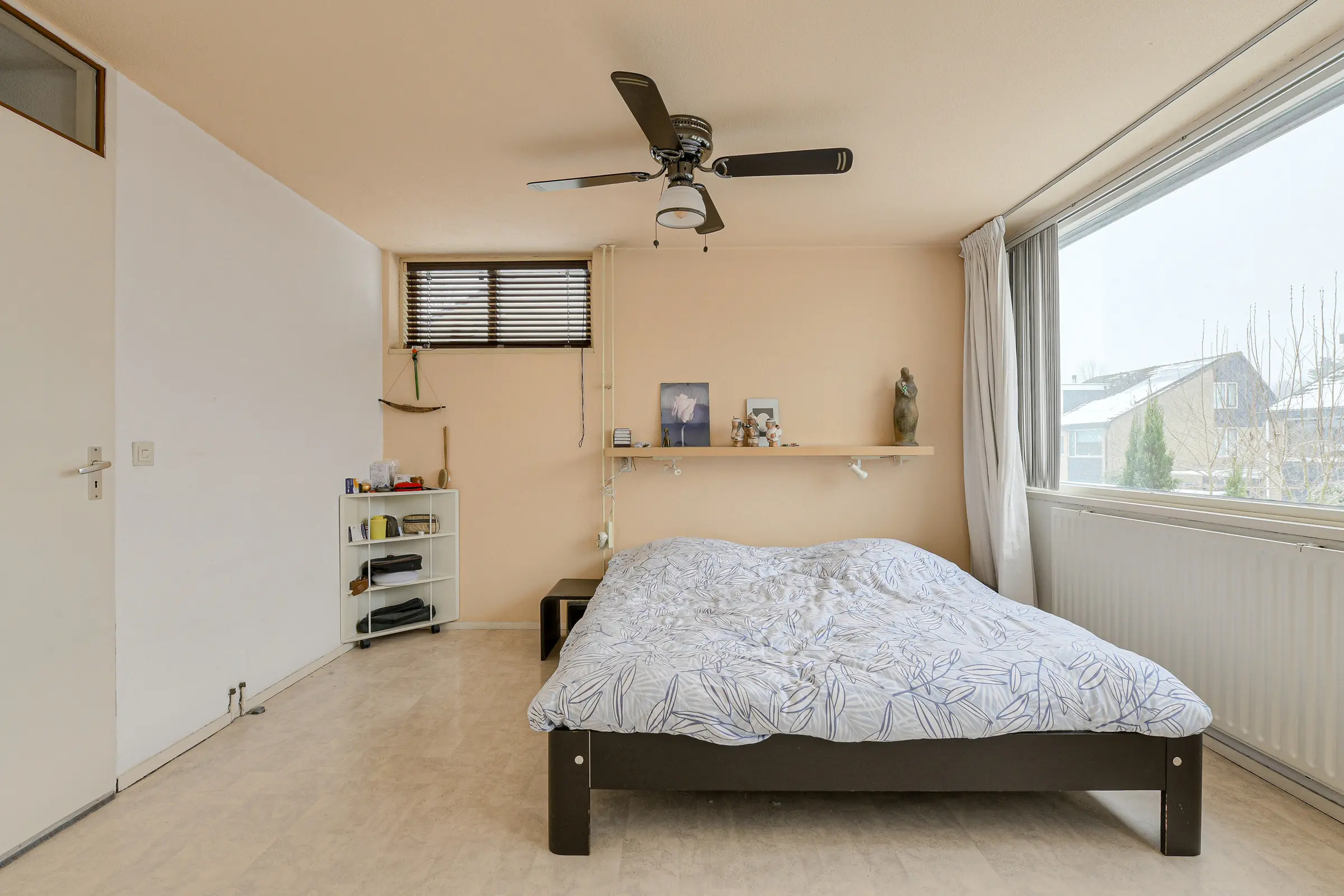 Overloop met toegang naar de stookruimte/berging met plaats van de HR combiketel, Remeha 2014 en de wasmachine aansluiting; slaapkamer met gevelraam en wastafel met koud en warmwater aansluiting.