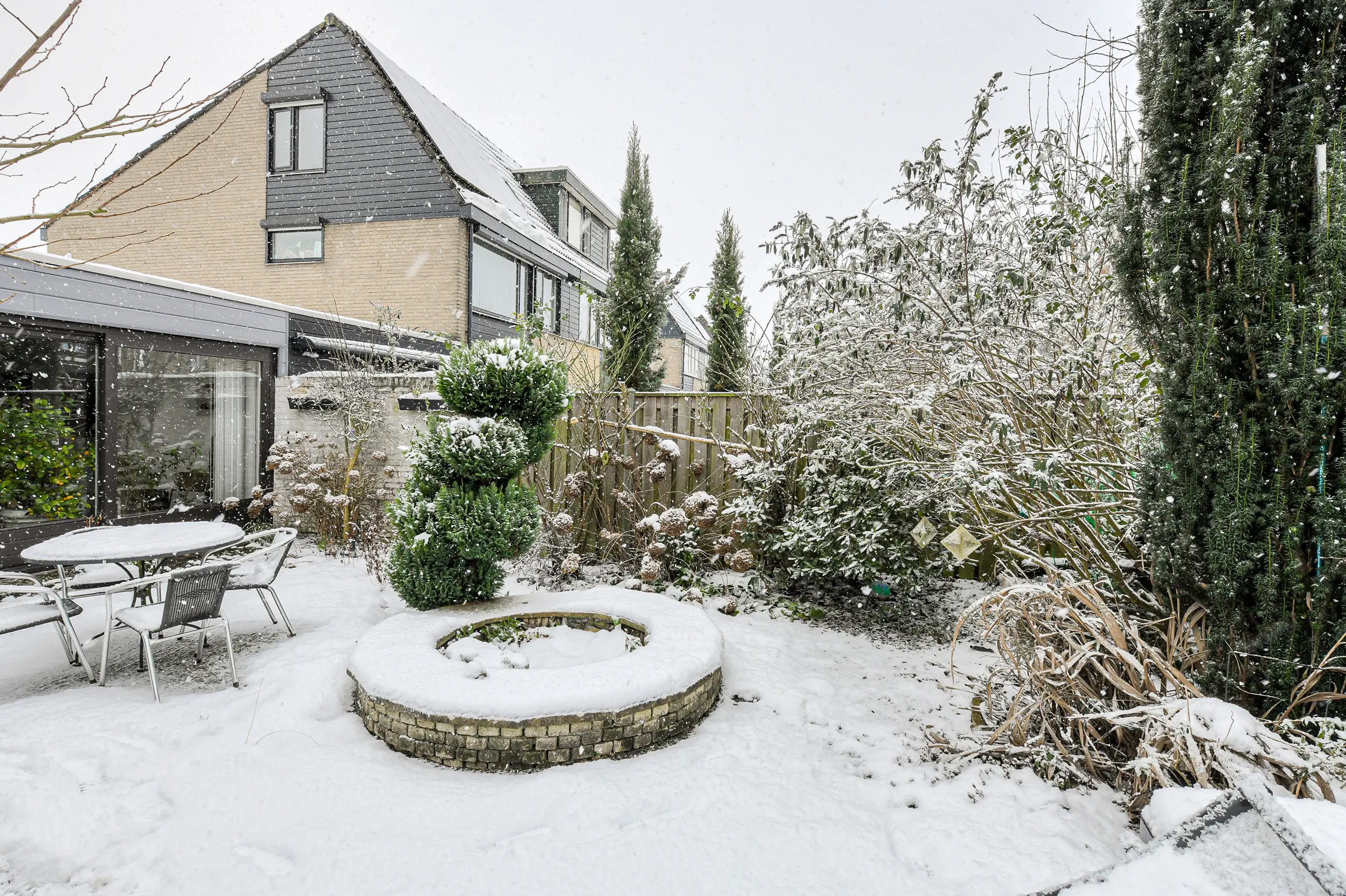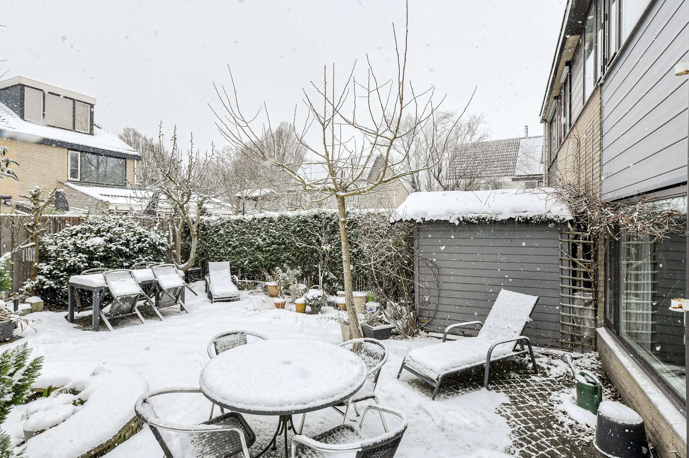 De achtertuin is 10 meter diep, 9,5 meter breed en ligt op het westen. De achtertuin biedt veel privacy en is voorzien van twee terrassen, borders met vaste beplanting en een tuinhuisje. De erfafscheiding is van hout.