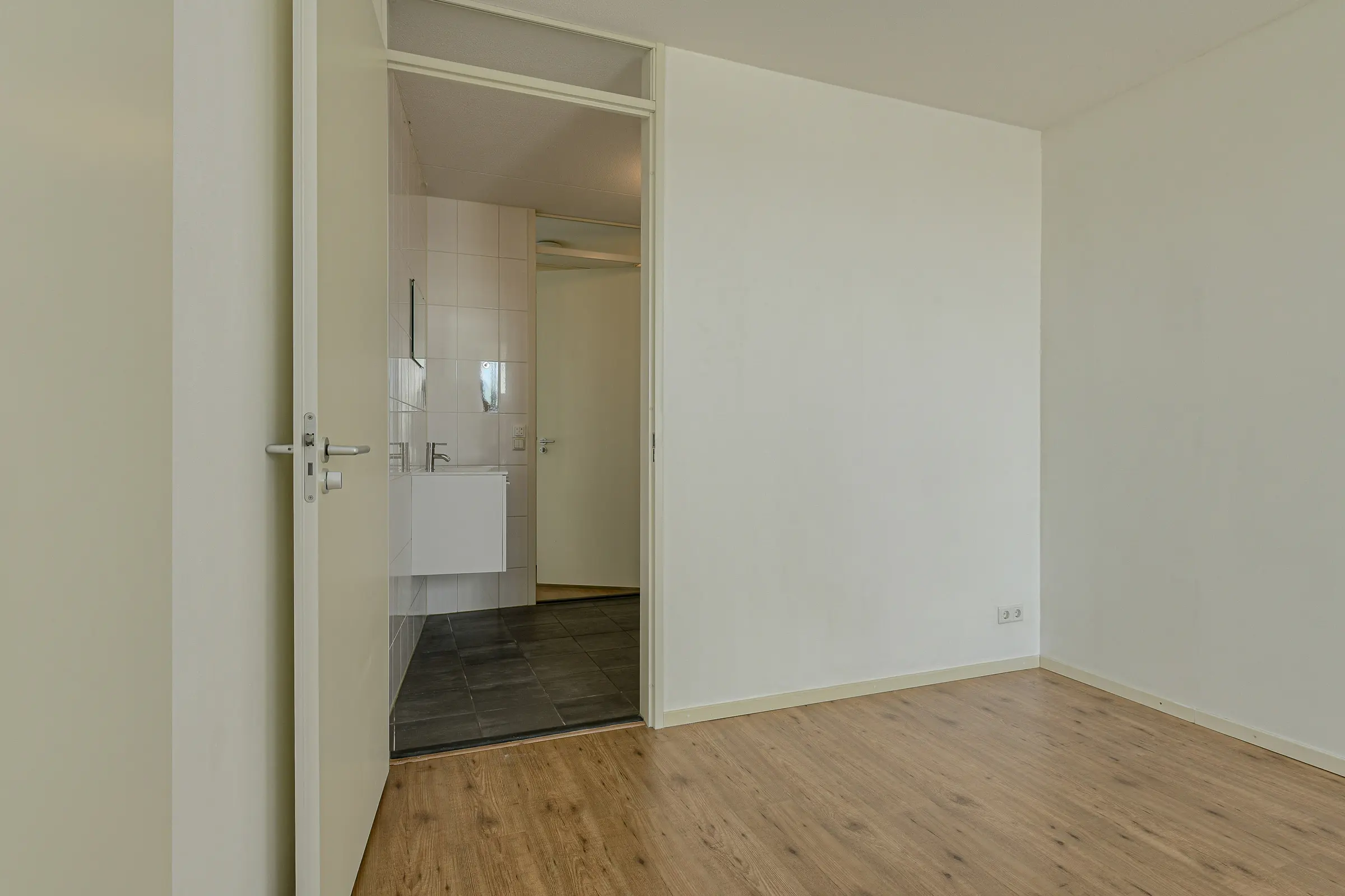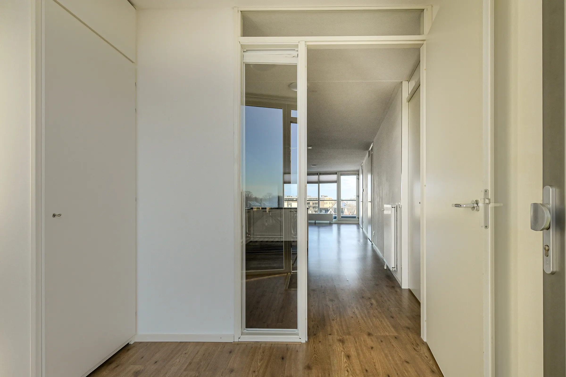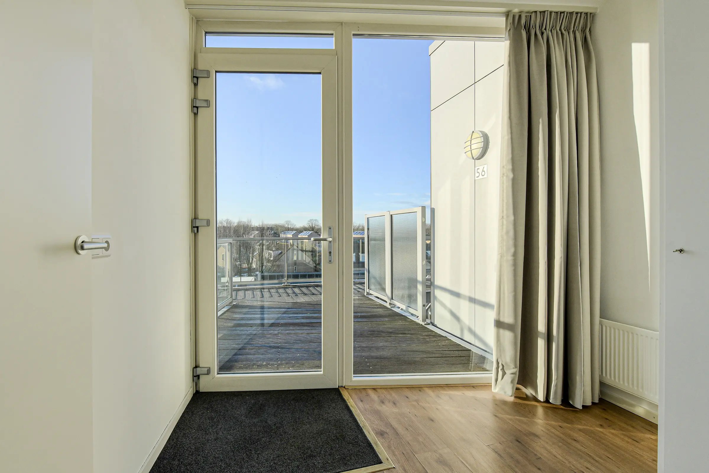 Vanuit de kamer toegang tot hal met t.t. de berging/wasruimte met opstelplaats voor de C.V. ketel, de aansluitpunten ten behoeve van de wasmachine en wasdroger en mechanische ventilatie-unit. Vanuit de hal t.t. toiletruimte v.v. zwevend toilet, fonteintje. en badkamer. Vanuit de woonkamer toegang tot de slaapkamer II (ca. 6.7 m2) , vanuit keuken t.t. slaapkamer I (ca. 18,3 m2); Vanuit slaapkamer 1 t.t. de badkamer. Vanuit slaapkamer II toegang tot balkon.