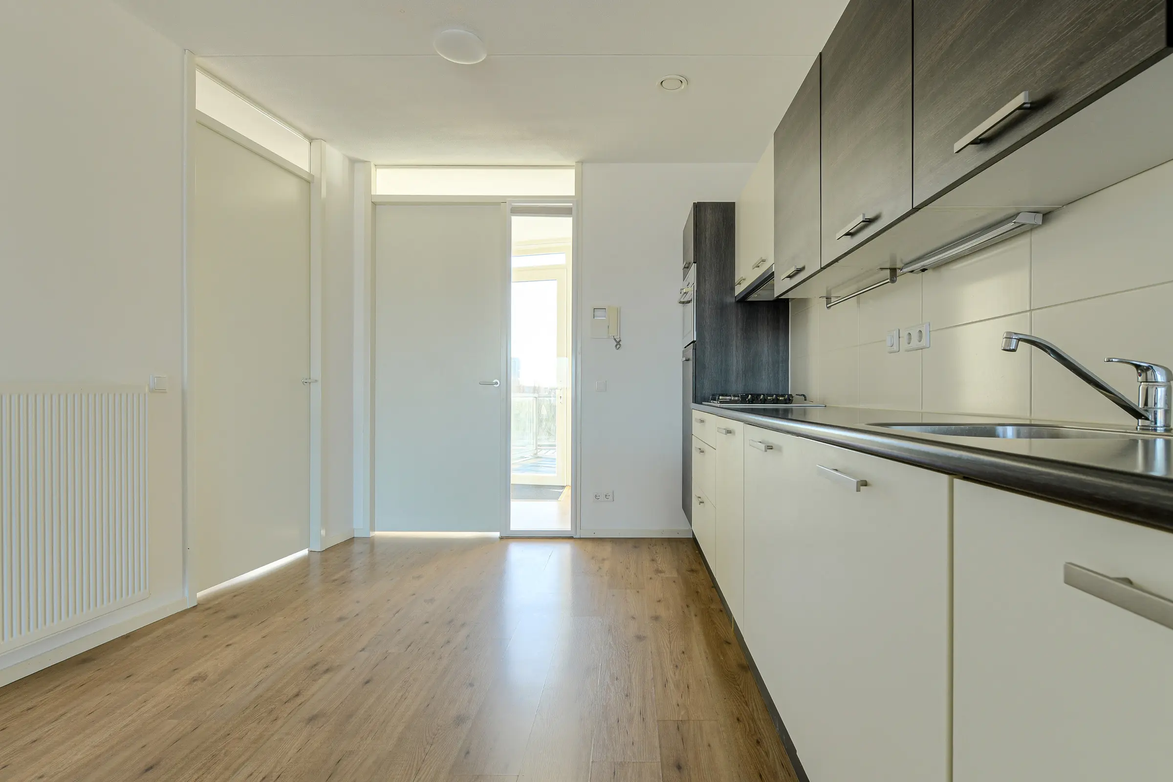Hal/entree met videofoon/intercom en toegang tot de riante woonkamer en half open keukenruimte (totaal ca. 45m²) voorzien van grote raampartijen en toegang tot het terras. De keuken heeft een recht keukenblok v.v. boven- en onderkastjes, koelkast, afzuigkap (vlakscherm), gaskookplaat, combimagnetron, vaatwasser.