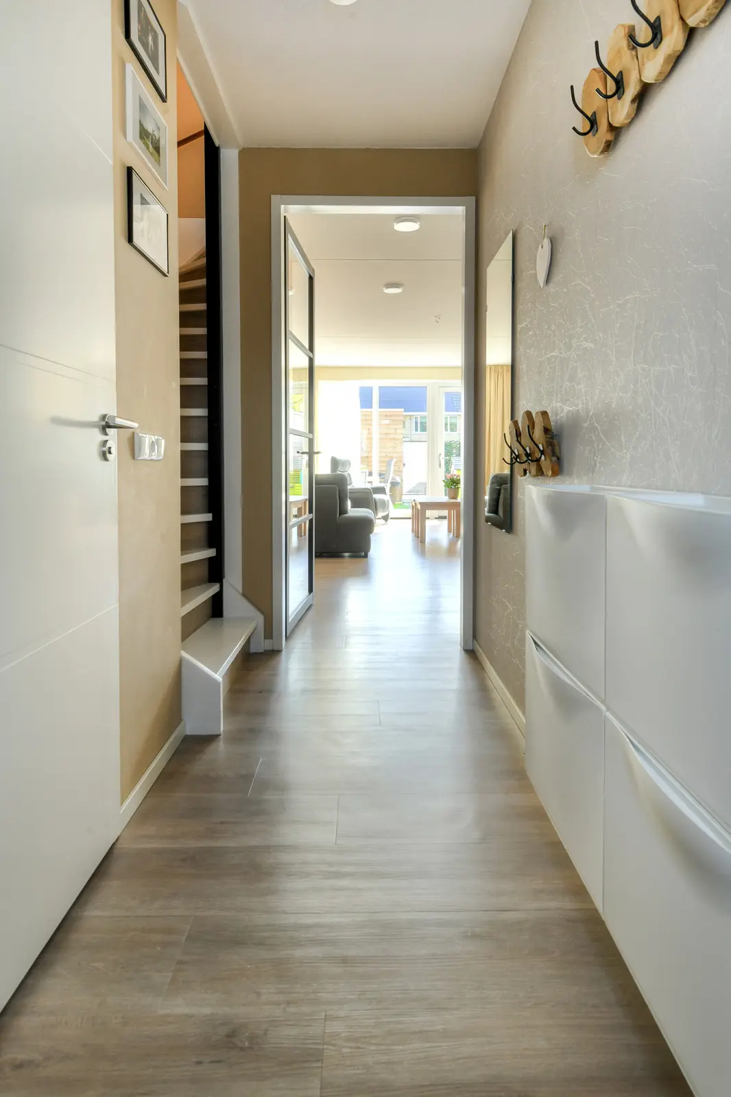 Via de nette entree heeft u toegang tot de meterkast, modern toilet met fonteintje, trapopgang en woonkamer. Door de industriële woonkamerdeur komt u uit in de ruime en volledig uitgebouwde (2,4 meter) woonkamer voorzien van een hoogwaardige pvc-vloer, vloerverwarming en een grote raampartij aan de tuinzijde van de woning. Vanuit de woonkamer is aansluitend de luxe en ruim uitgevoerde hoekkeuken met een losse kast met inbouwapparatuur te vinden, welke van alle gemakken voorzien is. Een extra voorraadkast is voorzien onder de trapopgang.