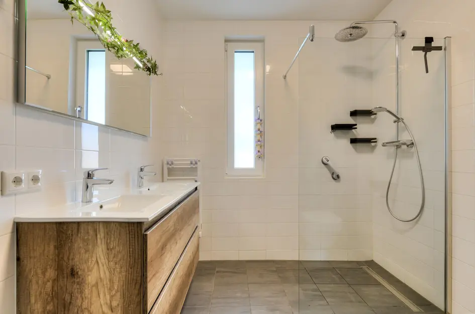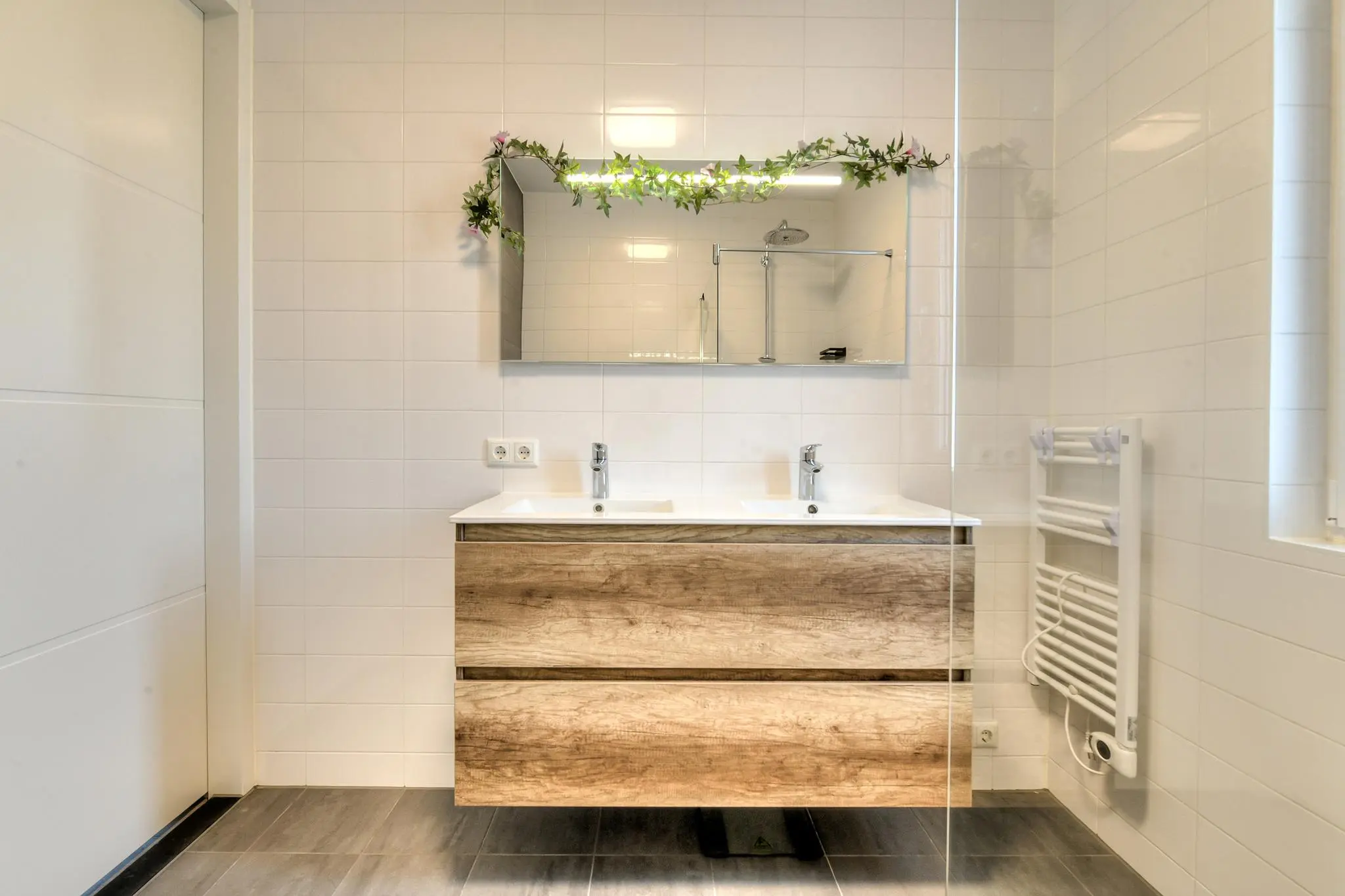 Hier bevinden zich drie ruime slaapkamers en een luxe afgewerkte badkamer met inloopdouche, tweede toilet, dubbele wastafel met meubel, elektrische bijverwarming en zowel mechanische als natuurlijke ventilatie. Daarnaast hangt er een grote spiegel met verlichting en spiegelverwarming, waardoor een beslagen spiegel na het douchen verleden tijd is.