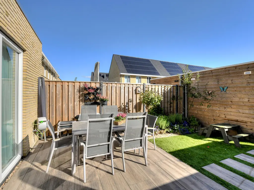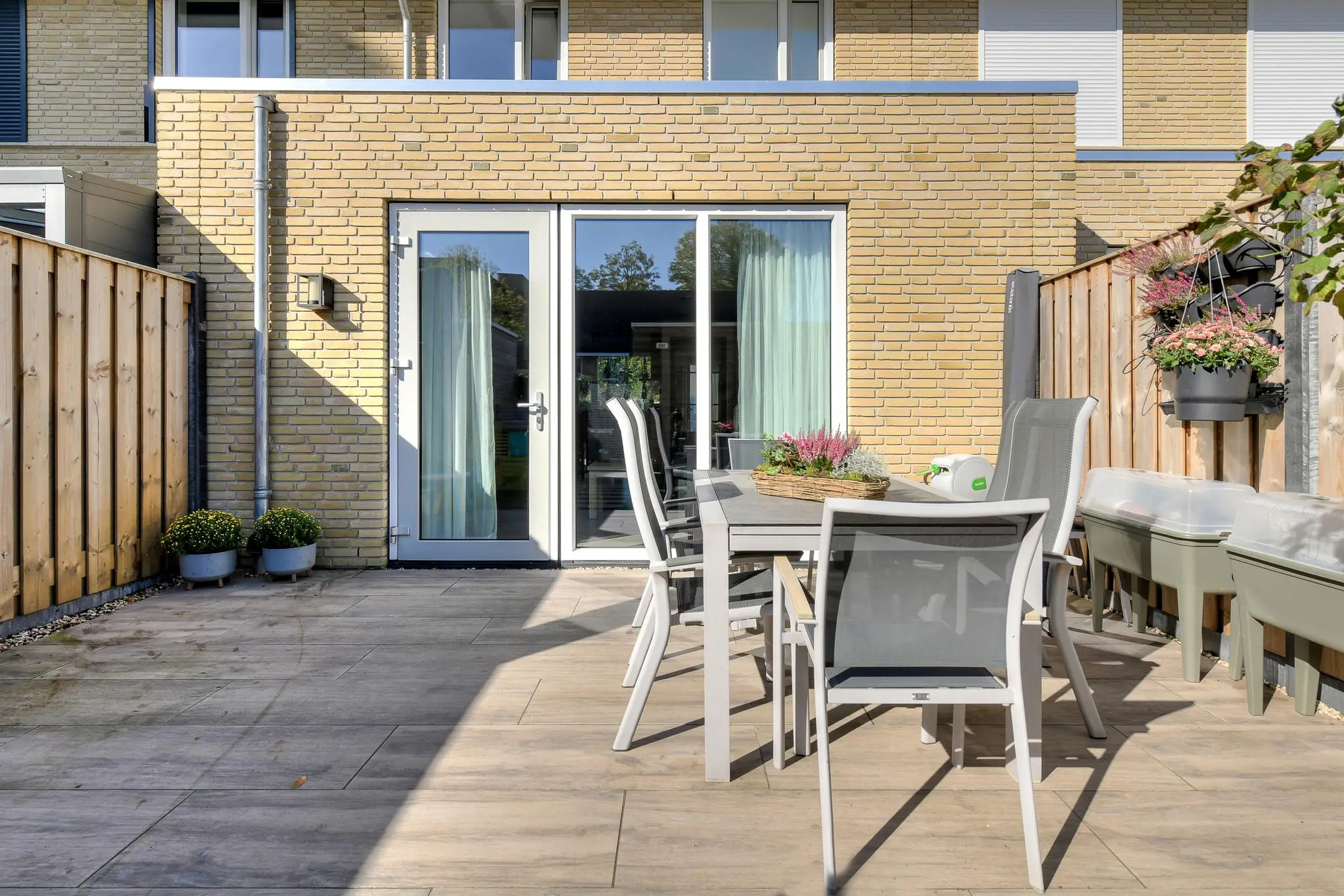 De achtertuin is gelegen op het Oosten, is klimaatvriendelijk ontworpen, bestrating is uitgevoerd in keramische tegels met houtlook wat het natuurlijk karakter vergroot en beschikt over een vrijstaande houten berging, v.v. elektra. Via de achterom bereikt u de eigen parkeerplaats van de woning geschikt voor één auto.