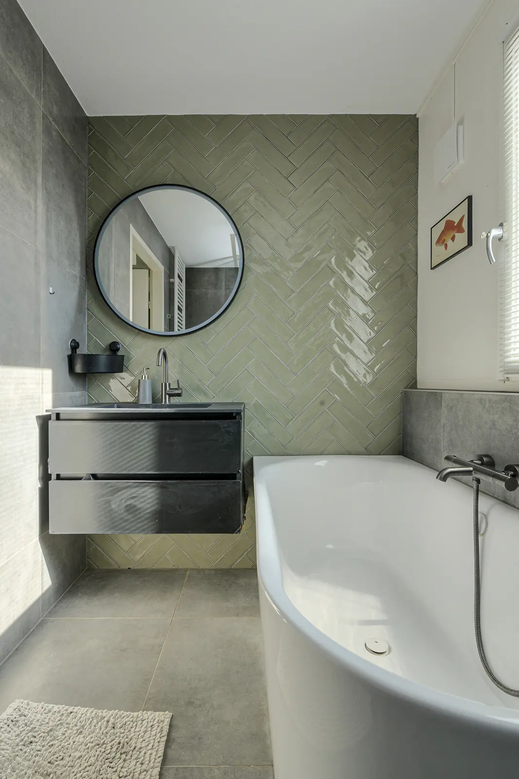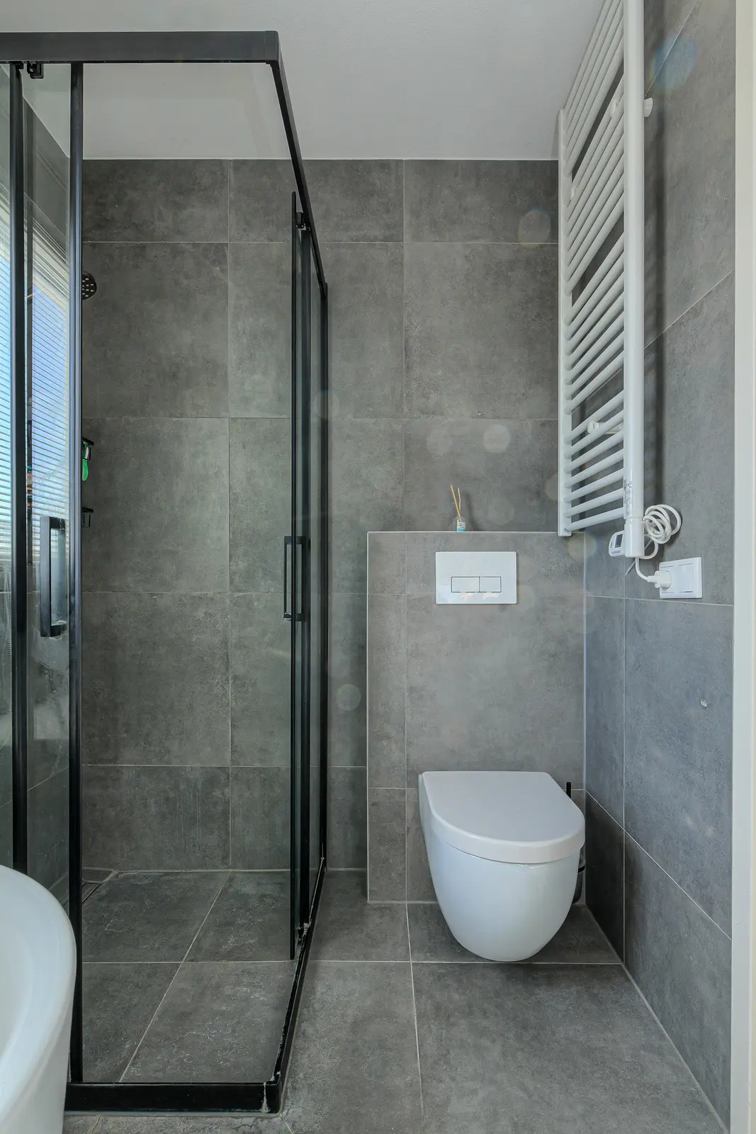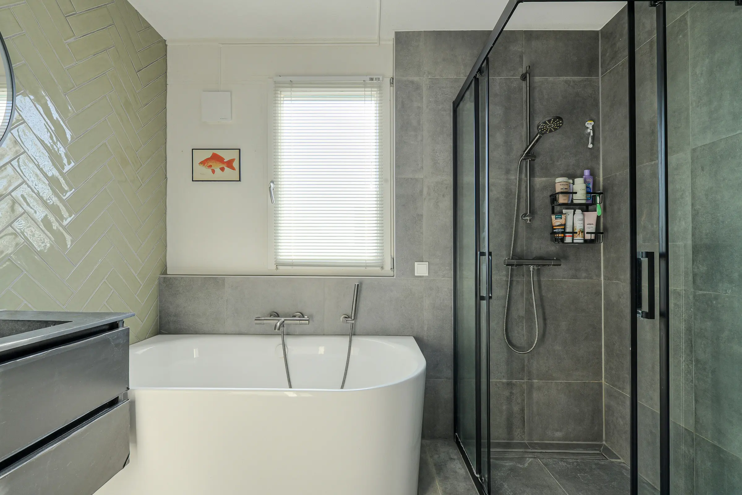 Ruime, complete badkamer met ligbad en inloopdouche, praktisch badmeubel met wastafel, toilet en centrale afzuiging.