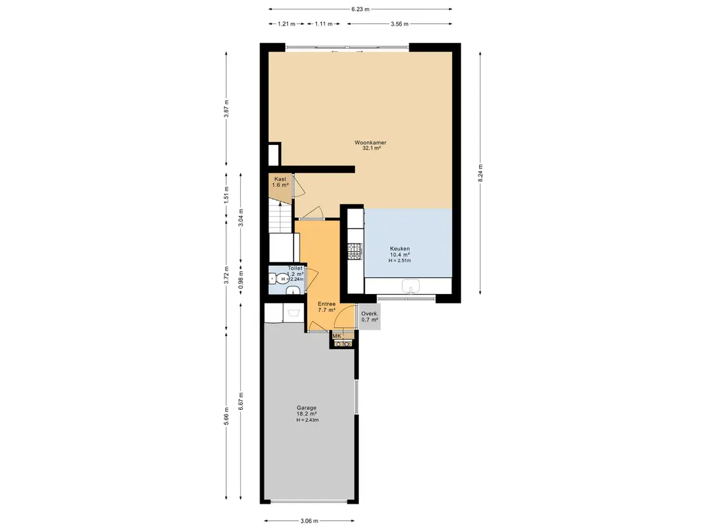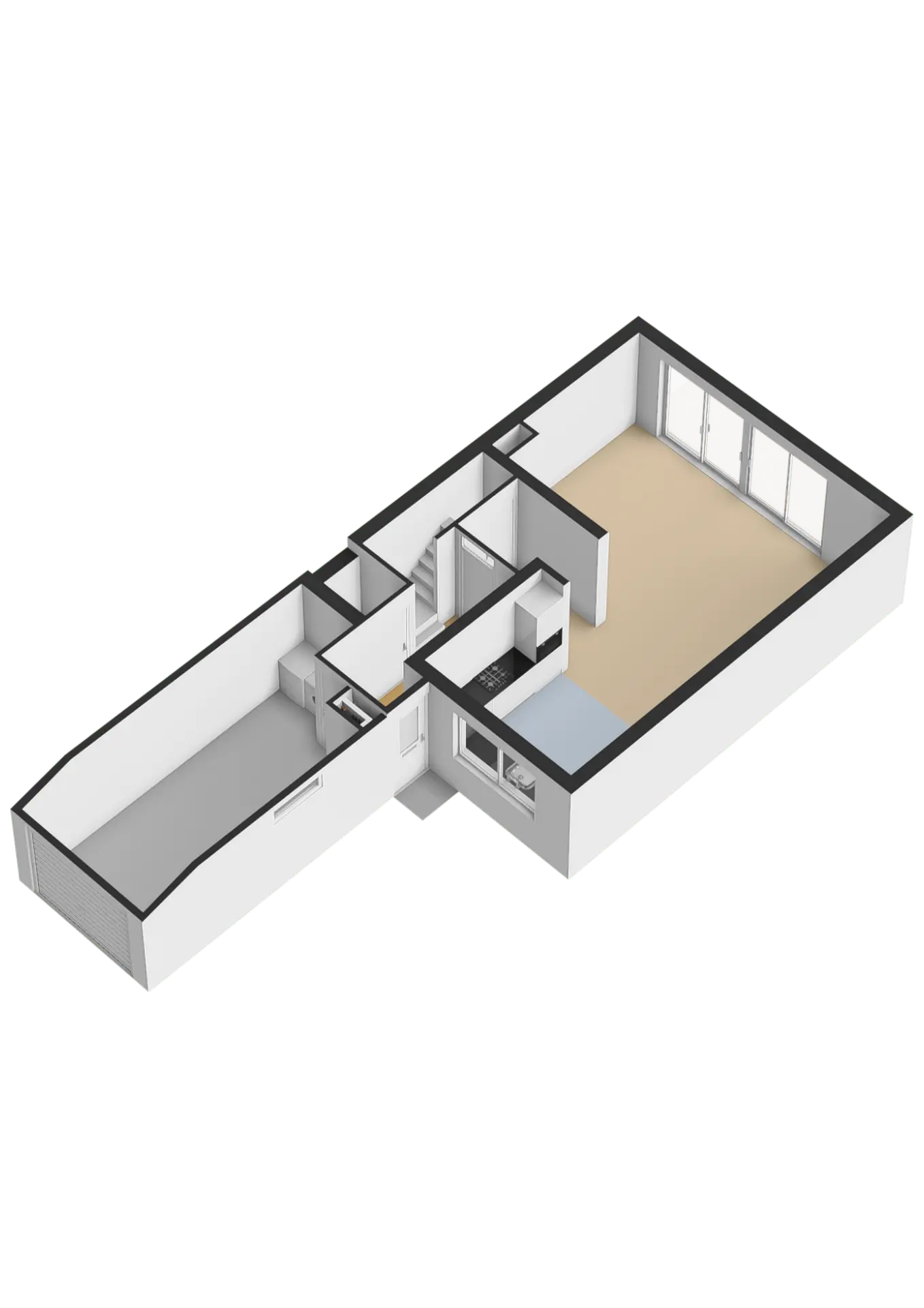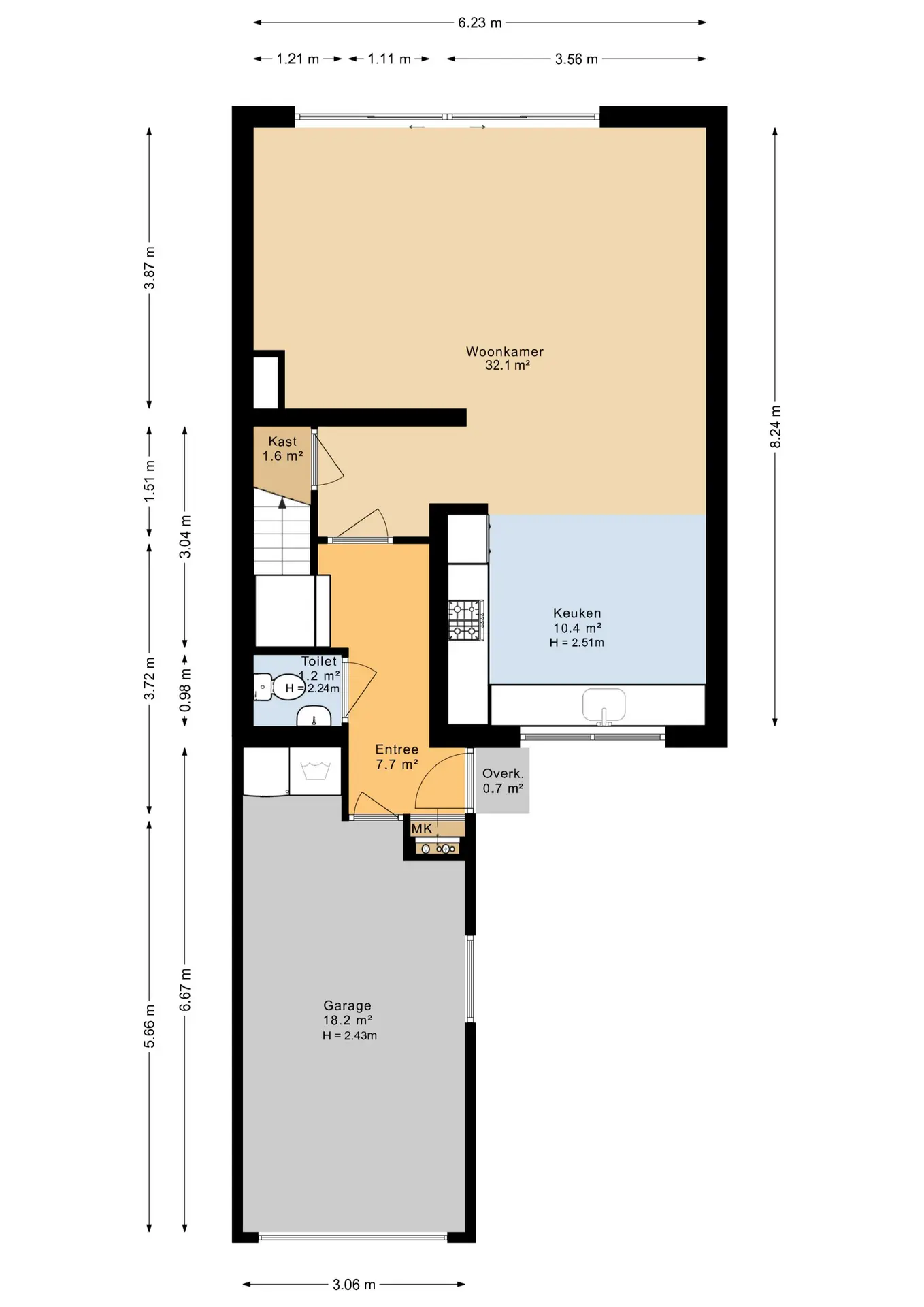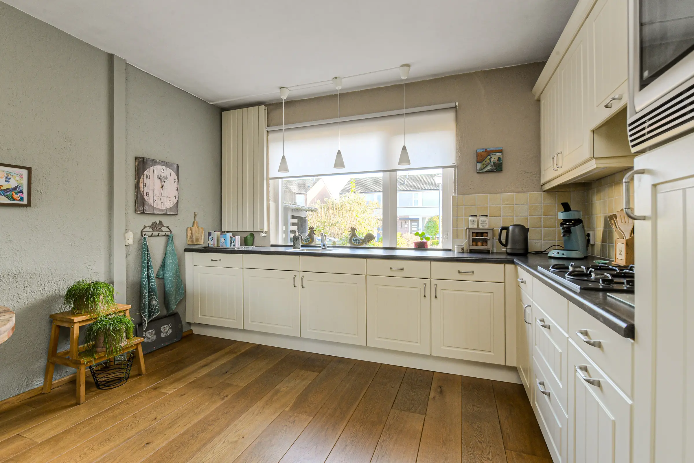 Entree/hal met meterkast, toegang naar de garage en trapopgang naar de eerste verdieping; aanpandige garage aan de voorzijde met de wasmachine aansluiting; toilet met fonteintje; ruime woonkamer met trapkast, open haard en schuifpui naar de achtertuin; open keuken aan de voorzijde van de woning, deze is voorzien van een L-vormige inrichting en diverse apparatuur: koelkast, combimagnetron; 4 pits gaskookplaat, afzuigkap en vaatwasmachine.