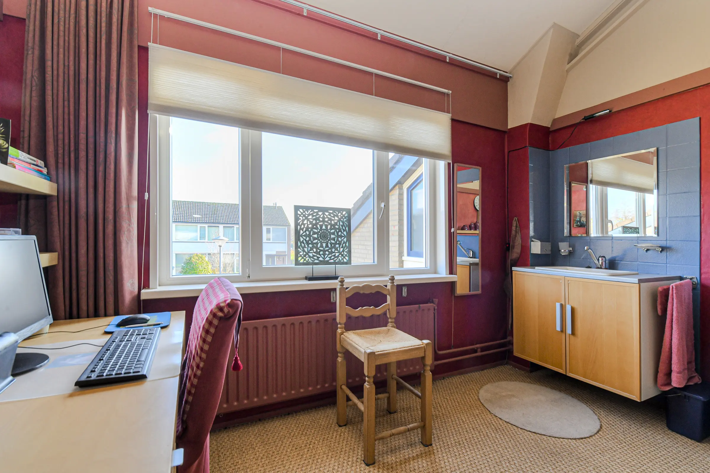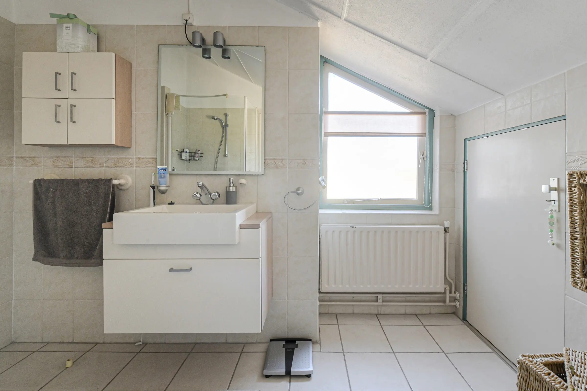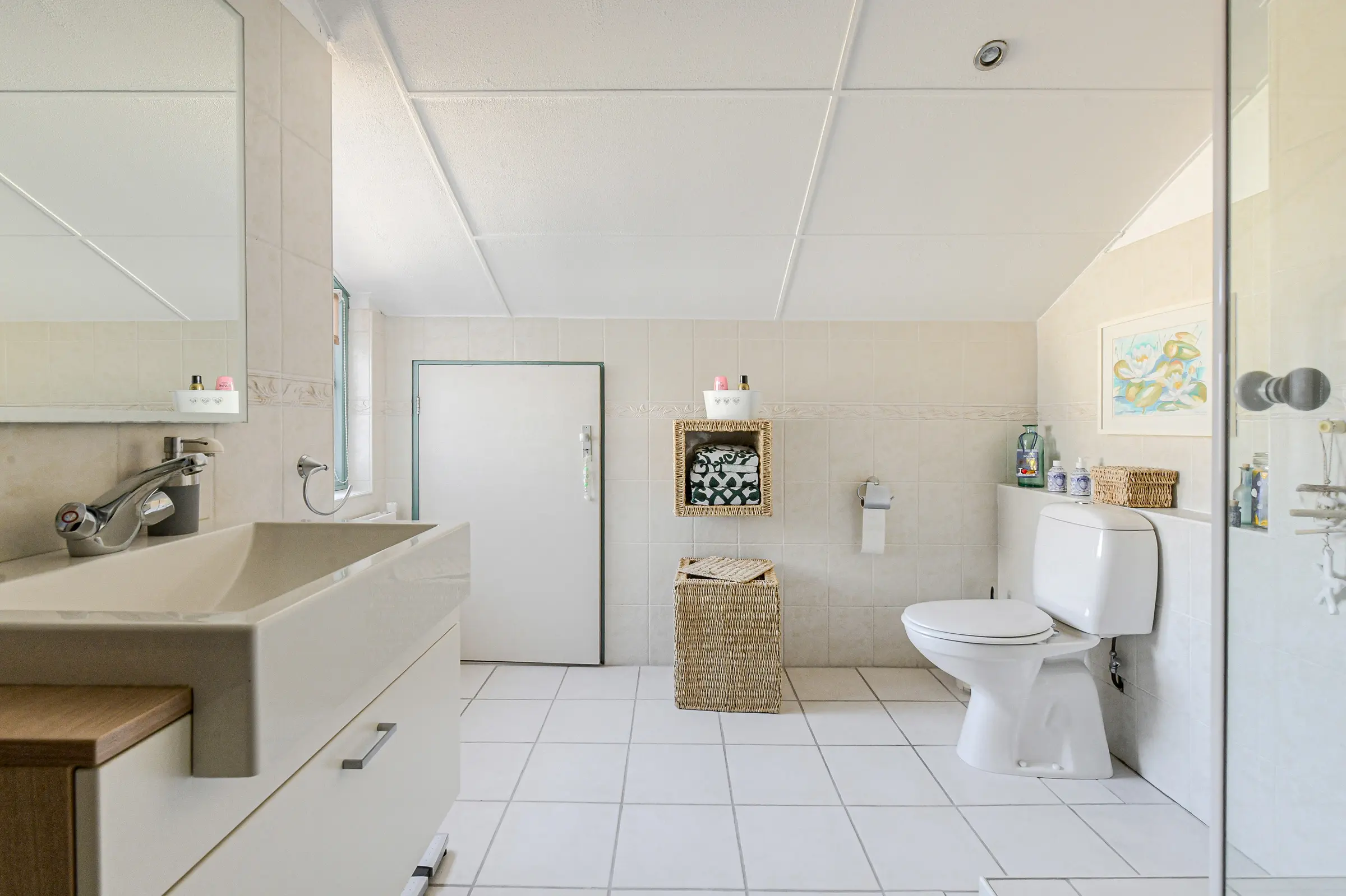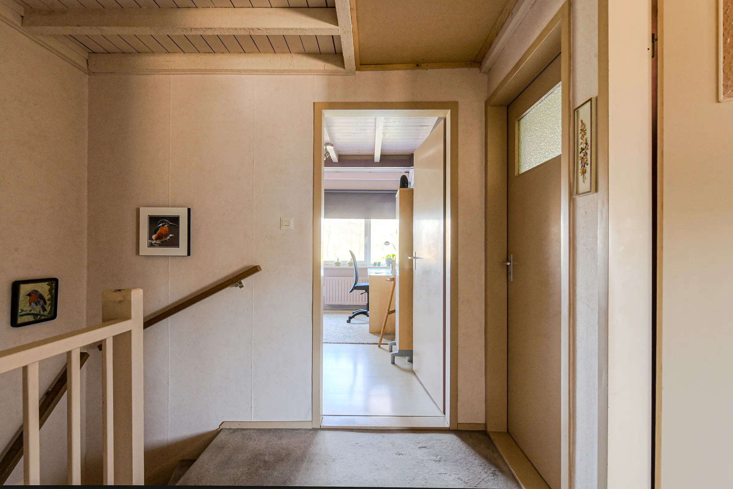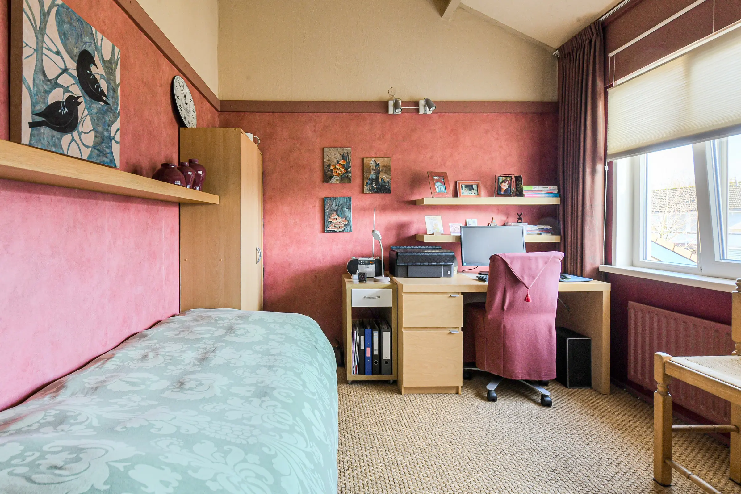 Overloop met een luik naar de bergzolder; slaapkamer achterzijde welke is voorzien van een laminaatvloer en bergzolder; slaapkamer achterzijde met een kunststof schuifpui en bergzolder; slaapkamer voorzijde; badkamer aan de voorzijde is voorzien van een douchecabine, toilet en een wastafel. Er is toegang naar de bergzolder boven de garage, hier is de plaats van de HR combiketel, Nefit 1996.