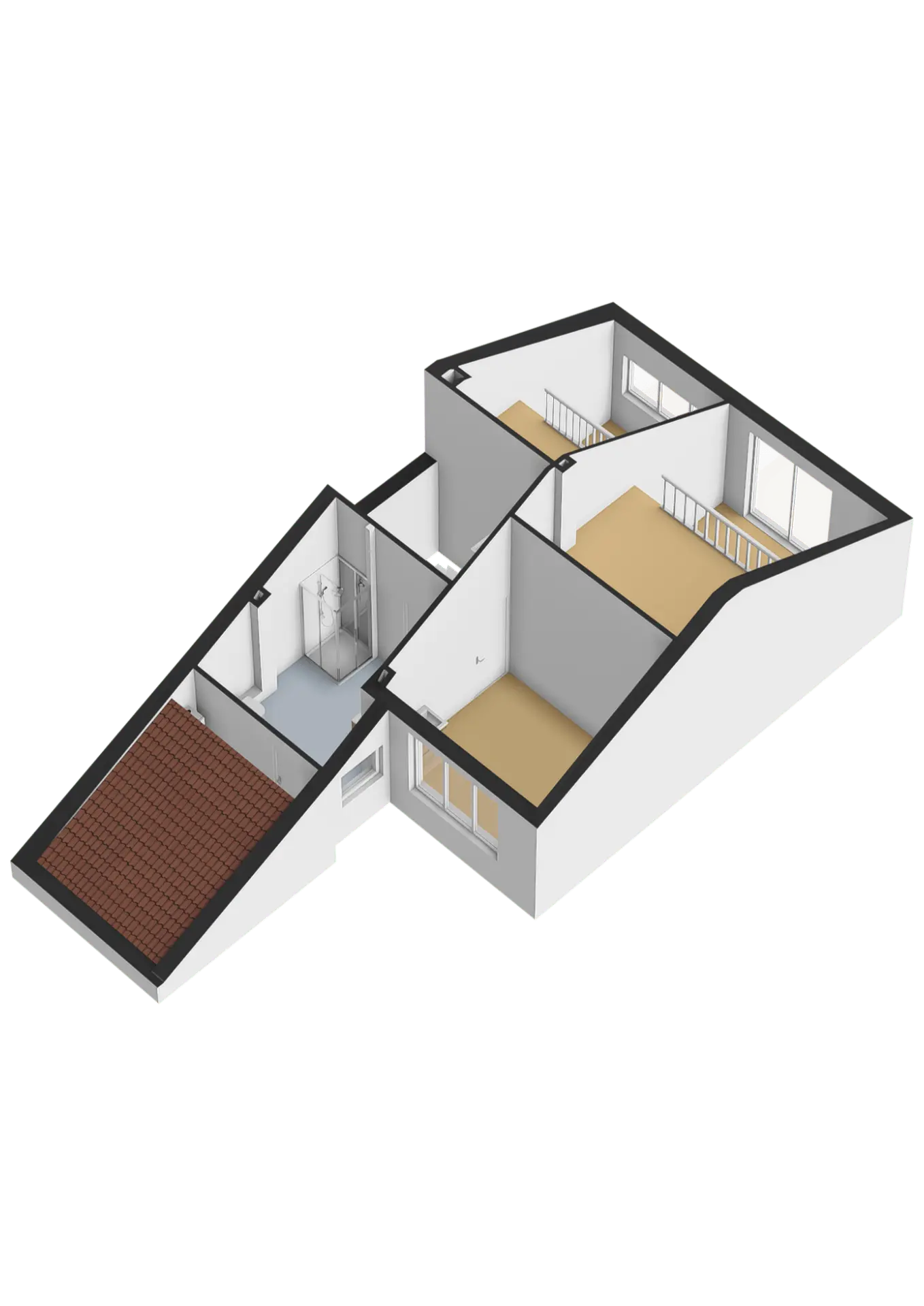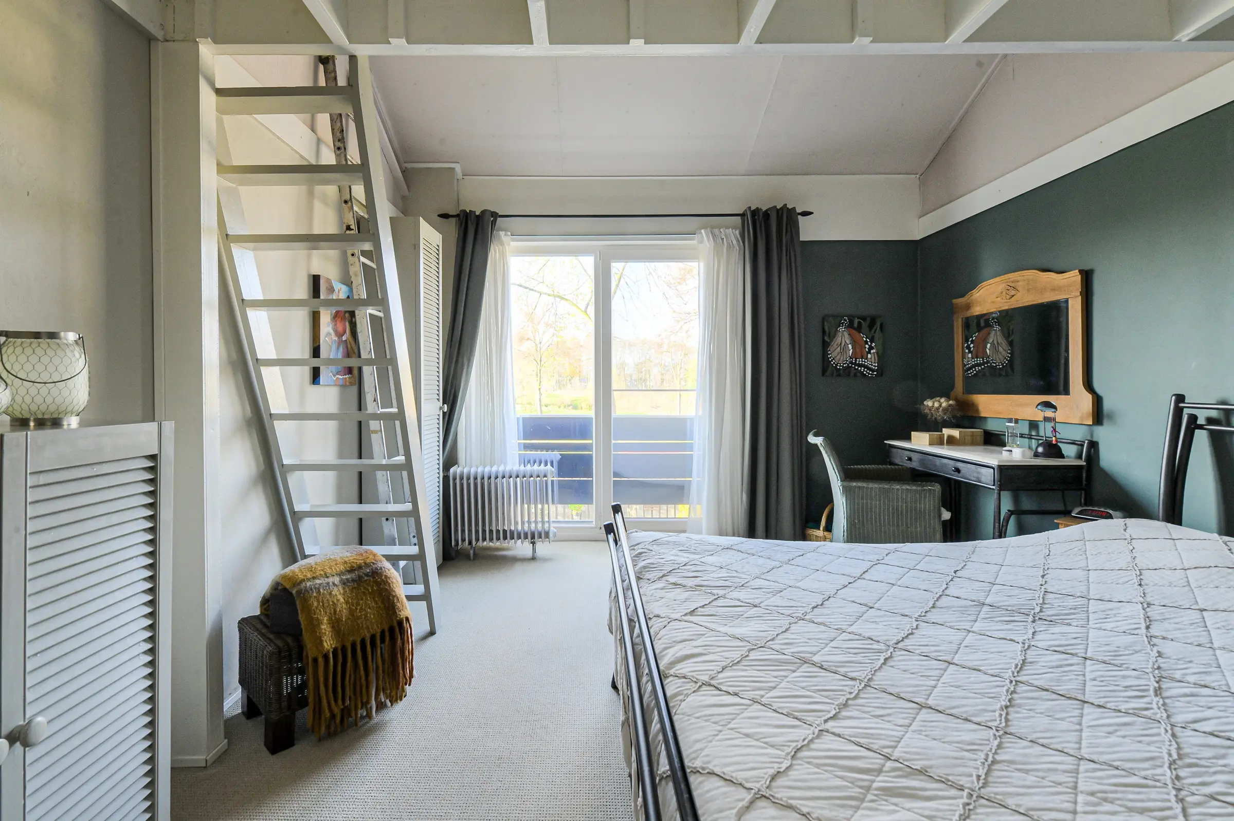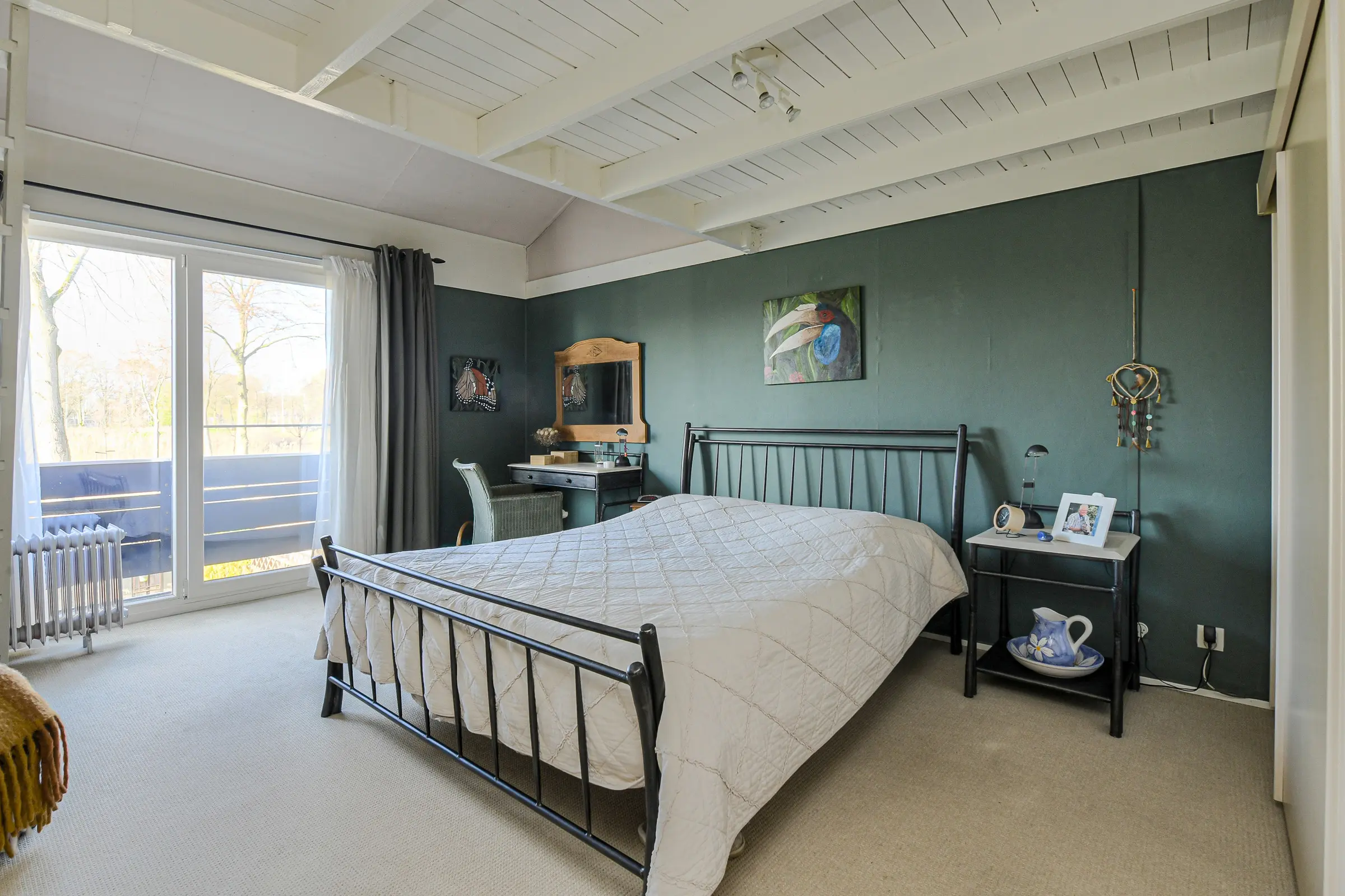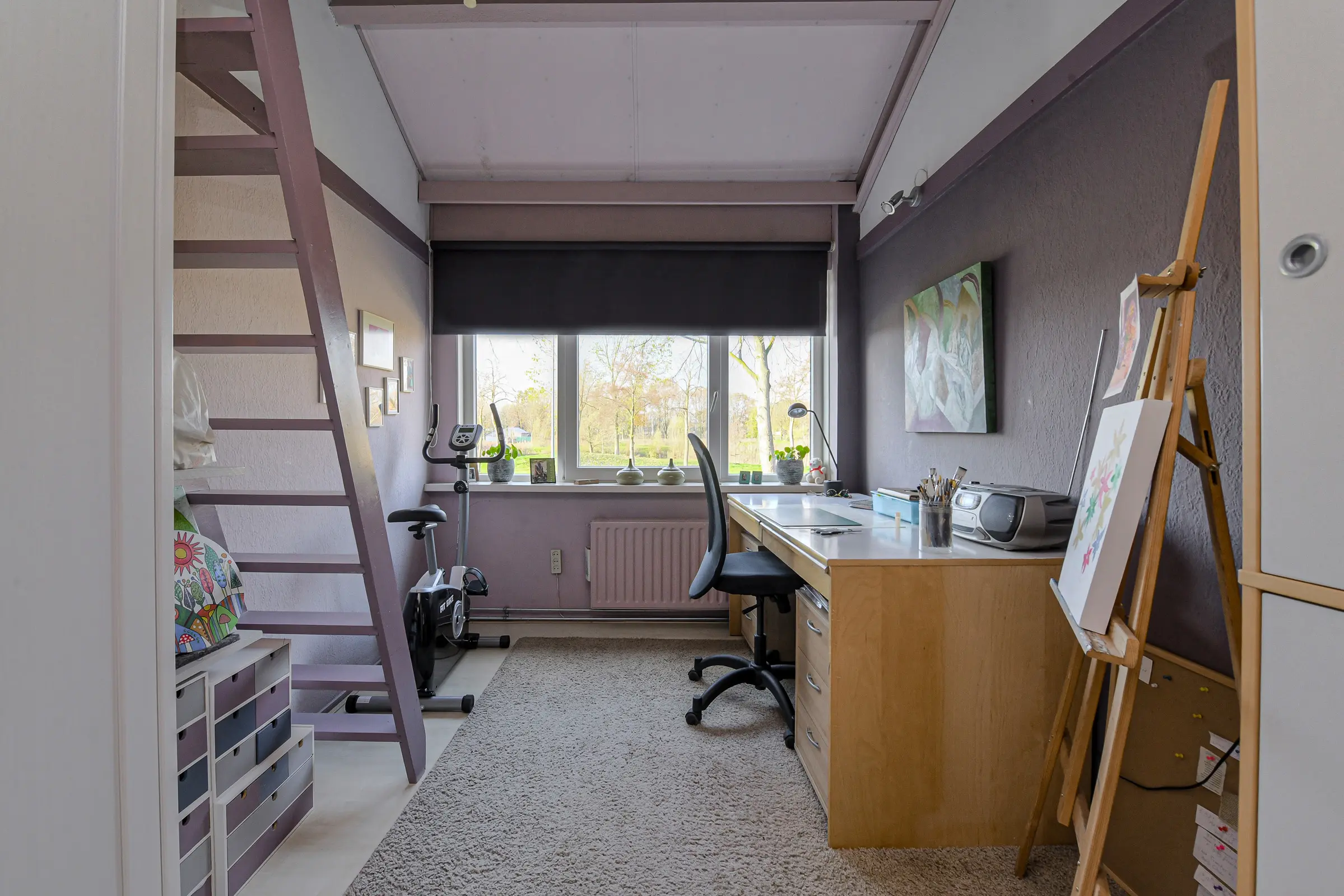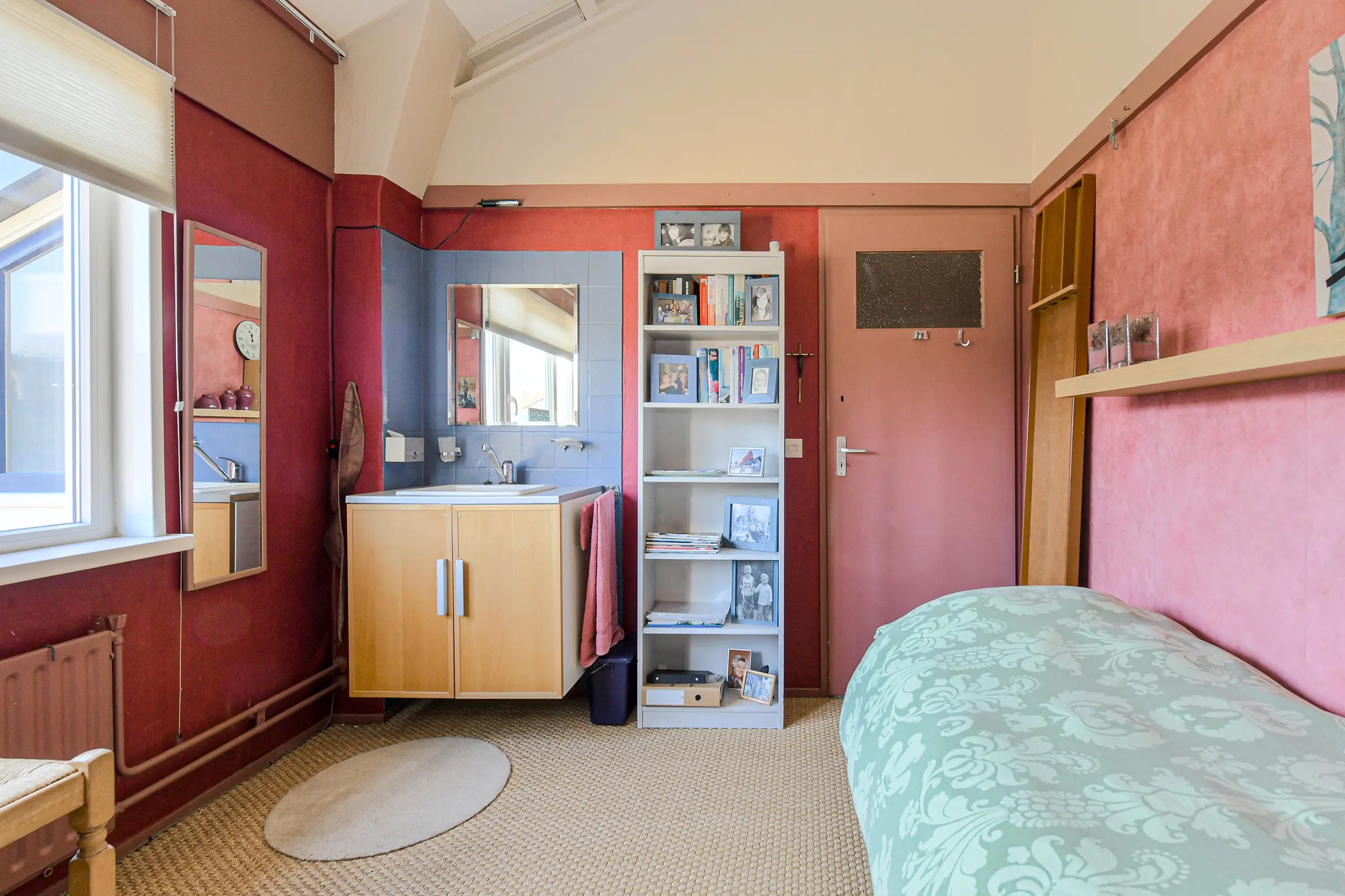 Overloop met een luik naar de bergzolder; slaapkamer achterzijde welke is voorzien van een laminaatvloer en bergzolder; slaapkamer achterzijde met een kunststof schuifpui en bergzolder; slaapkamer voorzijde; badkamer aan de voorzijde is voorzien van een douchecabine, toilet en een wastafel. Er is toegang naar de bergzolder boven de garage, hier is de plaats van de HR combiketel, Nefit 1996.