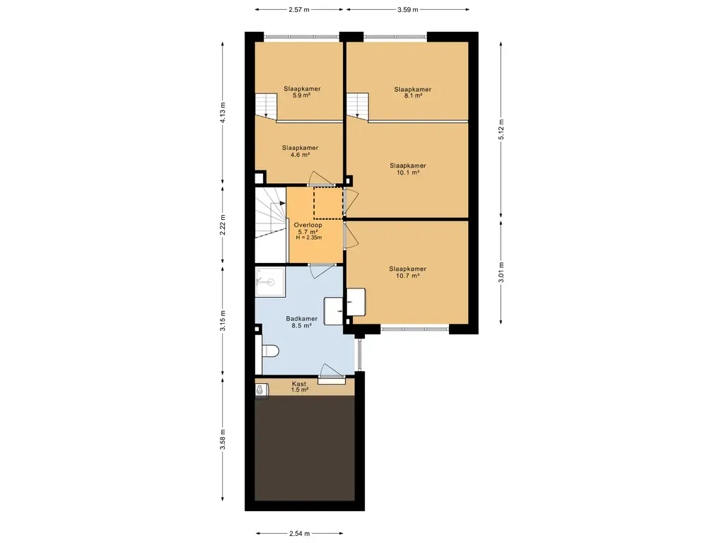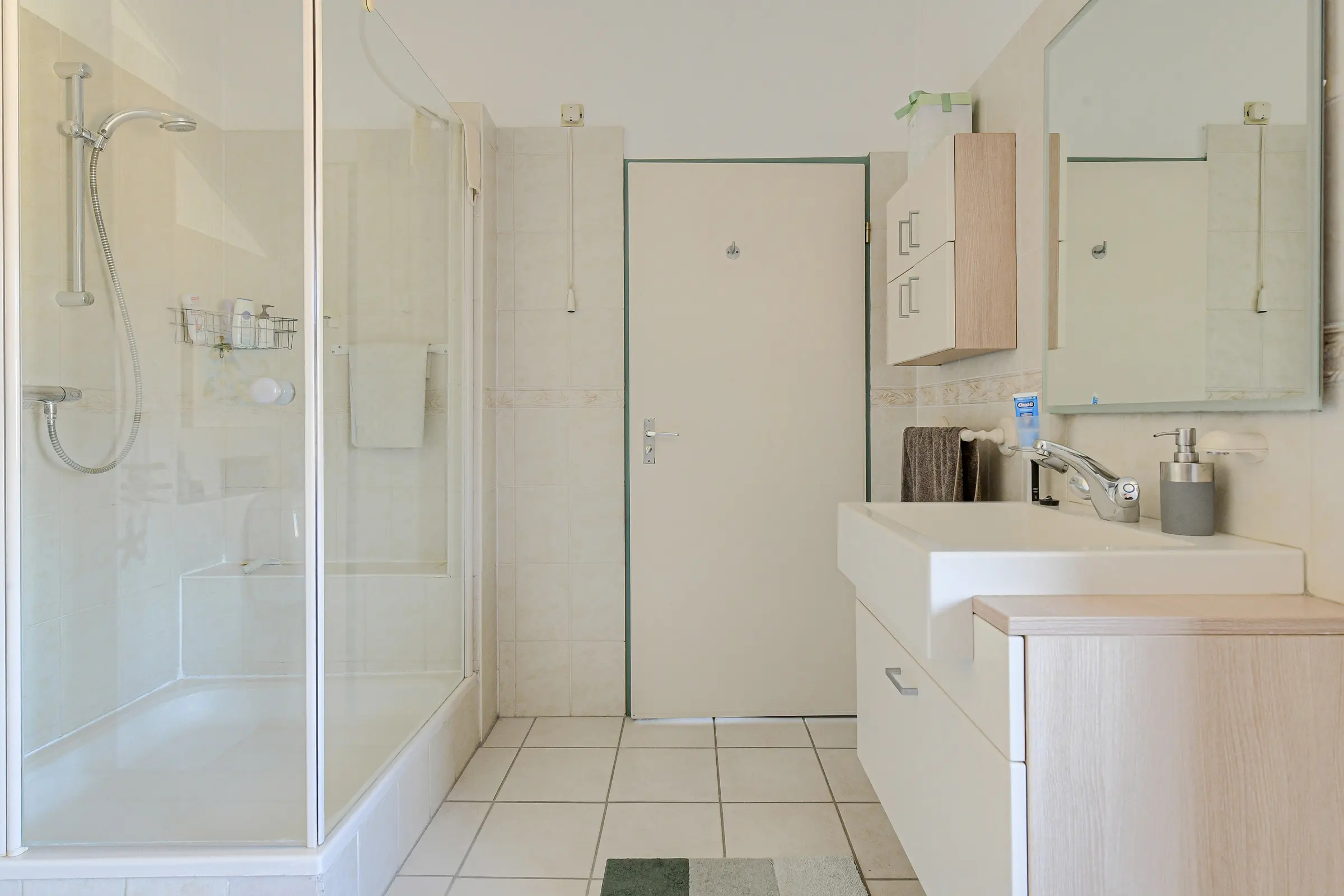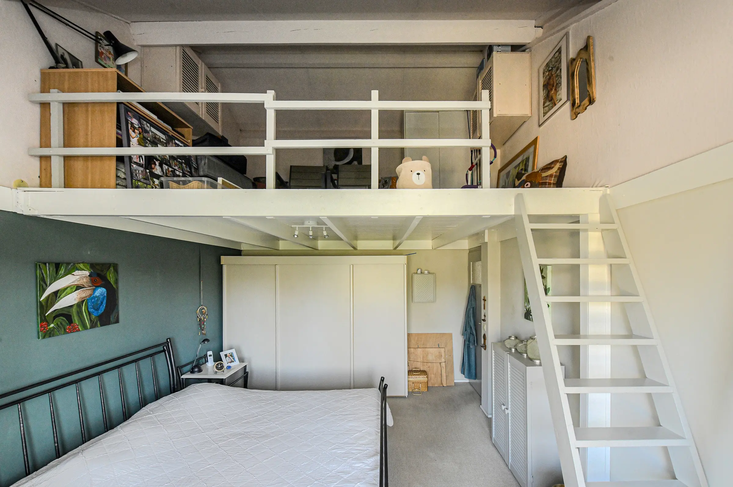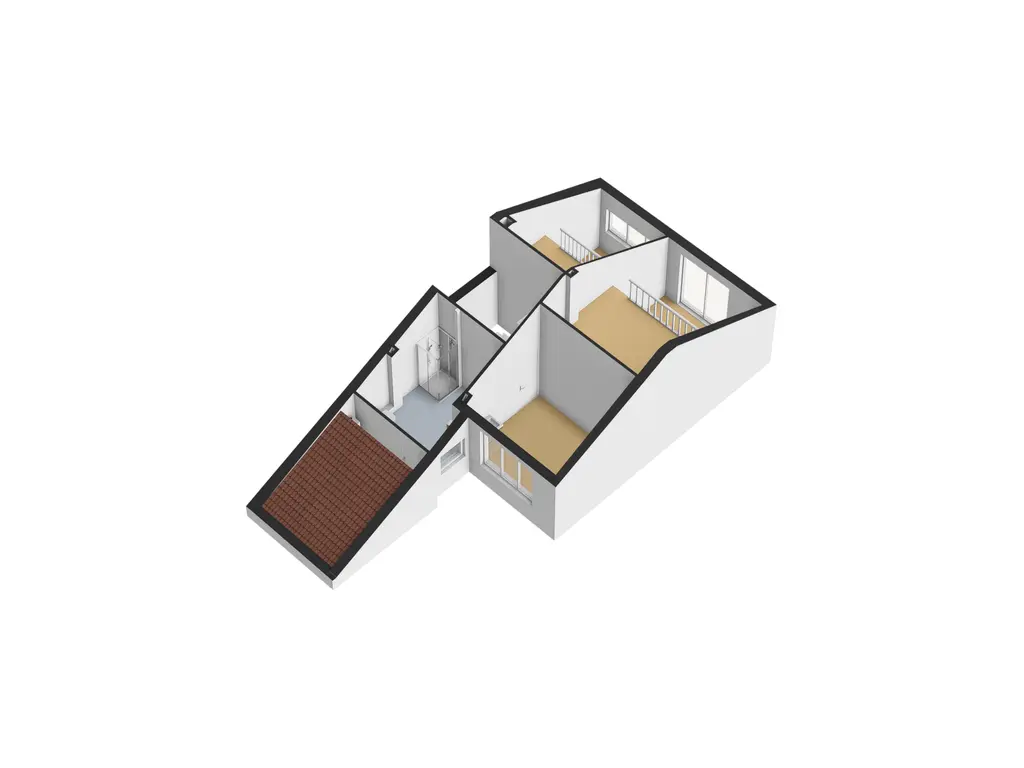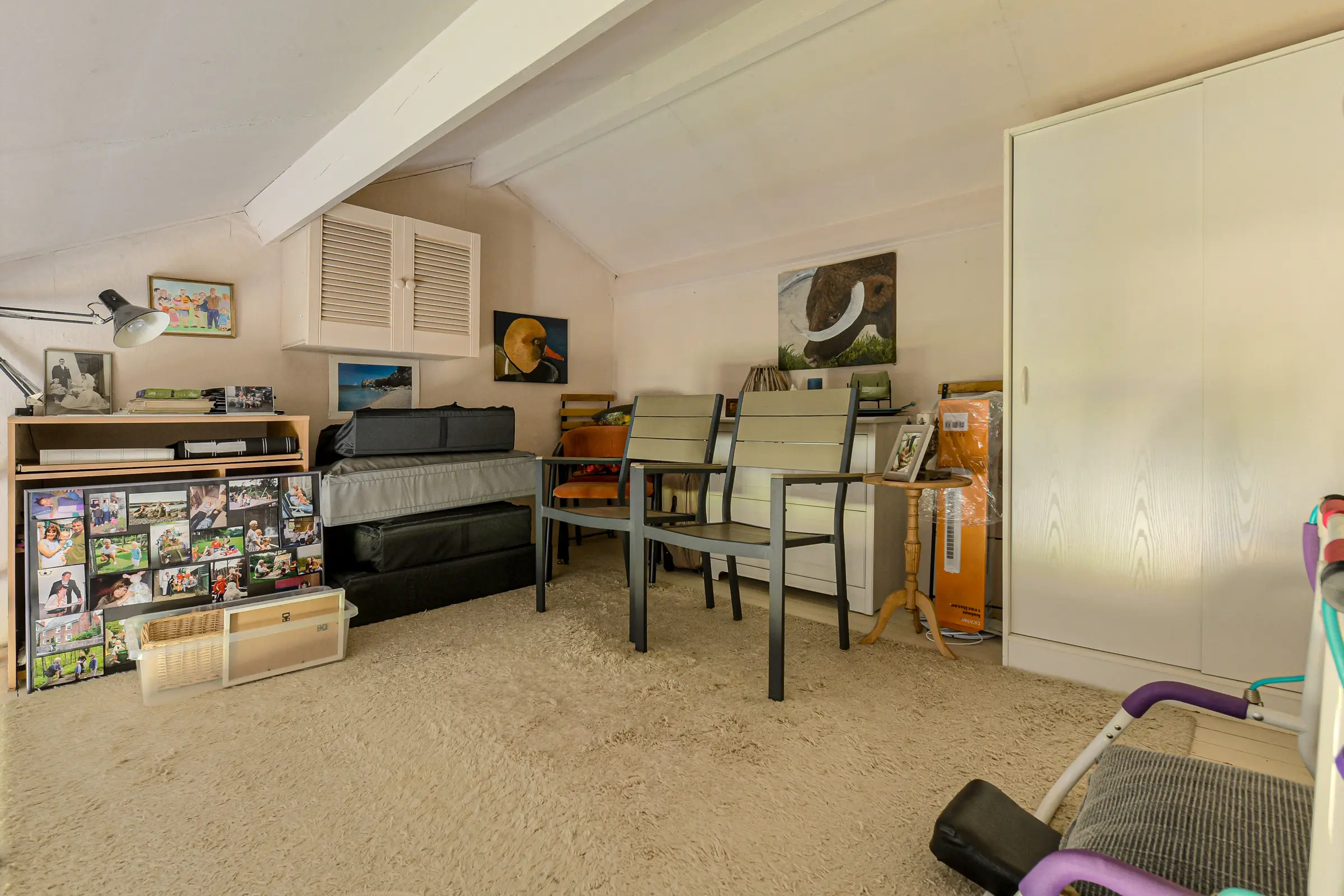 Overloop met een luik naar de bergzolder; slaapkamer achterzijde welke is voorzien van een laminaatvloer en bergzolder; slaapkamer achterzijde met een kunststof schuifpui en bergzolder; slaapkamer voorzijde; badkamer aan de voorzijde is voorzien van een douchecabine, toilet en een wastafel. Er is toegang naar de bergzolder boven de garage, hier is de plaats van de HR combiketel, Nefit 1996.