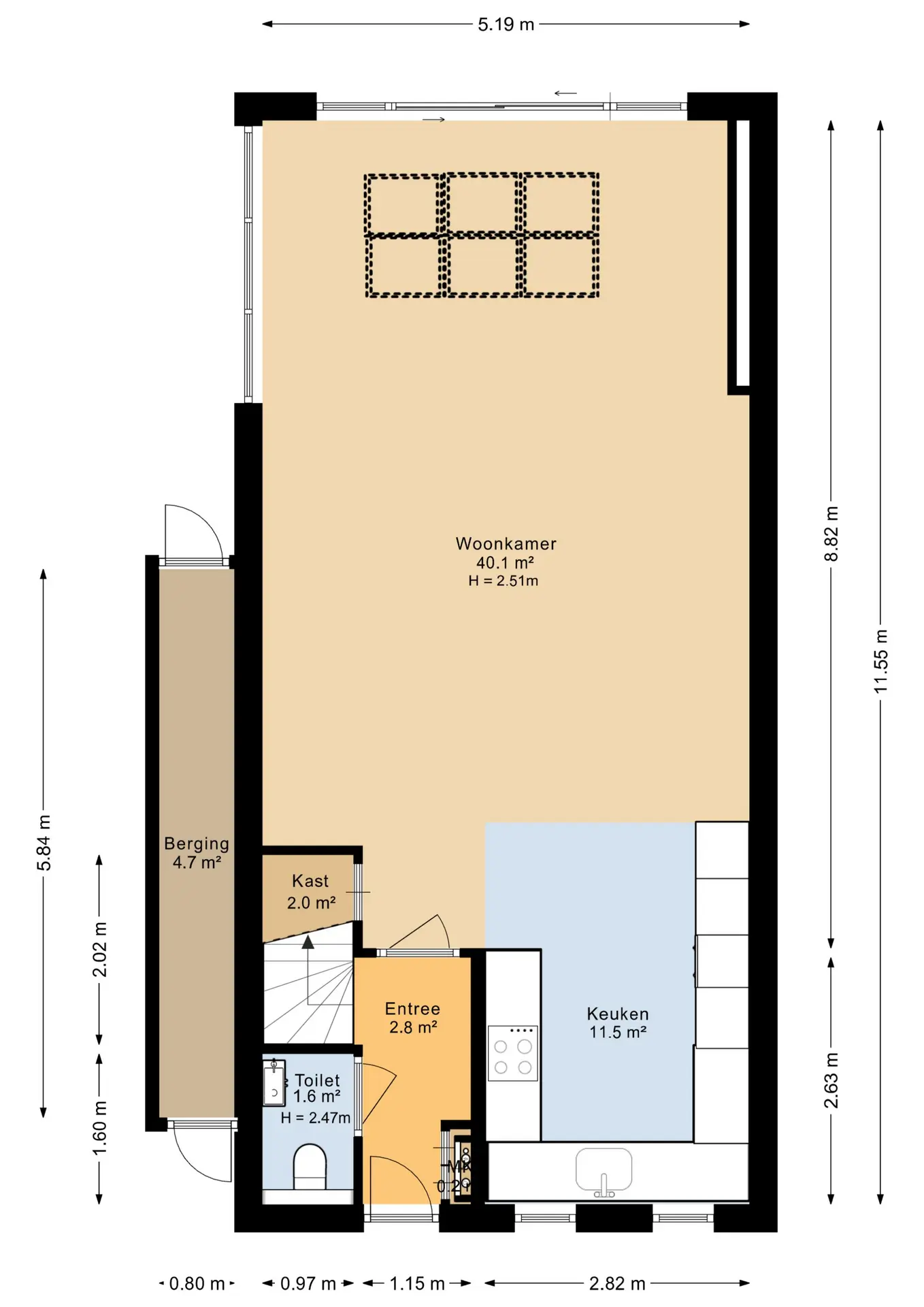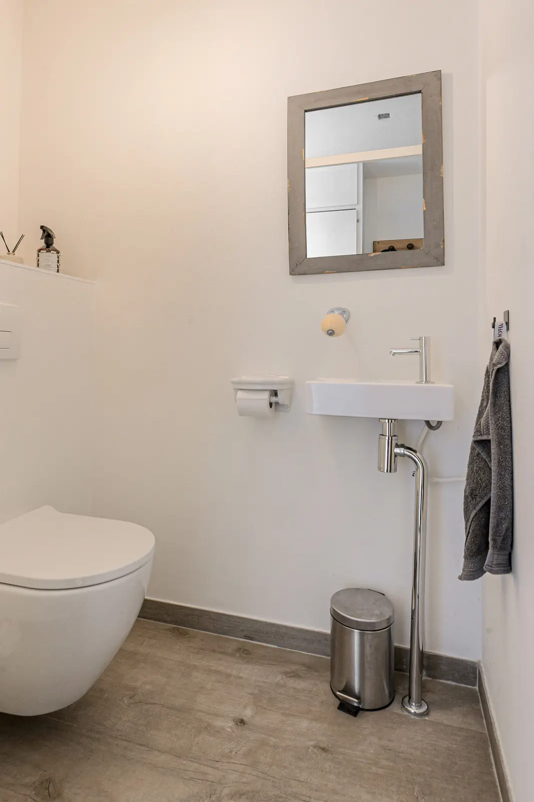 Bij binnenkomst vind je aan de linkerzijde de meterkast, voorzien van maar liefst 13 groepen, 3 aardlekschakelaars en een aparte groep voor een auto-oplaadpunt. Ook bevindt zich hier de stadsverwarmingsunit (=huur). Aan de rechterzijde ligt het moderne toilet met hangend closet en fonteintje, deels betegeld en deels gestuct. De trapopgang naar de bovenverdieping is stijlvol afgewerkt met een houtlook bekleding en subtiele verlichting onder iedere trede.
