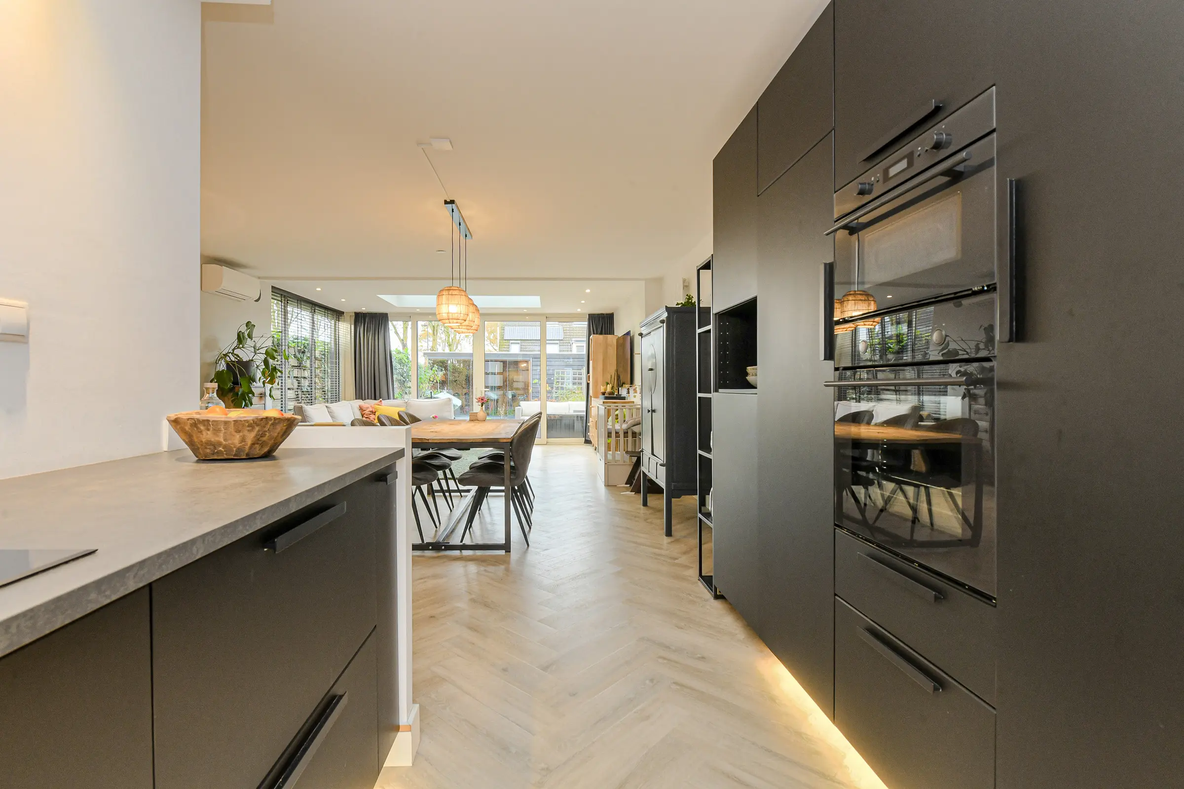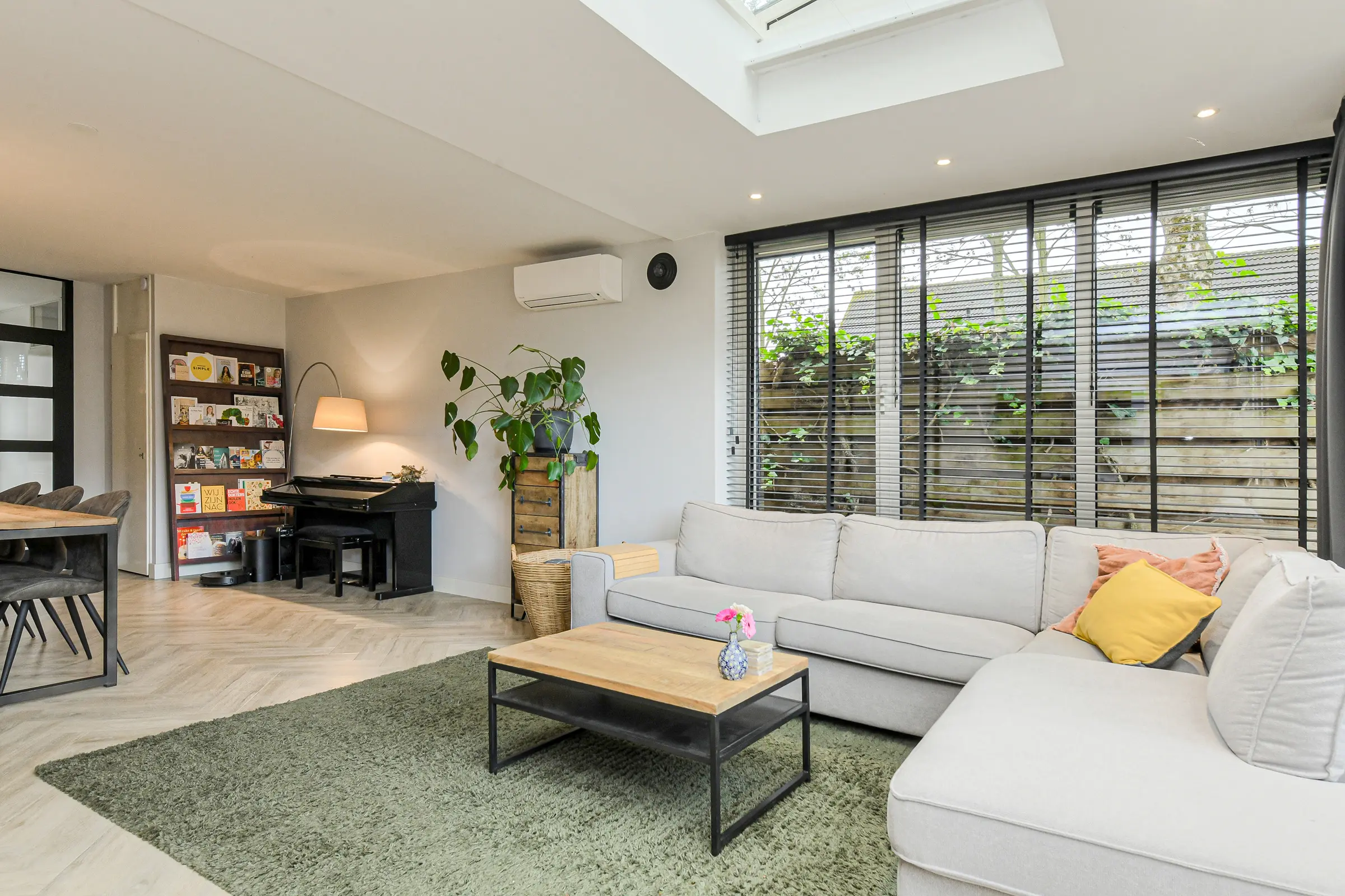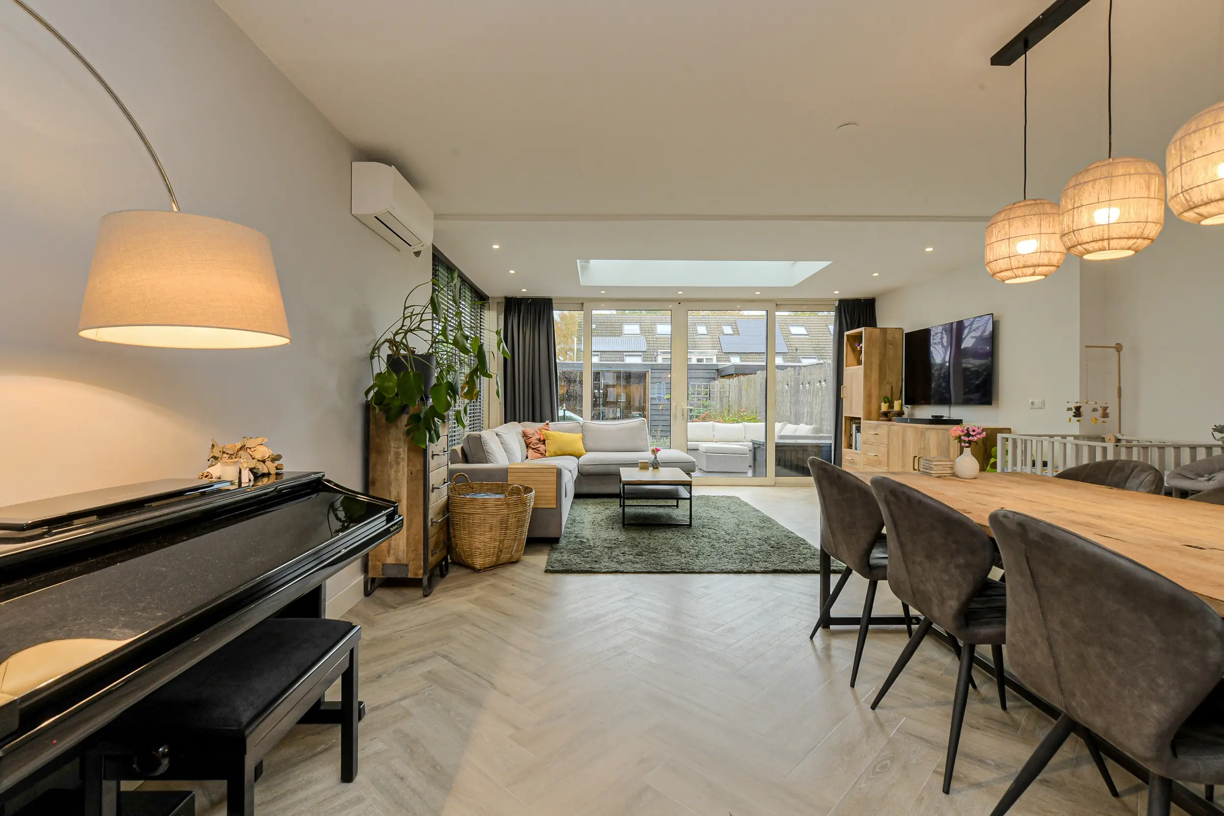 Via de hal is er toegang tot de lichte WOONKAMER. Deze fijne leefruimte beschikt over een praktische trapkast en staat in open verbinding met de moderne keuken, wat zorgt voor een ruimtelijk geheel. De gehele begane grond is afgewerkt met een fraaie PVC-visgraatvloer die de woning een luxe uitstraling geeft. De woonkamer wordt verwarmd middels radiatoren. Dankzij de grote kunststof schuifpui aan de achterzijde, de lichtstraat en de raampartij aan de zijkant geniet de woonkamer van een uitzonderlijk prettige lichtinval. Eind 2022 is er bovendien een airco-unit geplaatst (ter overname), wat zorgt voor extra comfort tijdens warme én koudere dagen.