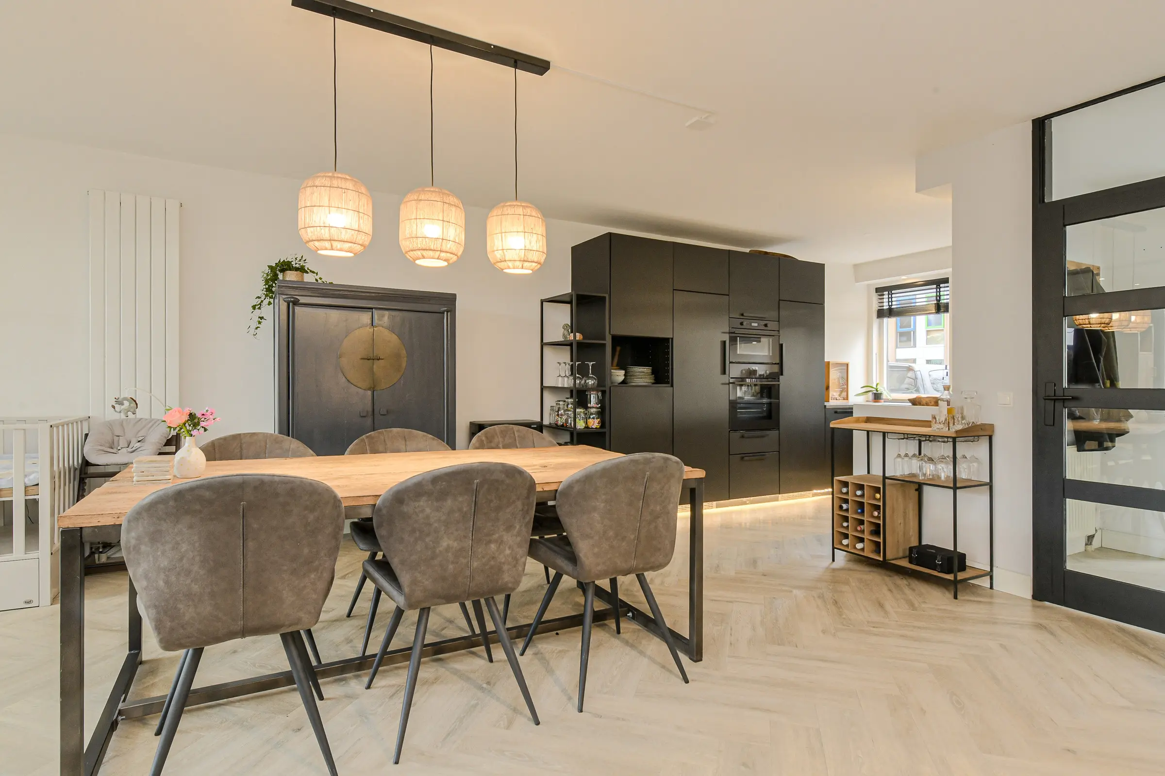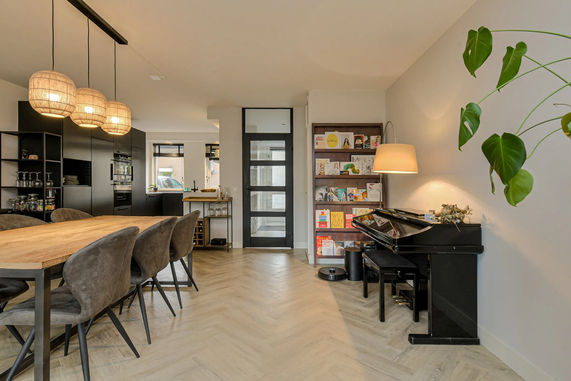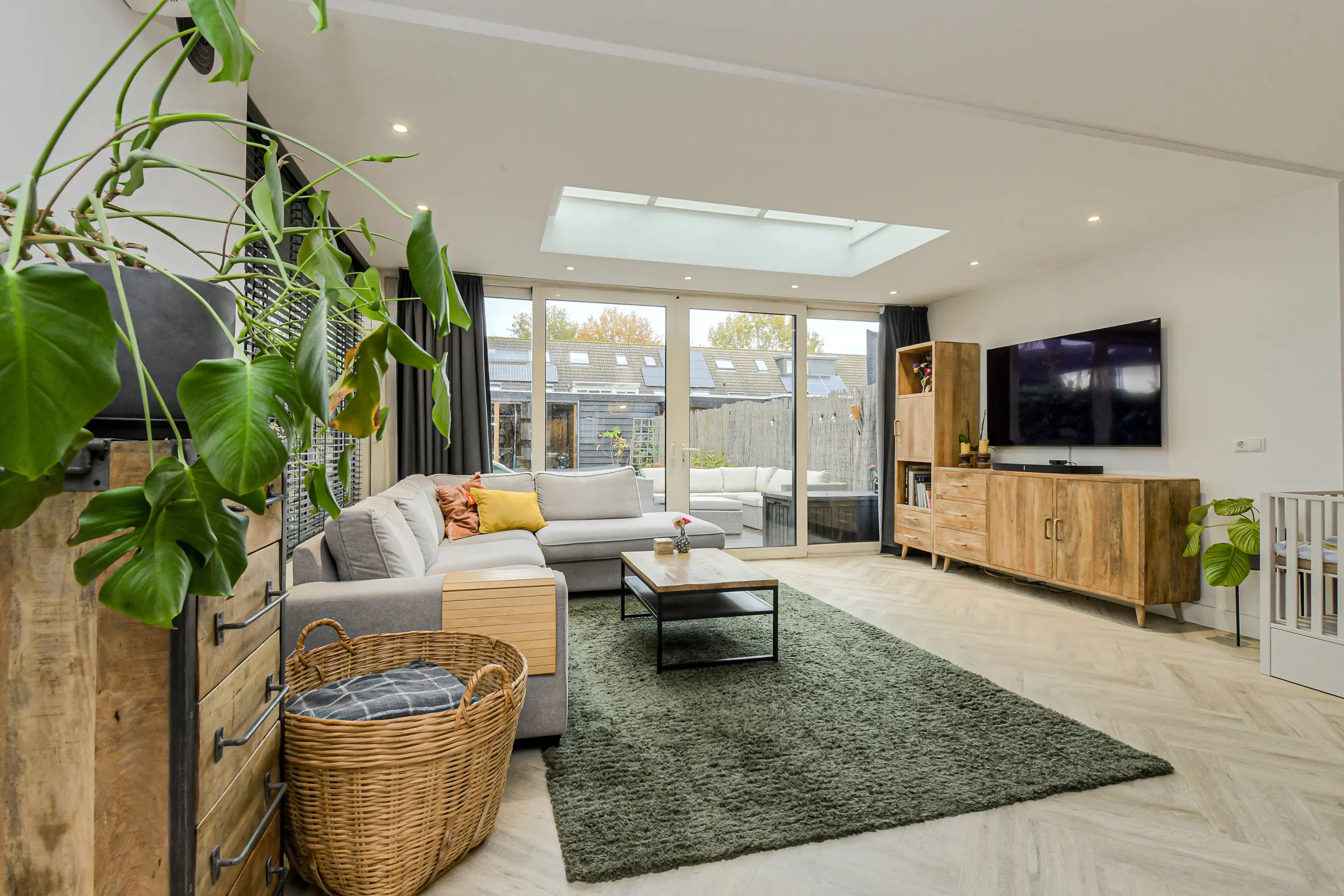 Via de hal is er toegang tot de lichte WOONKAMER. Deze fijne leefruimte beschikt over een praktische trapkast en staat in open verbinding met de moderne keuken, wat zorgt voor een ruimtelijk geheel. De gehele begane grond is afgewerkt met een fraaie PVC-visgraatvloer die de woning een luxe uitstraling geeft. De woonkamer wordt verwarmd middels radiatoren. Dankzij de grote kunststof schuifpui aan de achterzijde, de lichtstraat en de raampartij aan de zijkant geniet de woonkamer van een uitzonderlijk prettige lichtinval. Eind 2022 is er bovendien een airco-unit geplaatst (ter overname), wat zorgt voor extra comfort tijdens warme én koudere dagen.