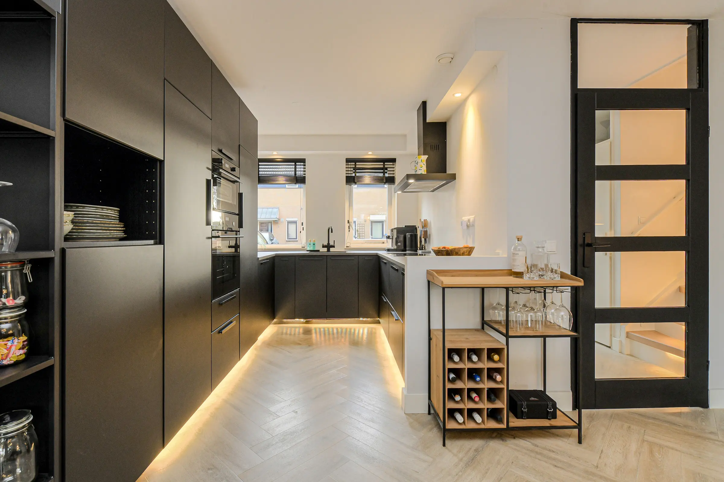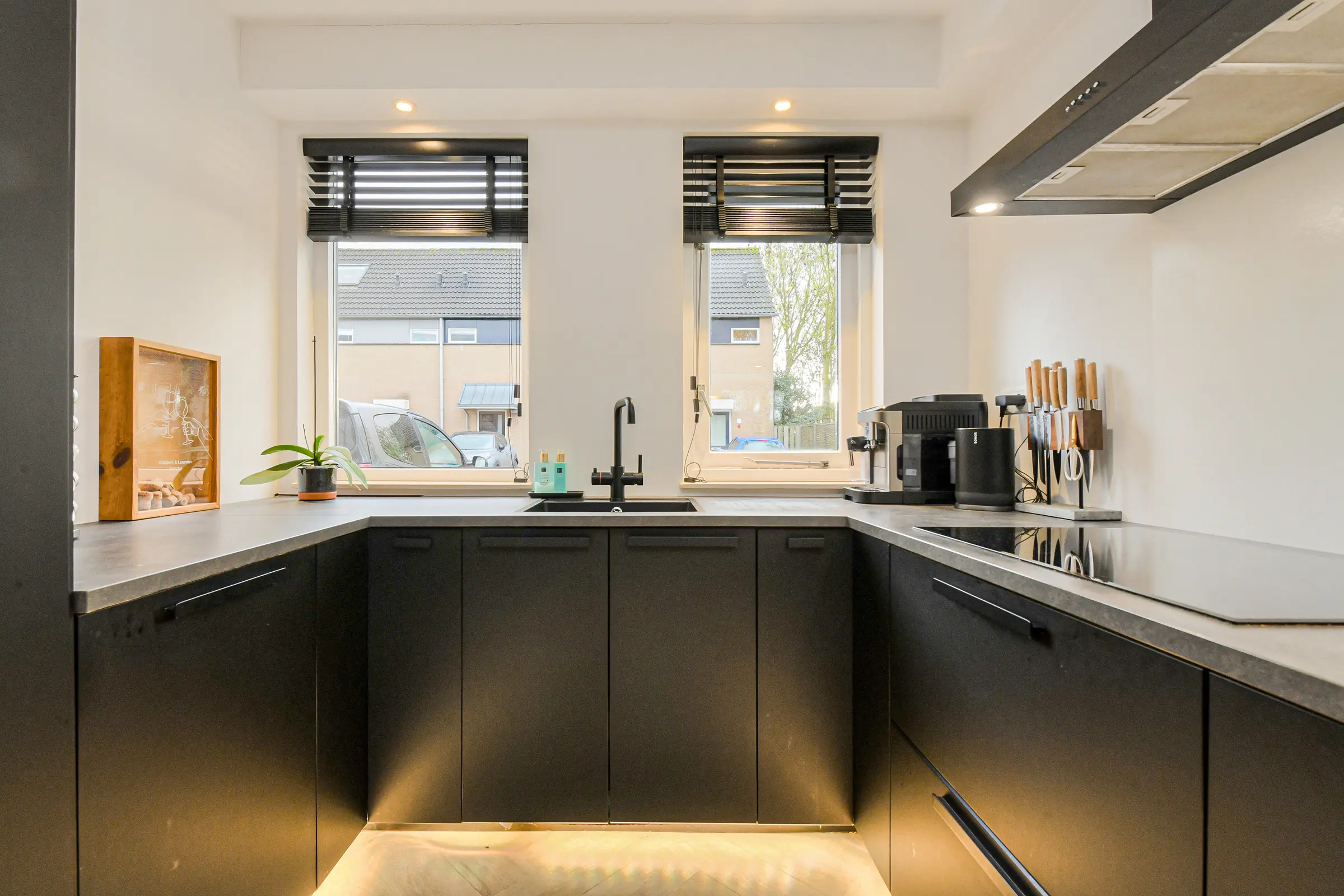 De moderne U-vormige KEUKEN bevindt zich aan de voorzijde van de woning. Deze stijlvolle matzwarte keuken is uitgerust met alle benodigde inbouwapparatuur, waaronder een 4-pits inductiekookplaat met afzuigkap, combi-oven, magnetron, vaatwasser, een royale koelkast én een aparte grote vriezer. Daarnaast is de keuken voorzien van een kokendwaterkraan HOTTO (2025 vernieuwd), wat extra comfort biedt. Dankzij de ruime hoeveelheid kasten is er meer dan voldoende opbergruimte voor servies, kookgerei en voorraad.