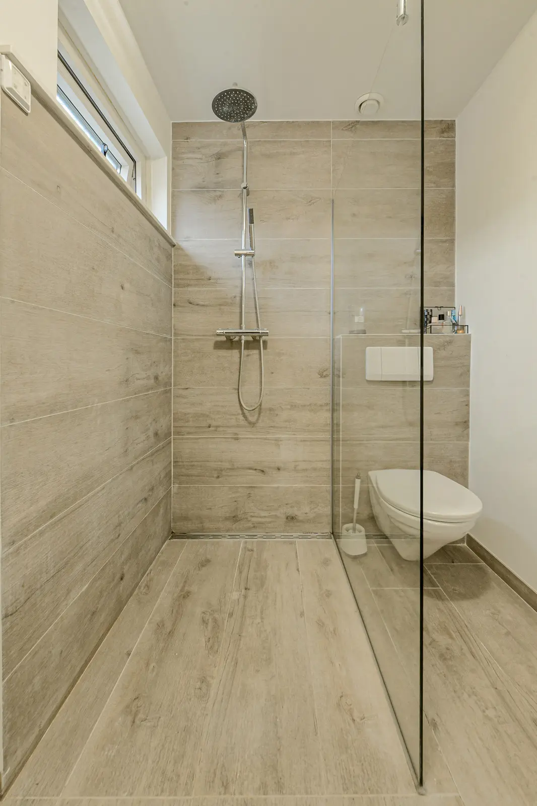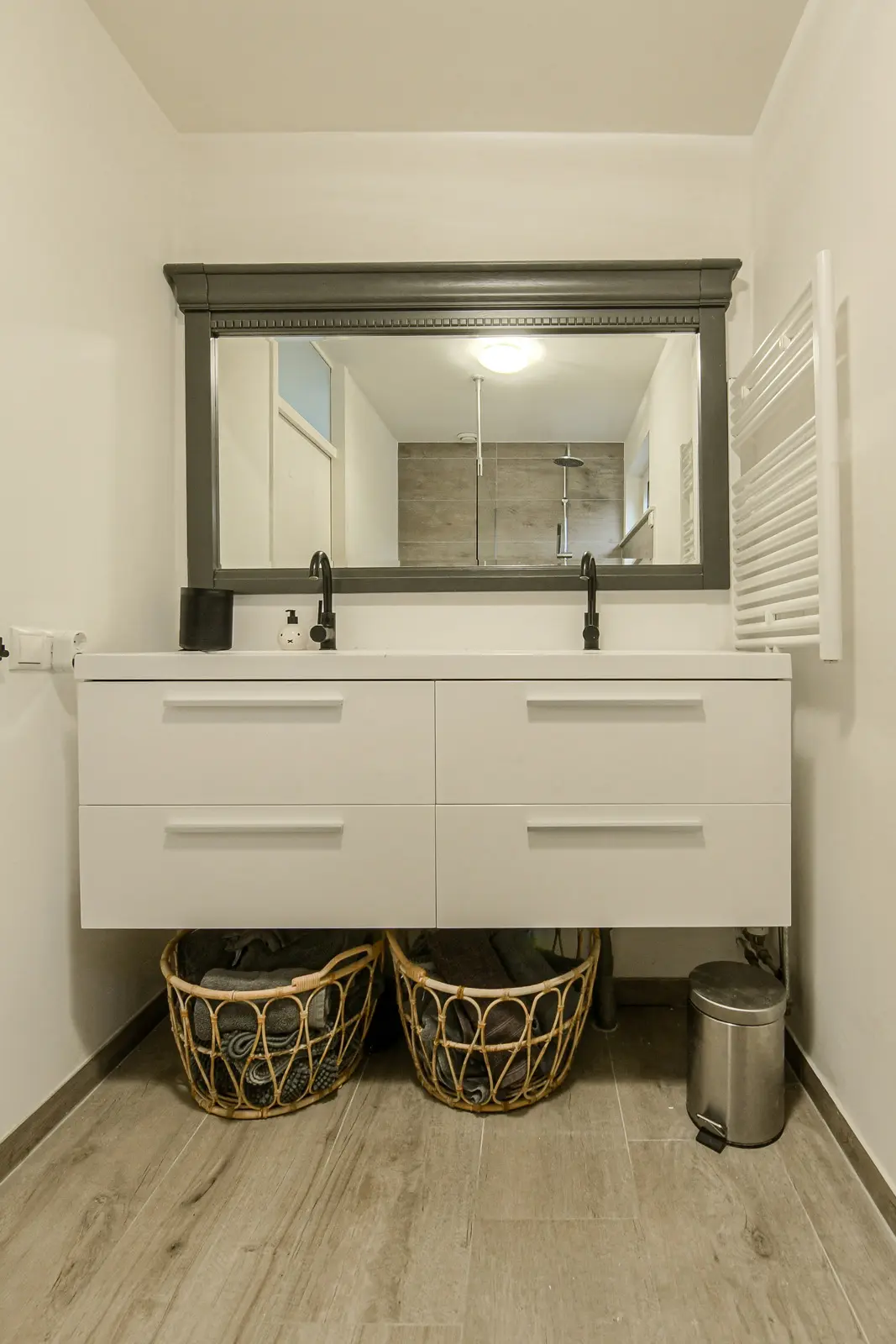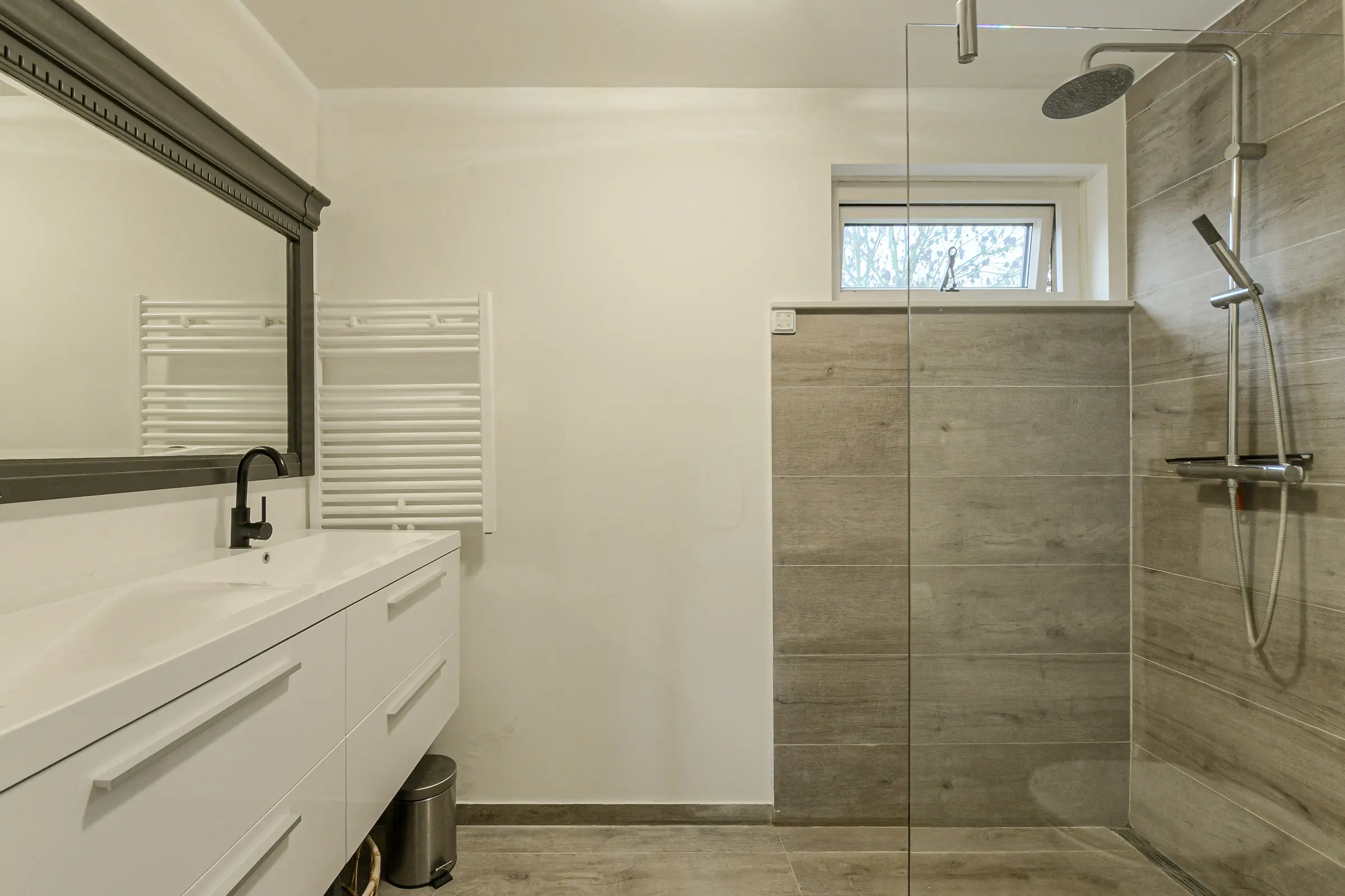 De moderne BADKAMER is uitgerust met een riante inloopdouche, een tweede toilet en een dubbele wastafel met bijpassend meubel. De wanden zijn deels betegeld en deels gestuct, wat de ruimte een frisse en moderne look geeft. Daarnaast is de badkamer aangesloten op mechanische ventilatie.