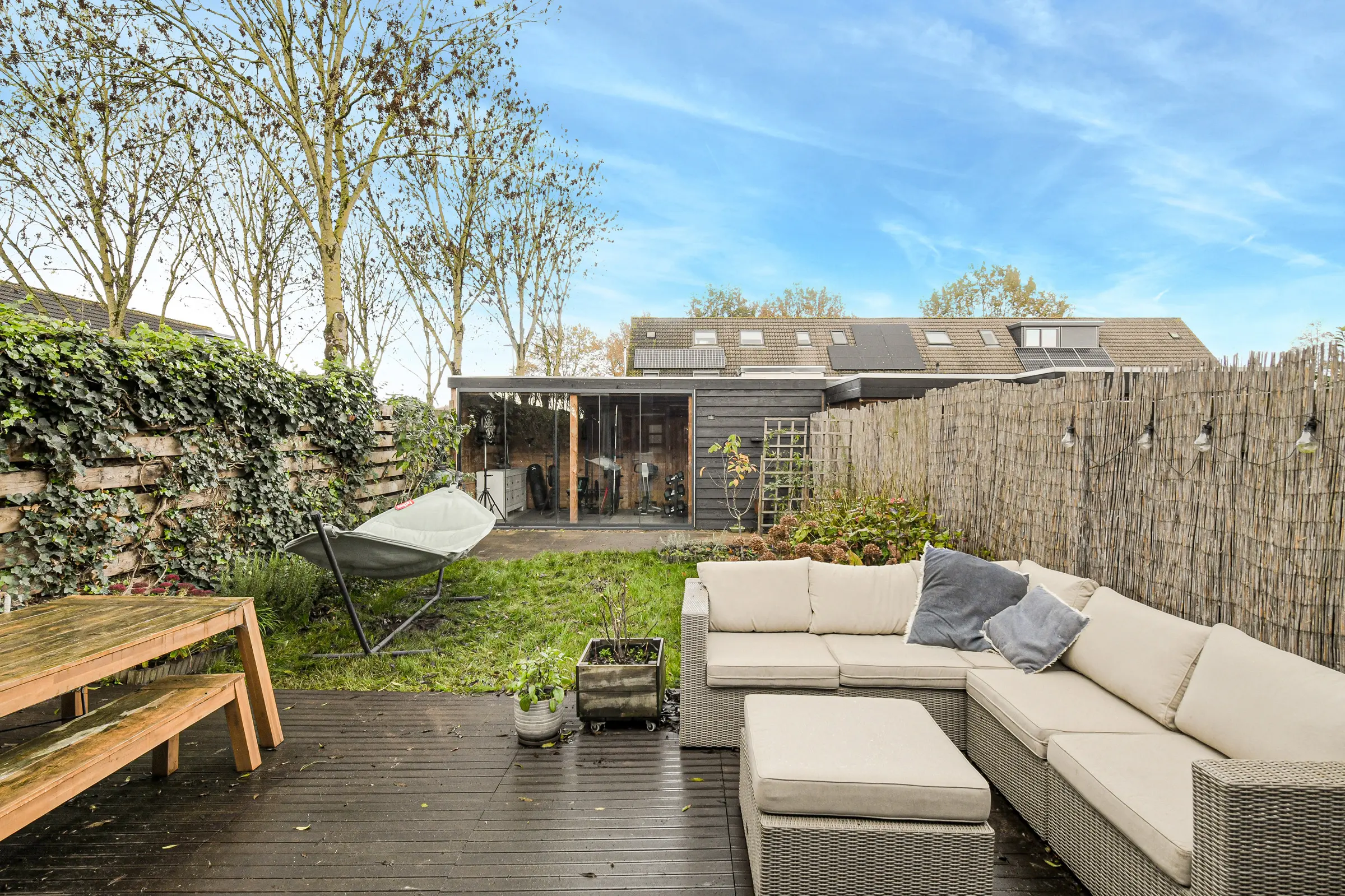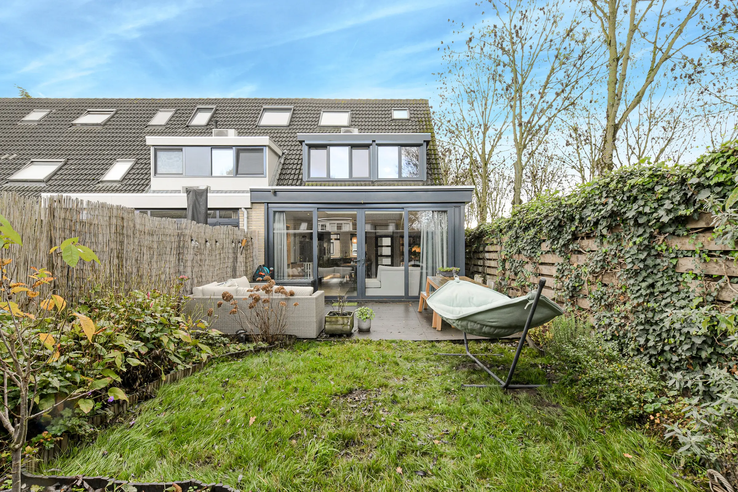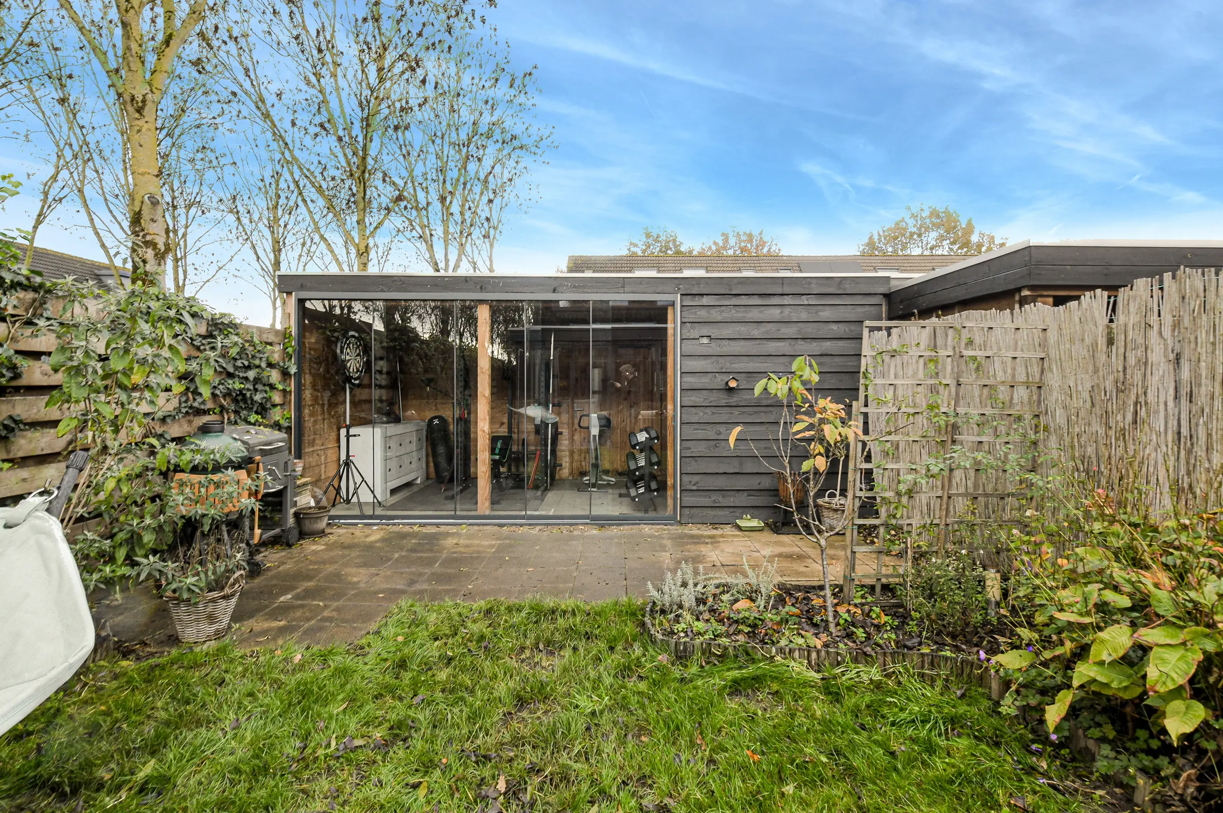 De woning beschikt over een ruime, verzorgde achtertuin op het noordwesten. Hier vind je een stenen berging met daaraan grenzend een sfeervolle overkapping waar je heerlijk kunt zitten. Deze overkapping is afsluitbaar met een glazen schuifwand en biedt tevens toegang tot de achterom, waardoor de tuin ook praktisch bereikbaar is. Daarnaast kun je de tuin ook verlaten via een poort aan de zijkant van de woning. Langs deze zijkant is een praktisch klein afdakje geplaatst, ideaal voor het opbergen van tuinspullen.De tuin is deels bestraat en verder ingericht met een strak gazon en groene borders, waardoor er een fijne mix ontstaat van comfort en natuur.