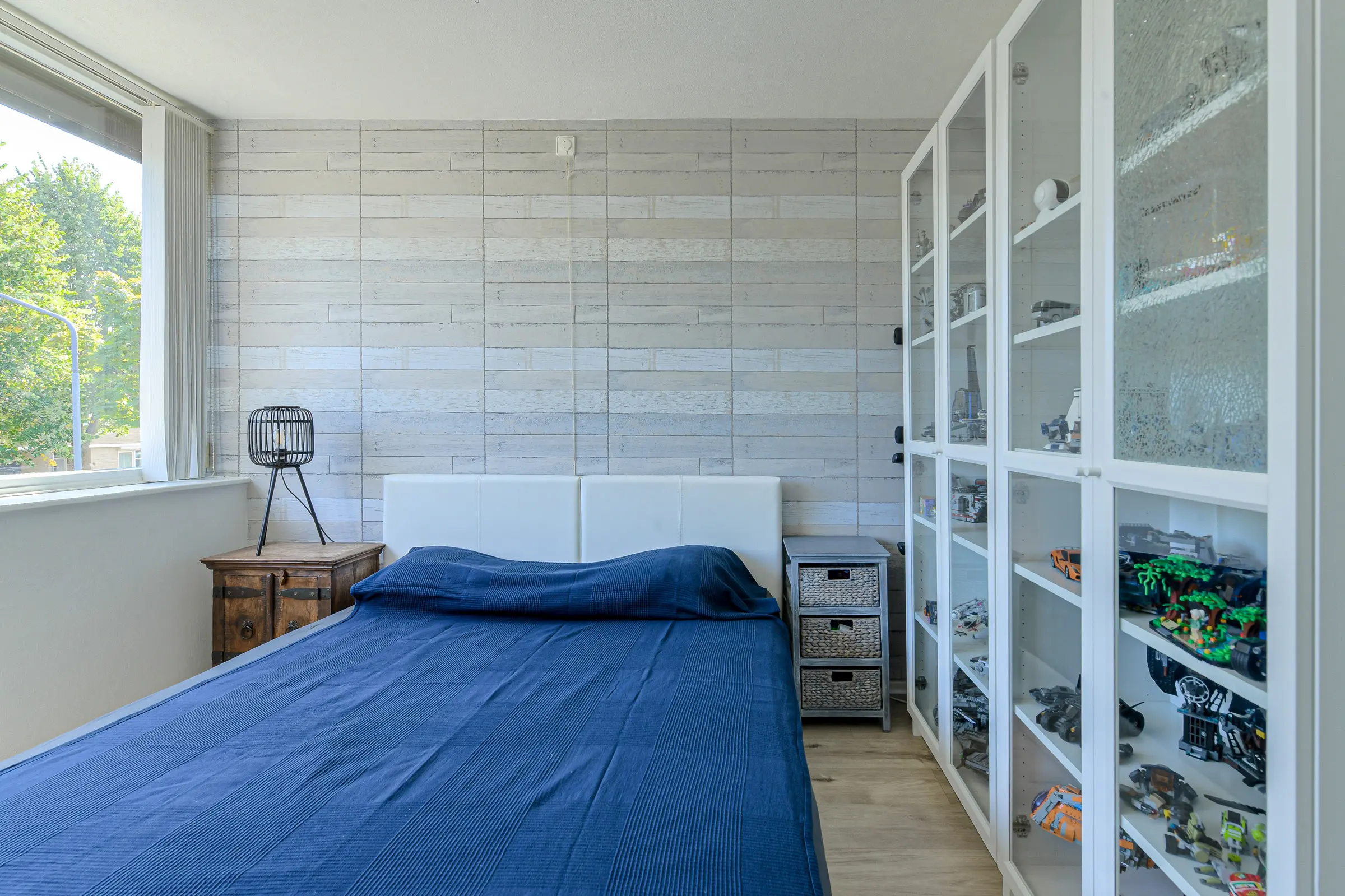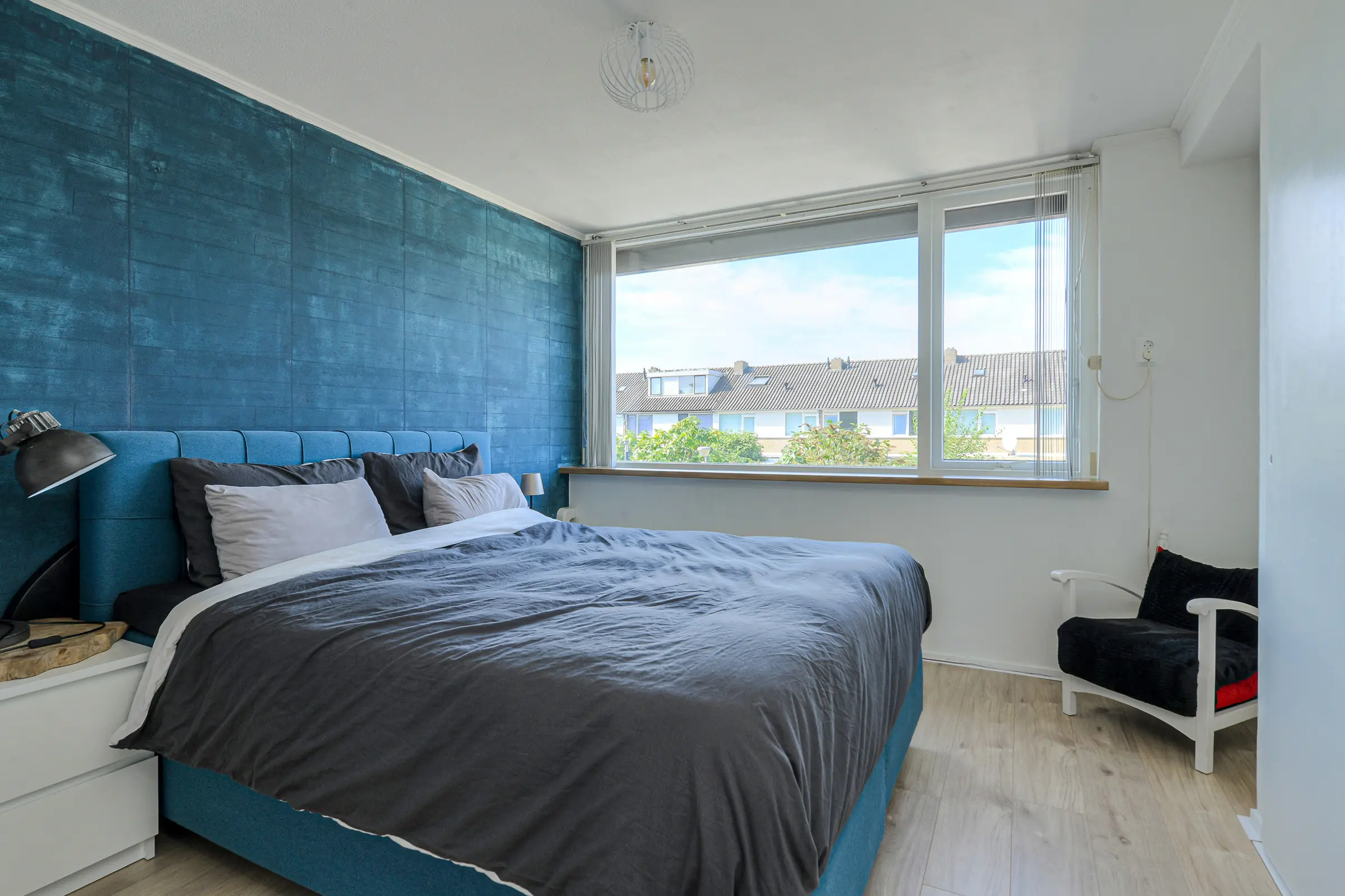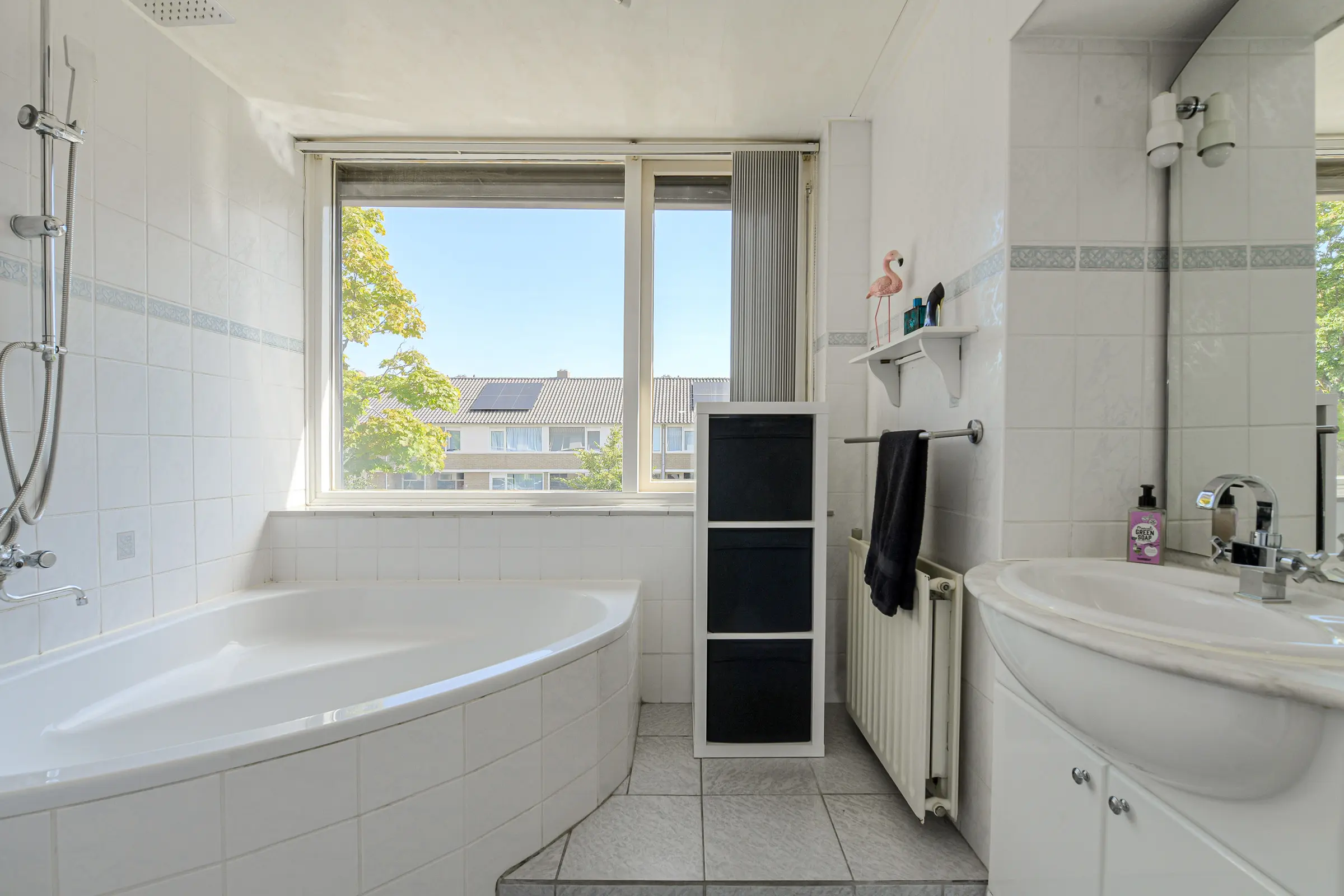 Op de eerste verdieping vind je een ruime overloop met vaste trap naar de tweede verdieping. De grote slaapkamer aan de voorzijde biedt voldoende ruimte voor een comfortabel bed en kast. Aan de achterzijde van de woning bevinden zich twee andere slaapkamers, waarvan één kleiner is en perfect kan dienen als kinderkamer, werkkamer of logeerkamer. De badkamer is praktisch ingedeeld en voorzien van een tweede toilet, ligbad en wastafel, zodat je kunt genieten van comfort en rust.