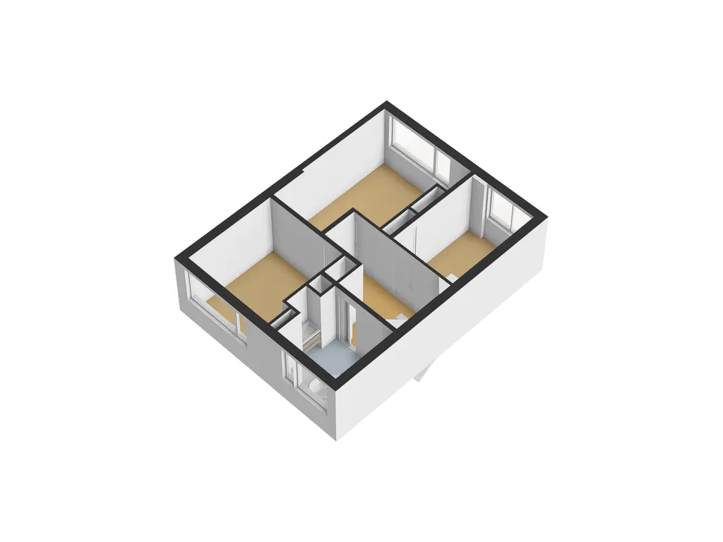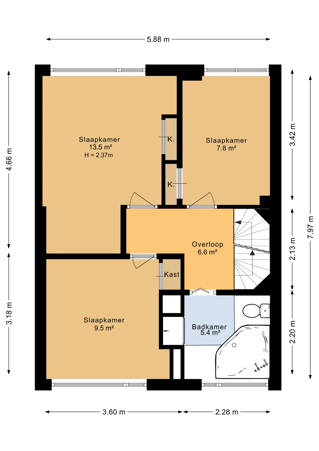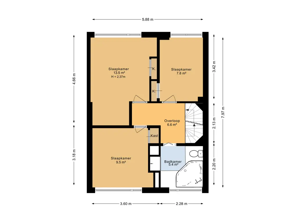 Op de eerste verdieping vind je een ruime overloop met vaste trap naar de tweede verdieping. De grote slaapkamer aan de voorzijde biedt voldoende ruimte voor een comfortabel bed en kast. Aan de achterzijde van de woning bevinden zich twee andere slaapkamers, waarvan één kleiner is en perfect kan dienen als kinderkamer, werkkamer of logeerkamer. De badkamer is praktisch ingedeeld en voorzien van een tweede toilet, ligbad en wastafel, zodat je kunt genieten van comfort en rust.