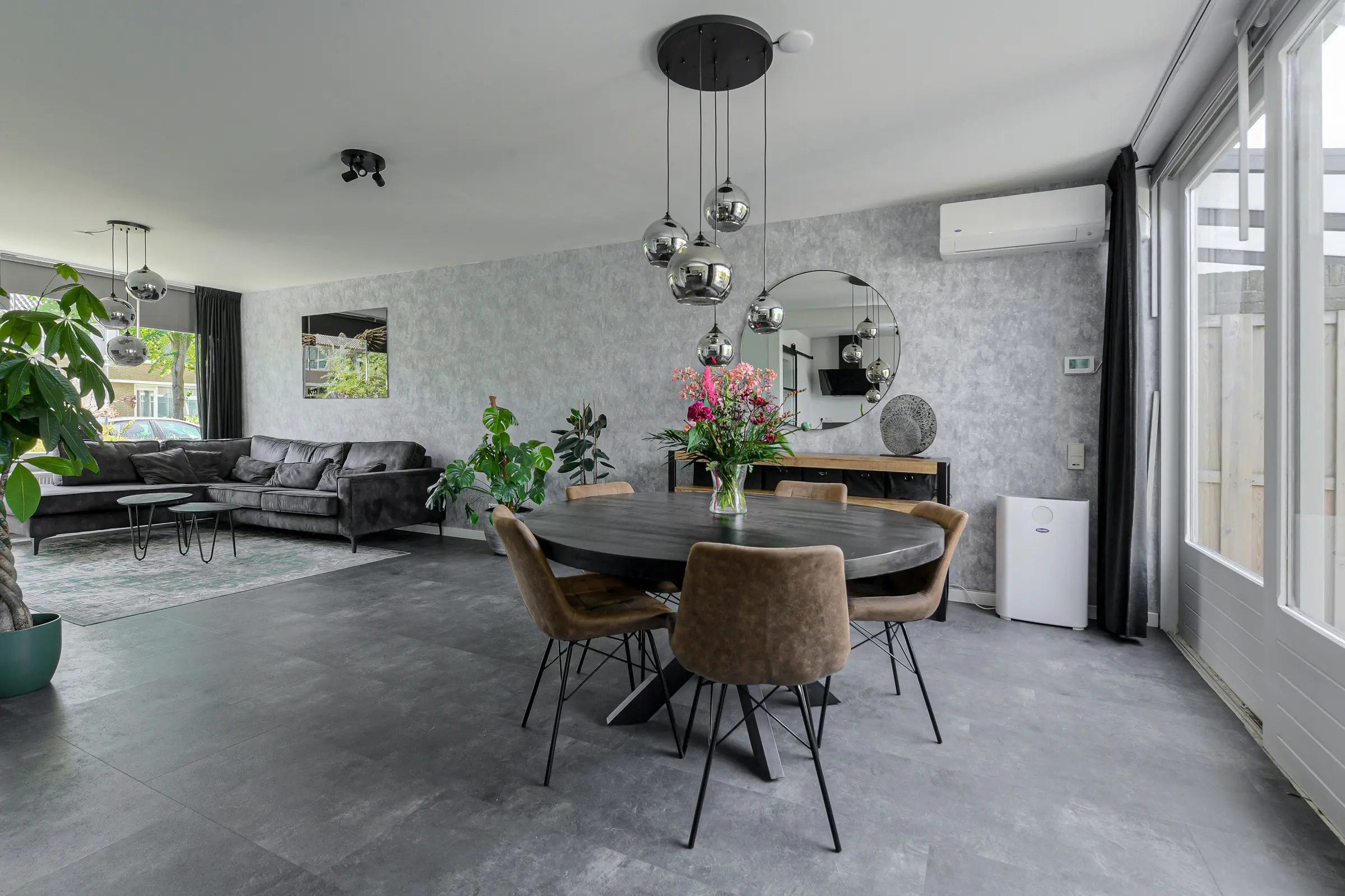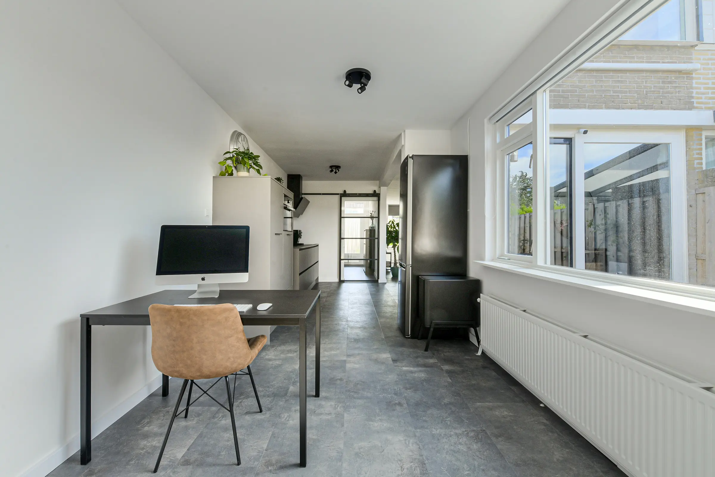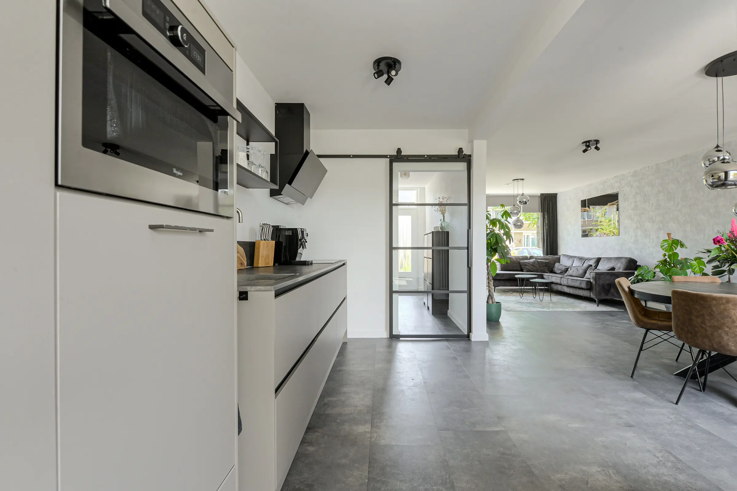 De woonkamer is licht en gezellig, met een schuifpui met uitzicht op de tuin en fraaie PVC vloer (geïsoleerd) welke zorgt voor een eigentijdse uitstraling. De airco maakt het verhaal compleet De open keuken loopt uit in de aanbouw met een multifunctionele ruimte en is voorzien van moderne inrichting met diverse, zoals een inductiekookplaat, afzuigkap, vaatwasmachine op hoogte en een combimagnetron. De keuken biedt voldoende ruimte voor het bereiden van maaltijden en is een fijne plek voor de dagelijkse maattijd. De ruimte achter de keuken kan gebruikt worden als een eetkamer, ook als een speelkamer of een werkplek. Hier vind je ook de wasmachine aansluiting.