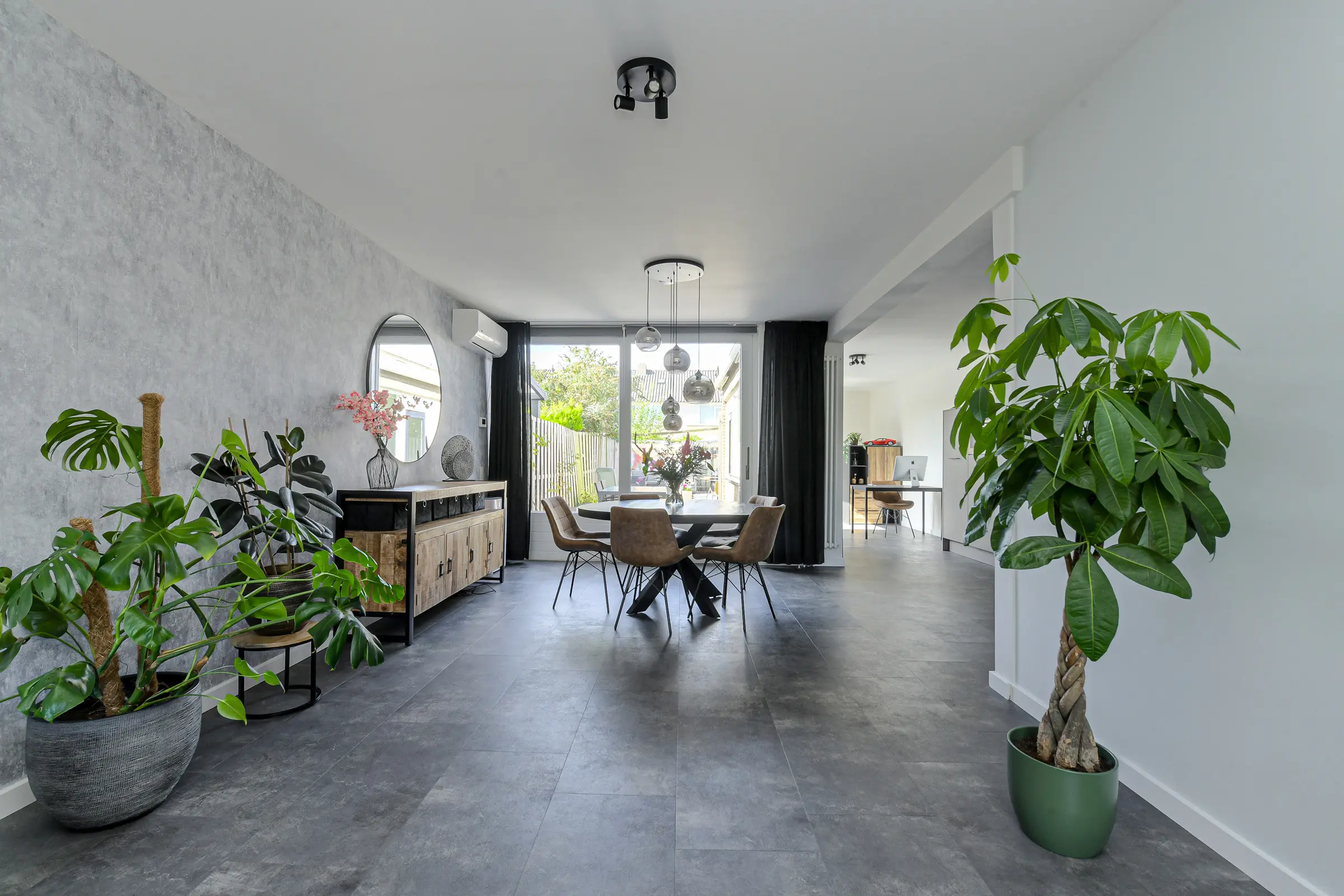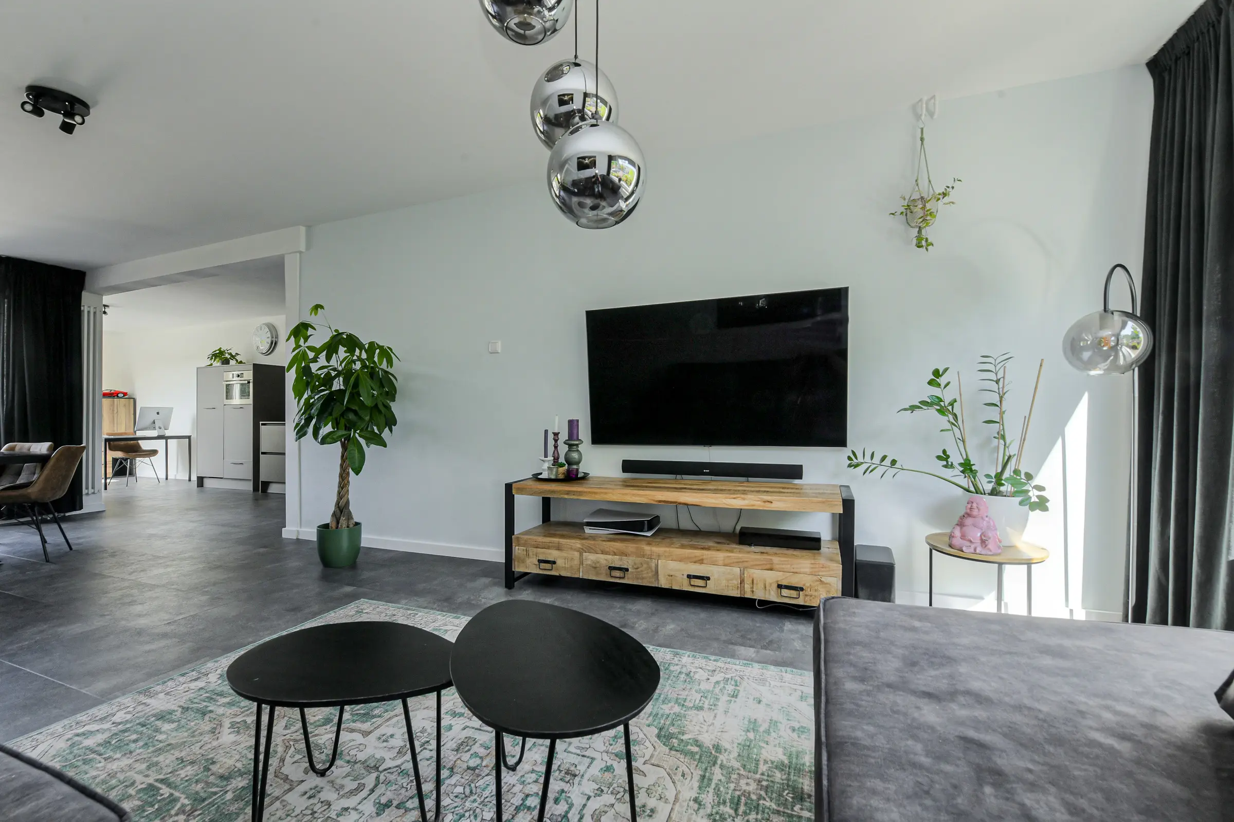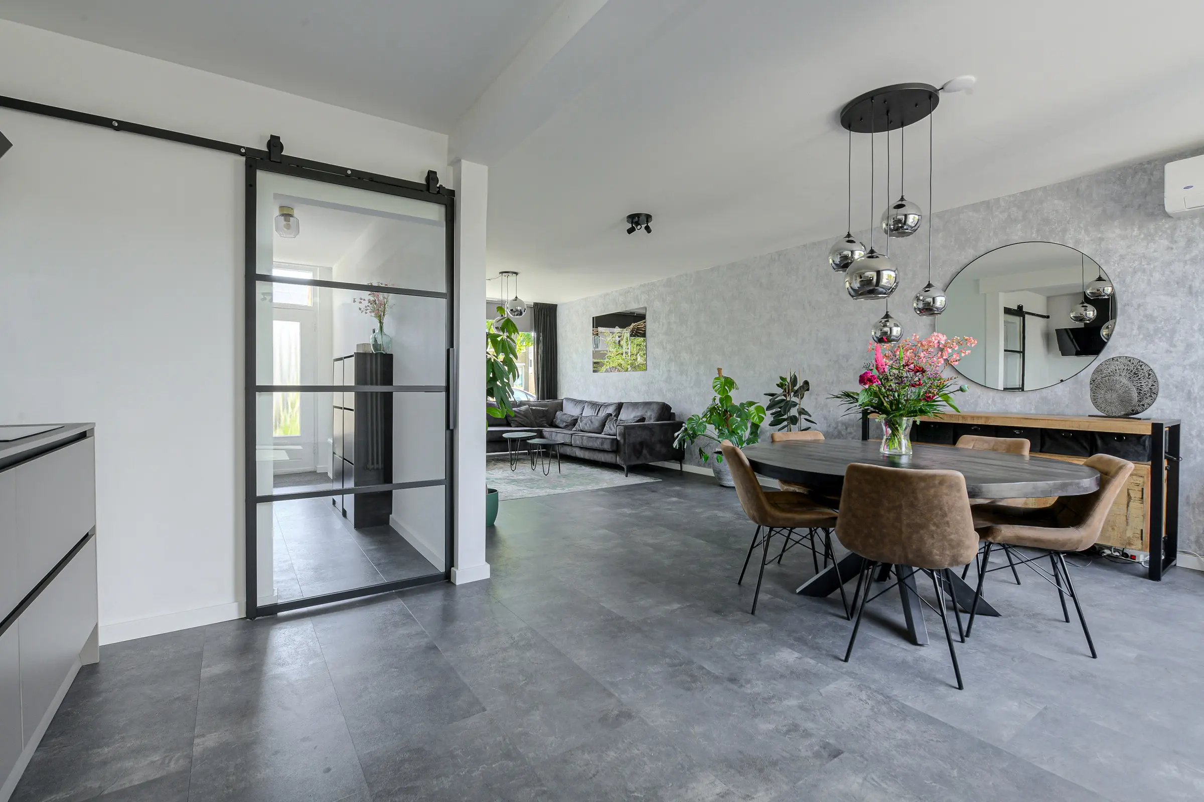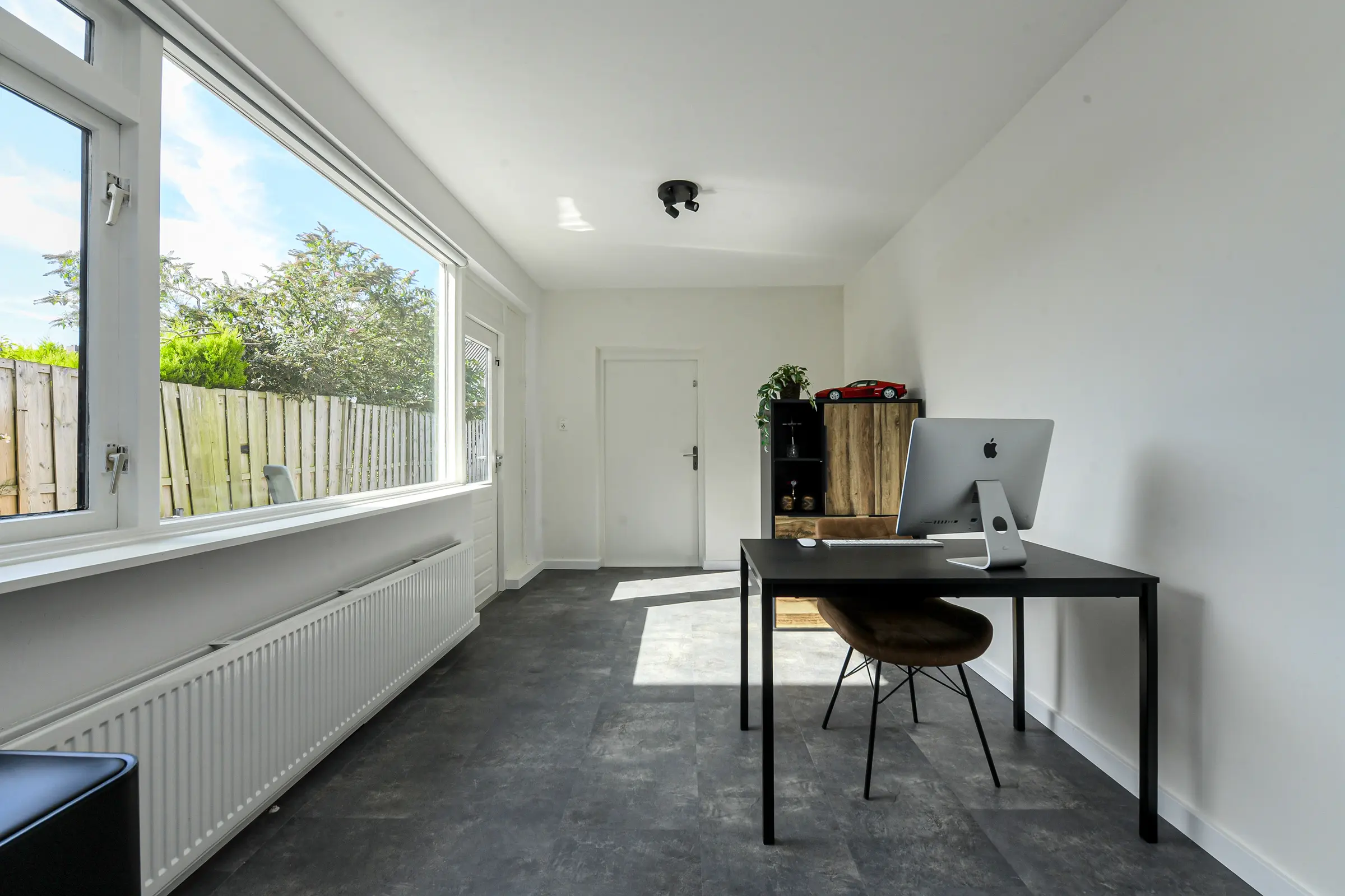 De woonkamer is licht en gezellig, met een schuifpui met uitzicht op de tuin en fraaie PVC vloer (geïsoleerd) welke zorgt voor een eigentijdse uitstraling. De airco maakt het verhaal compleet De open keuken loopt uit in de aanbouw met een multifunctionele ruimte en is voorzien van moderne inrichting met diverse, zoals een inductiekookplaat, afzuigkap, vaatwasmachine op hoogte en een combimagnetron. De keuken biedt voldoende ruimte voor het bereiden van maaltijden en is een fijne plek voor de dagelijkse maattijd. De ruimte achter de keuken kan gebruikt worden als een eetkamer, ook als een speelkamer of een werkplek. Hier vind je ook de wasmachine aansluiting.