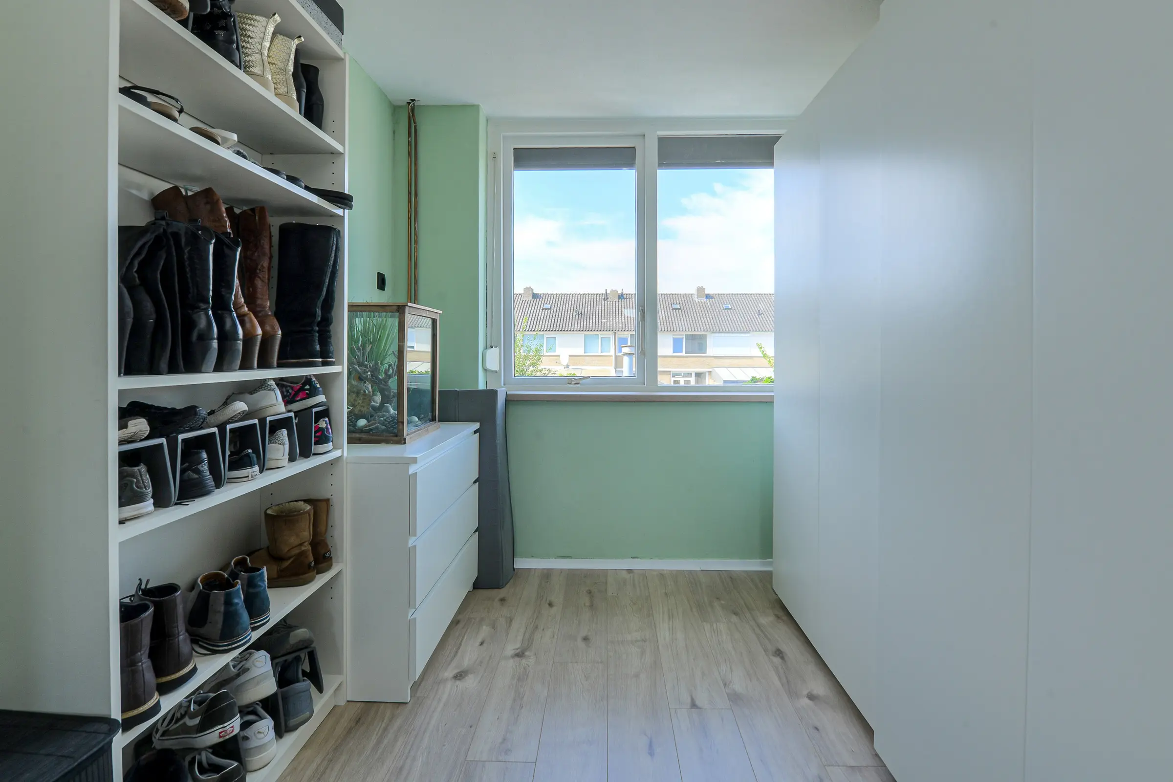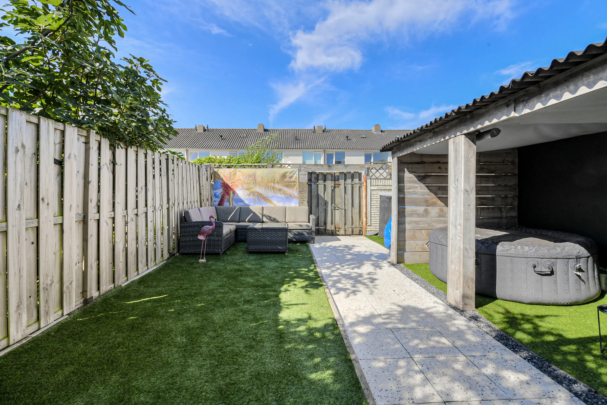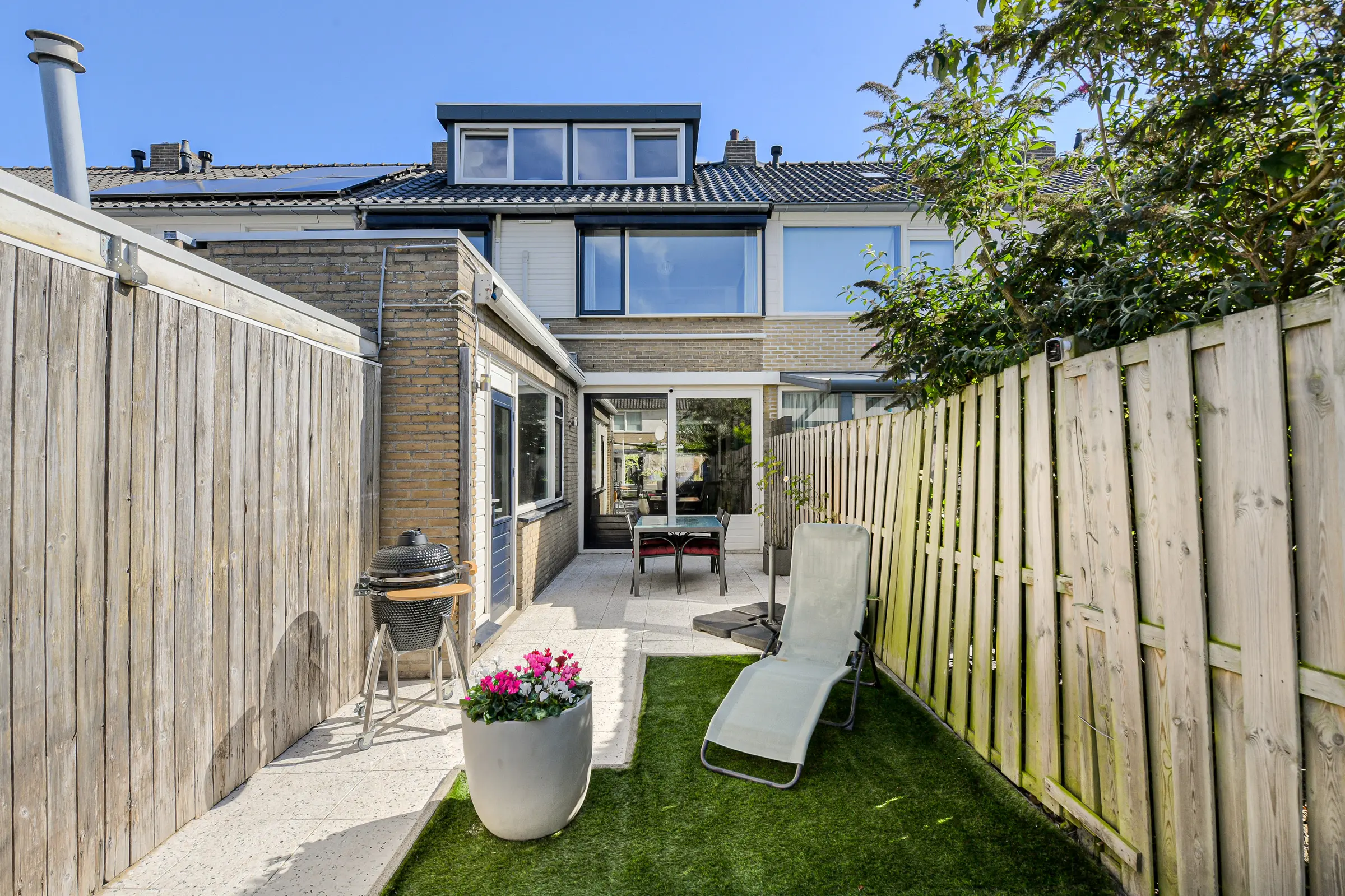 De achtertuin is een echte oase van rust en biedt veel privacy. Je kunt heerlijk buiten zitten onder de overkapping en genieten van de ruimte. De tuin is voorzien van sierbestrating en kunstgras, wat zorgt voor een onderhoudsvriendelijke buitenruimte. De berging met biedt veel opslagruimte voor bijvoorbeeld tuingereedschap, fietsen of motor. Via de achterom en het rolluik in de berging is de motor gemakkelijk te stallen..