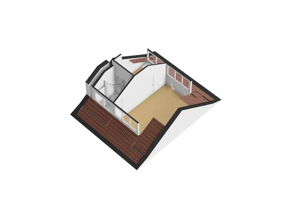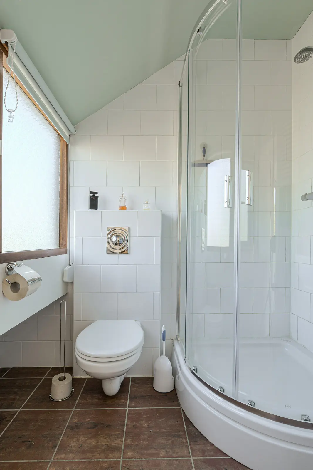 - Badkamer (2025) is voorzien van een douchecabine, een wastafel en een hangend closet.