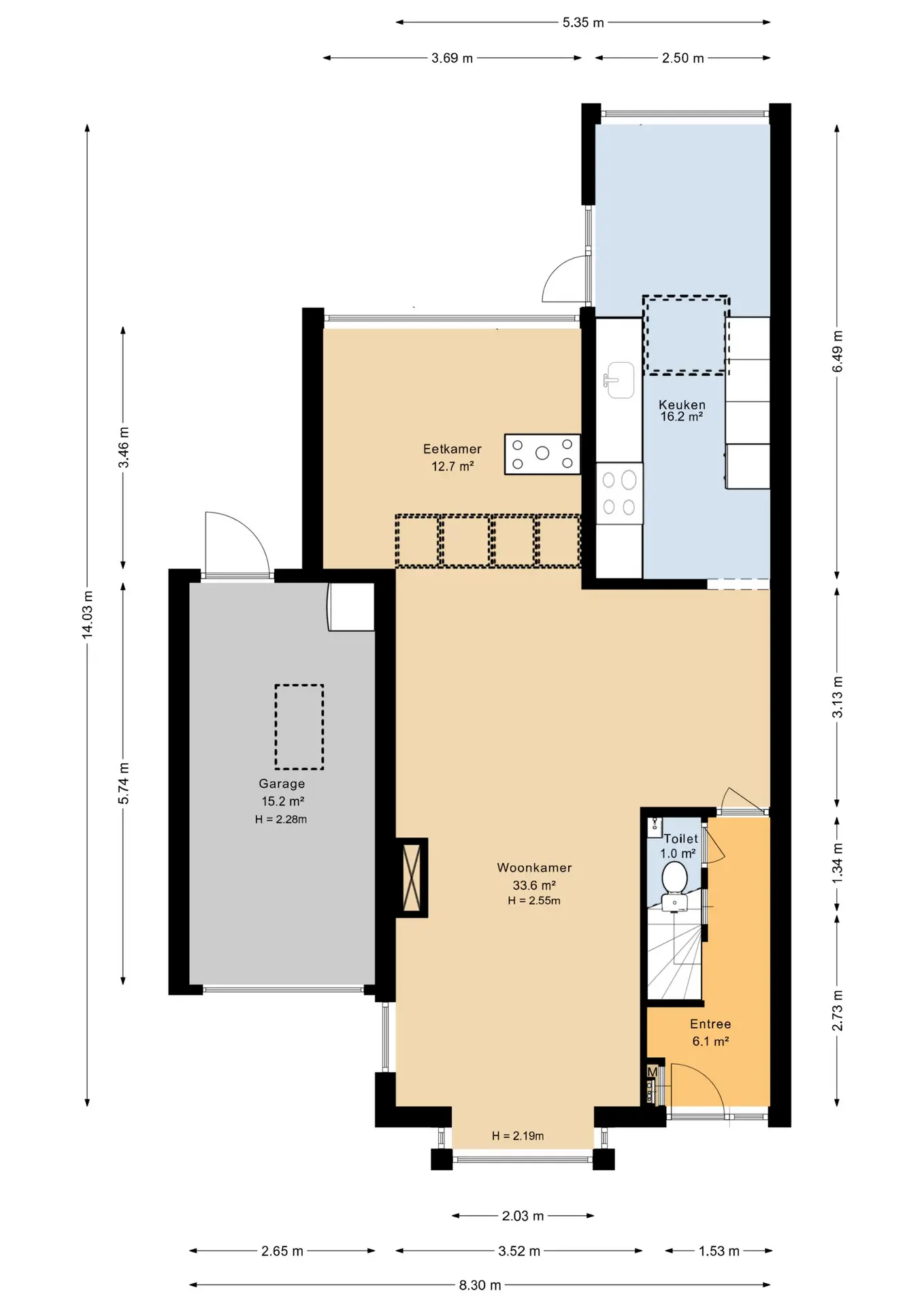 - Veel bergruimte en veel ruimte in het geheel door bergzolder boven de garage, uitbouw en nokverhoging