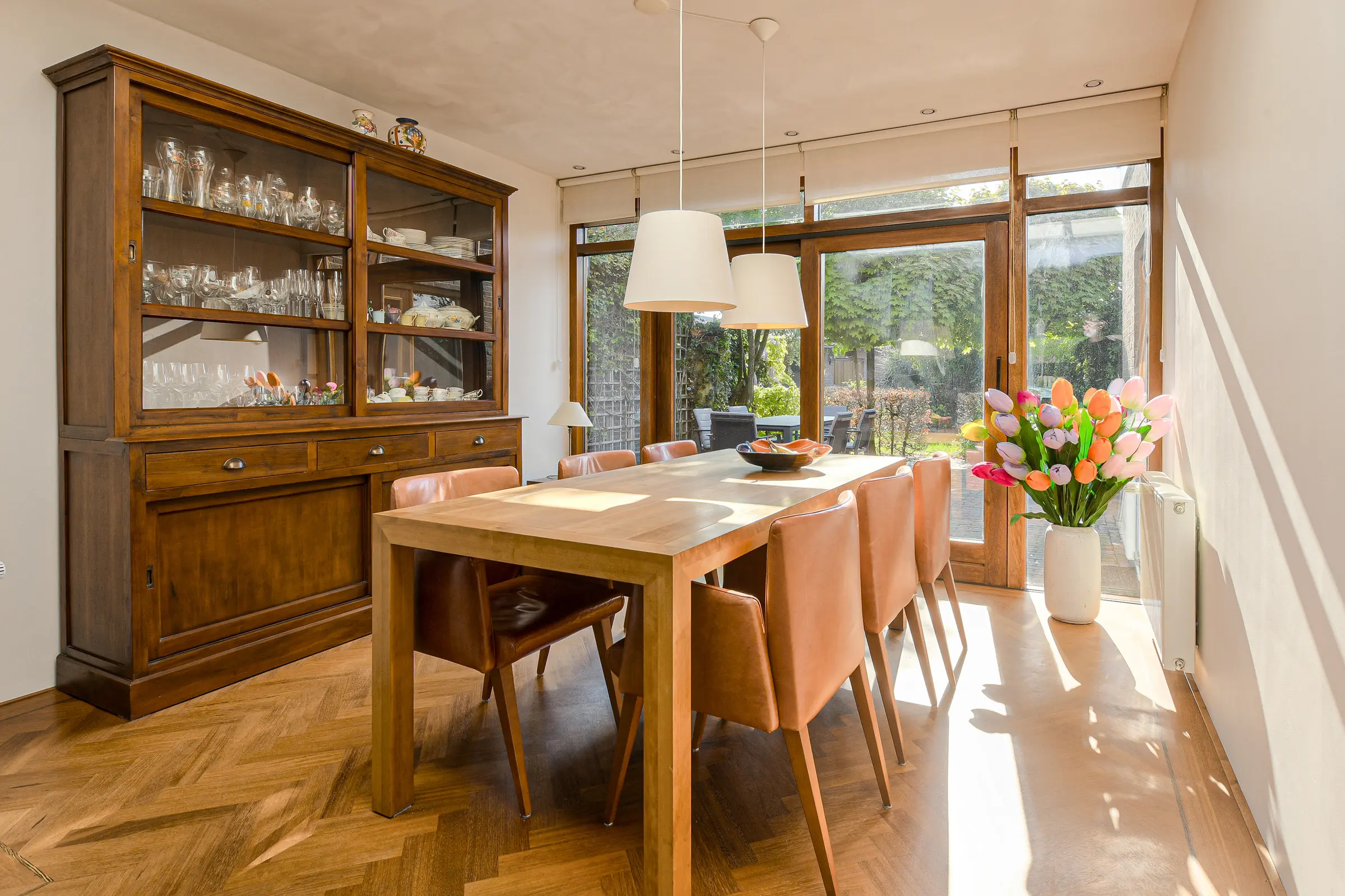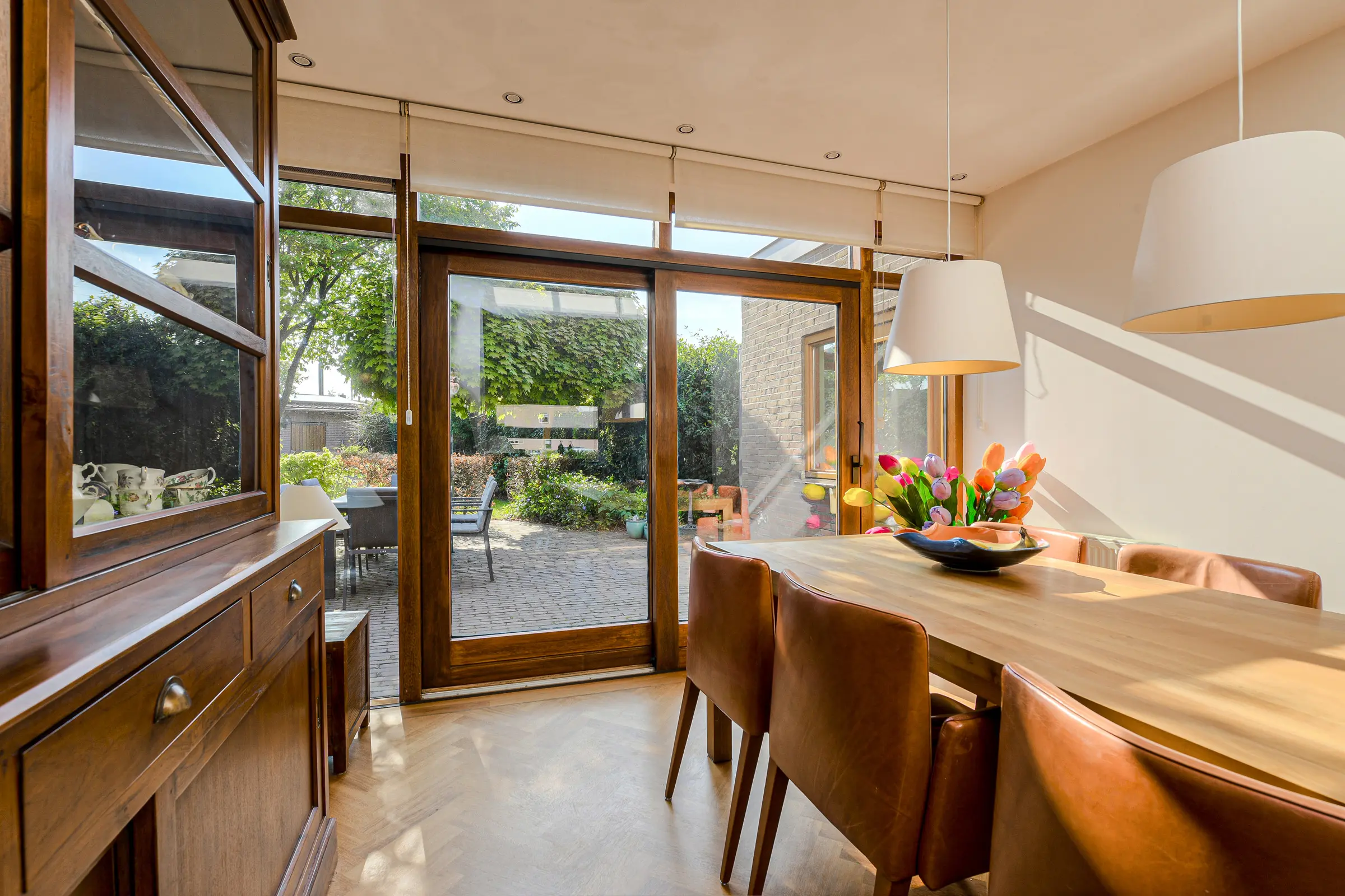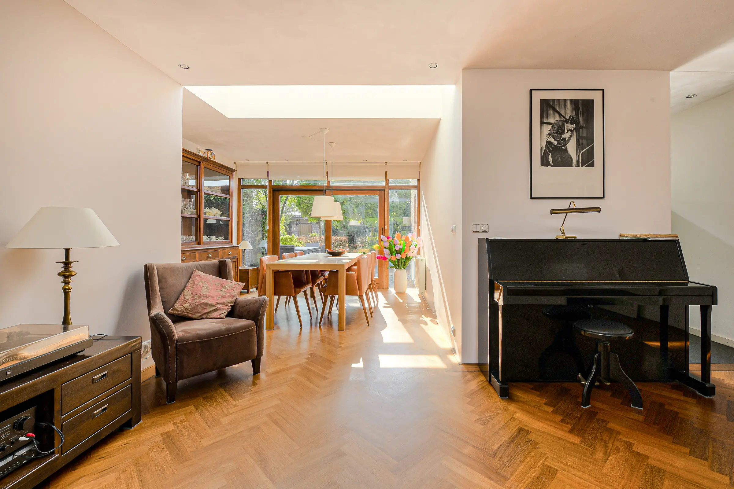 - Tuin/eetkamer (afm. 12.7 m2) eveneens voorzien van dezelfde visgraat vloer en ook hier weer heel veel lichtinval door de lichtstraat en de grote schuifpui;