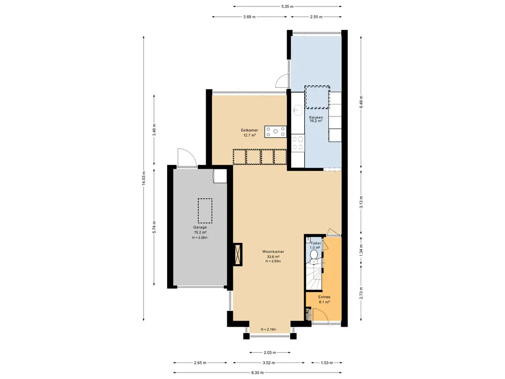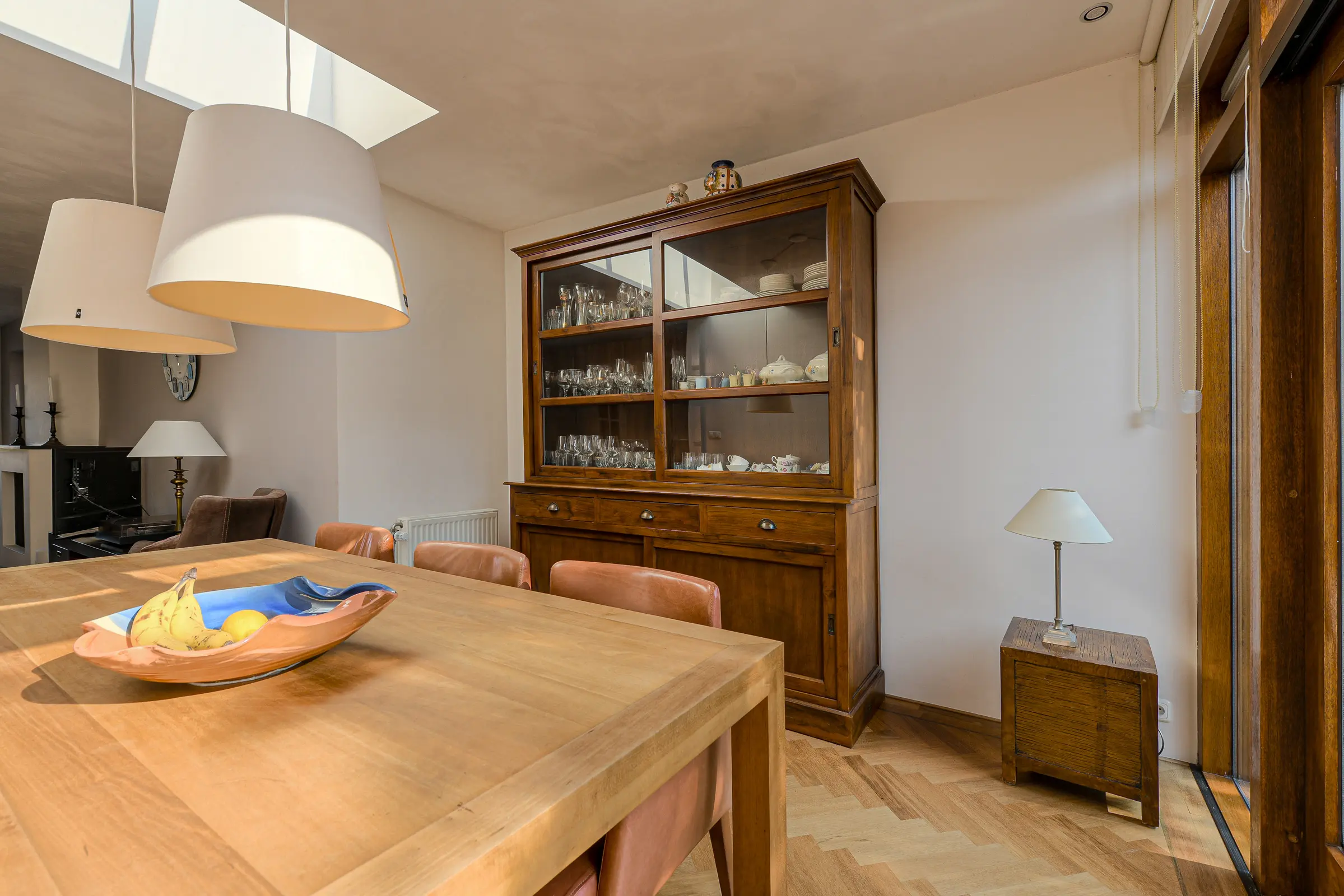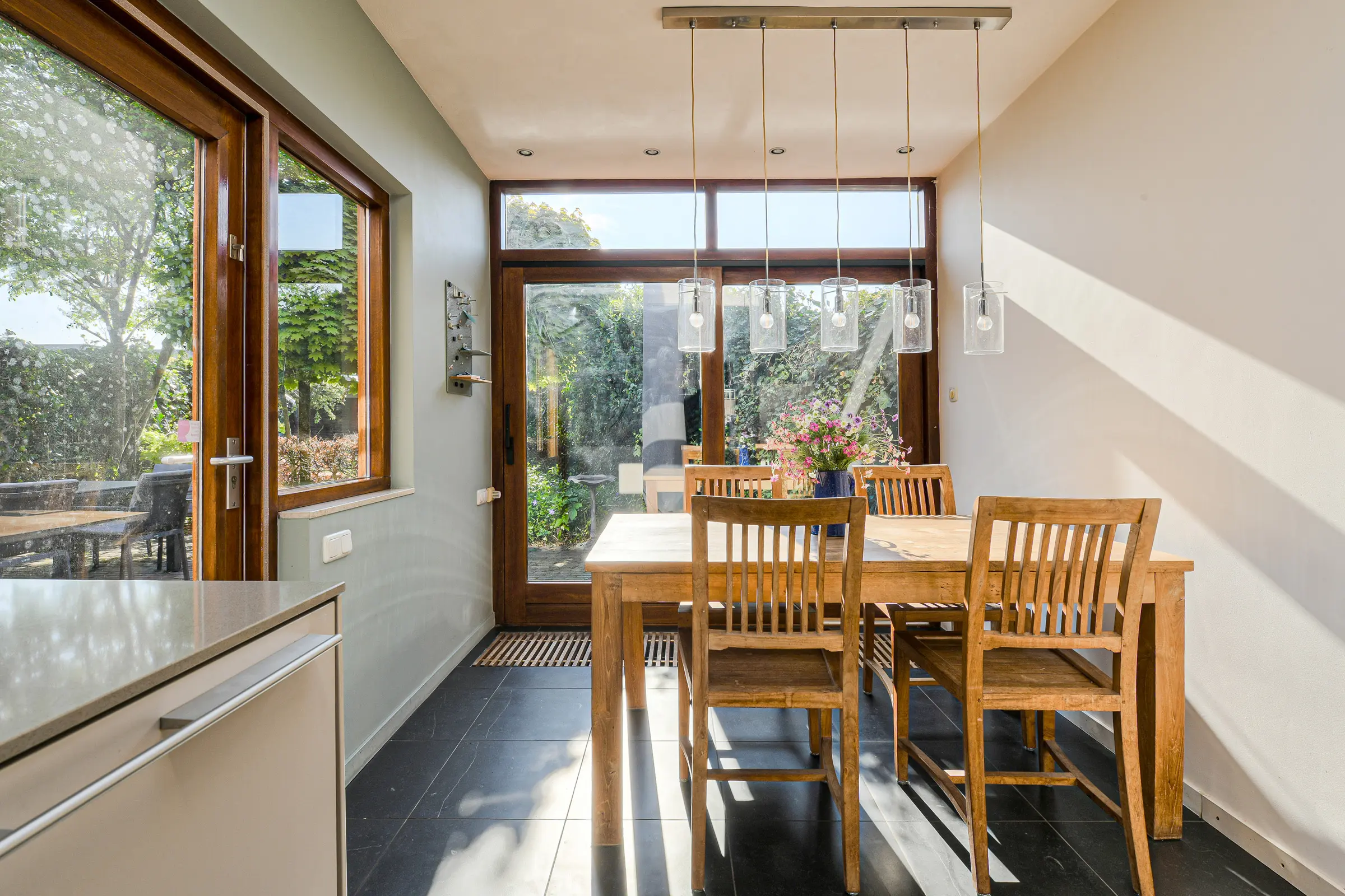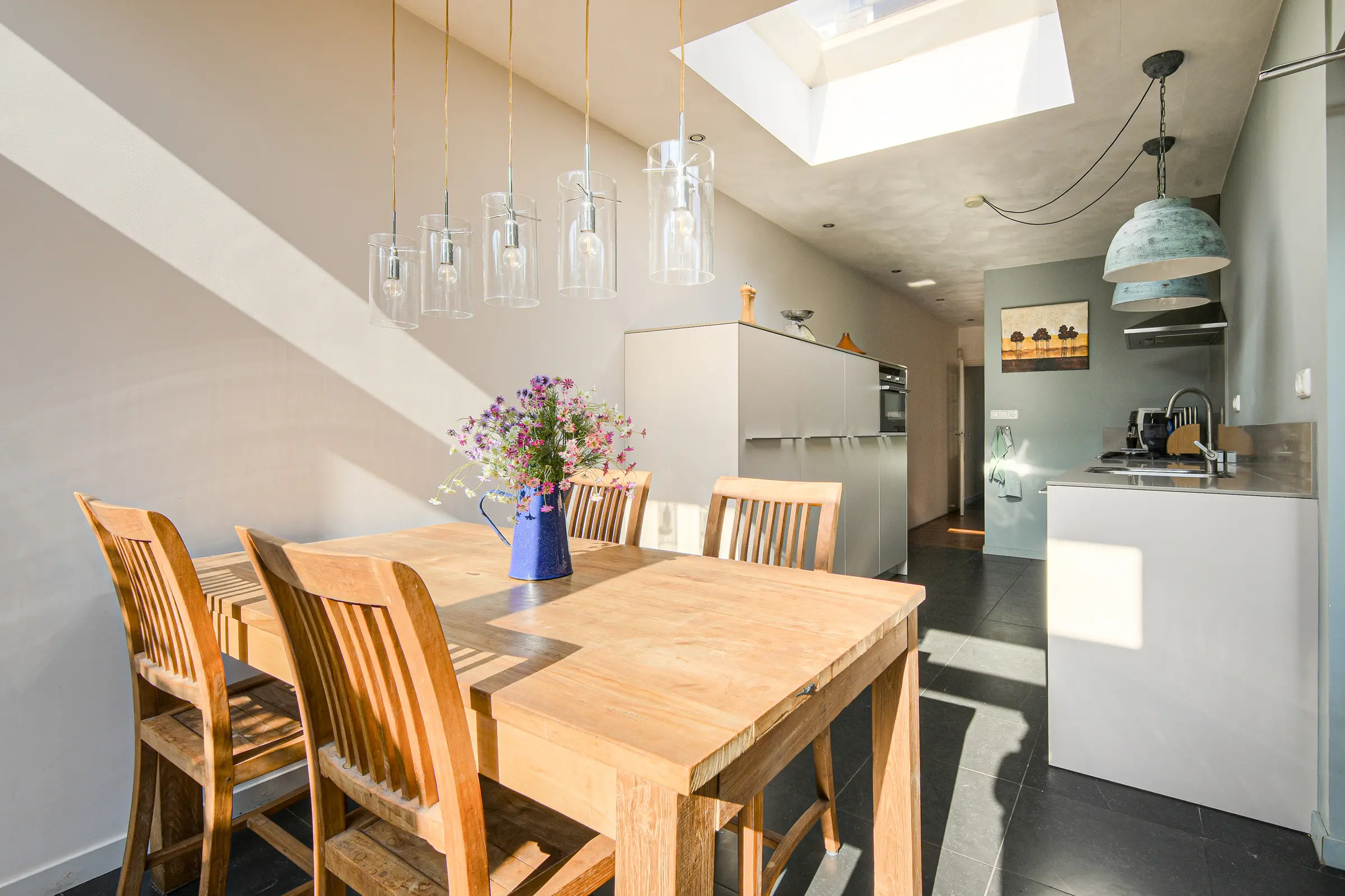 - Tuin/eetkamer (afm. 12.7 m2) eveneens voorzien van dezelfde visgraat vloer en ook hier weer heel veel lichtinval door de lichtstraat en de grote schuifpui;