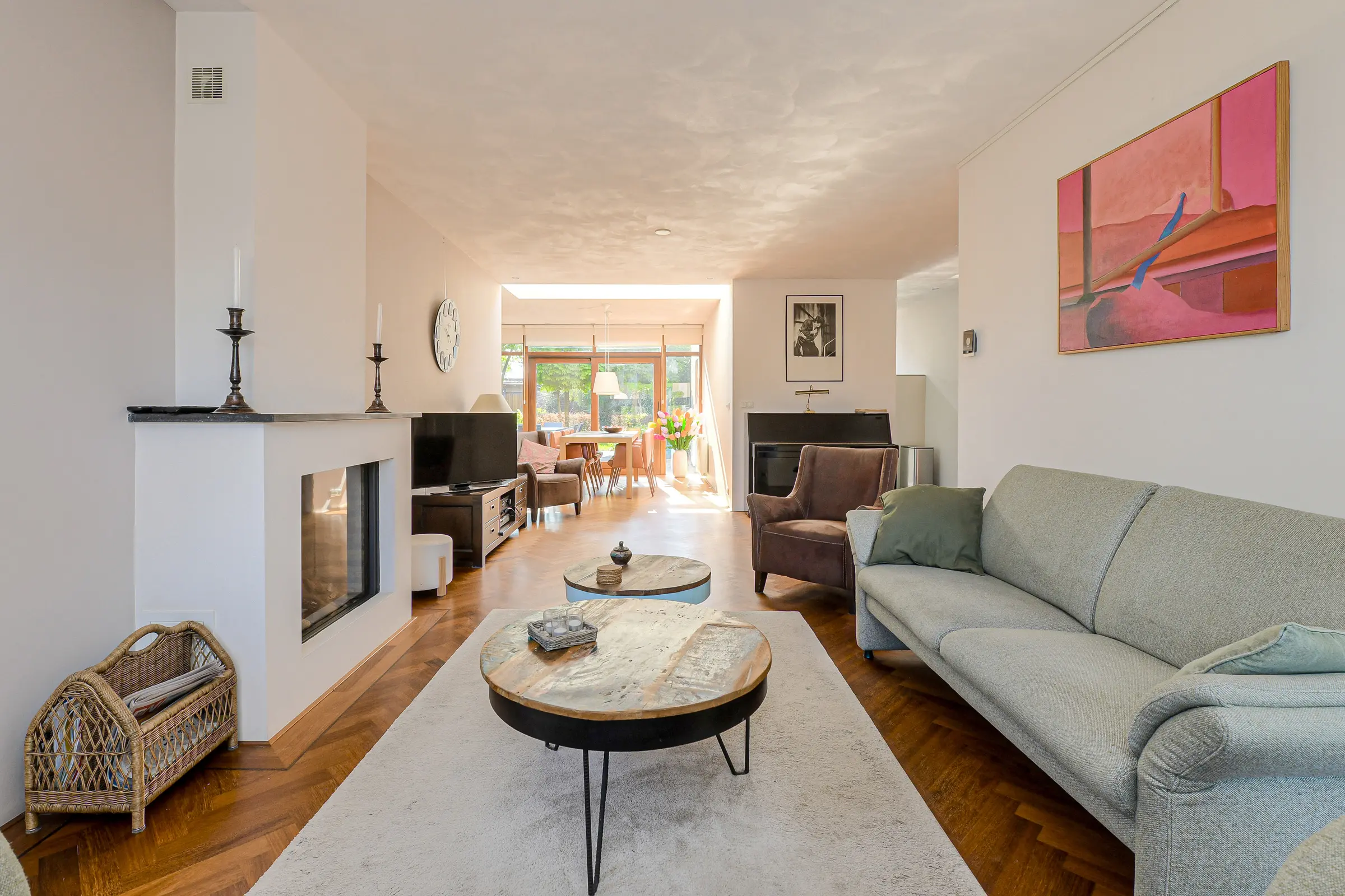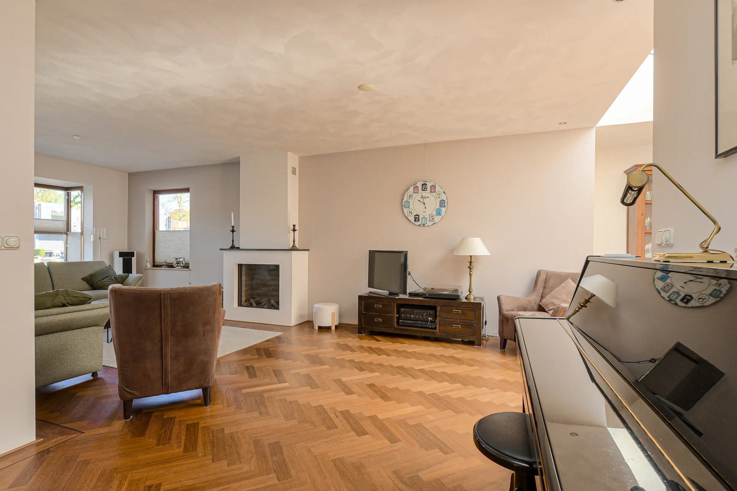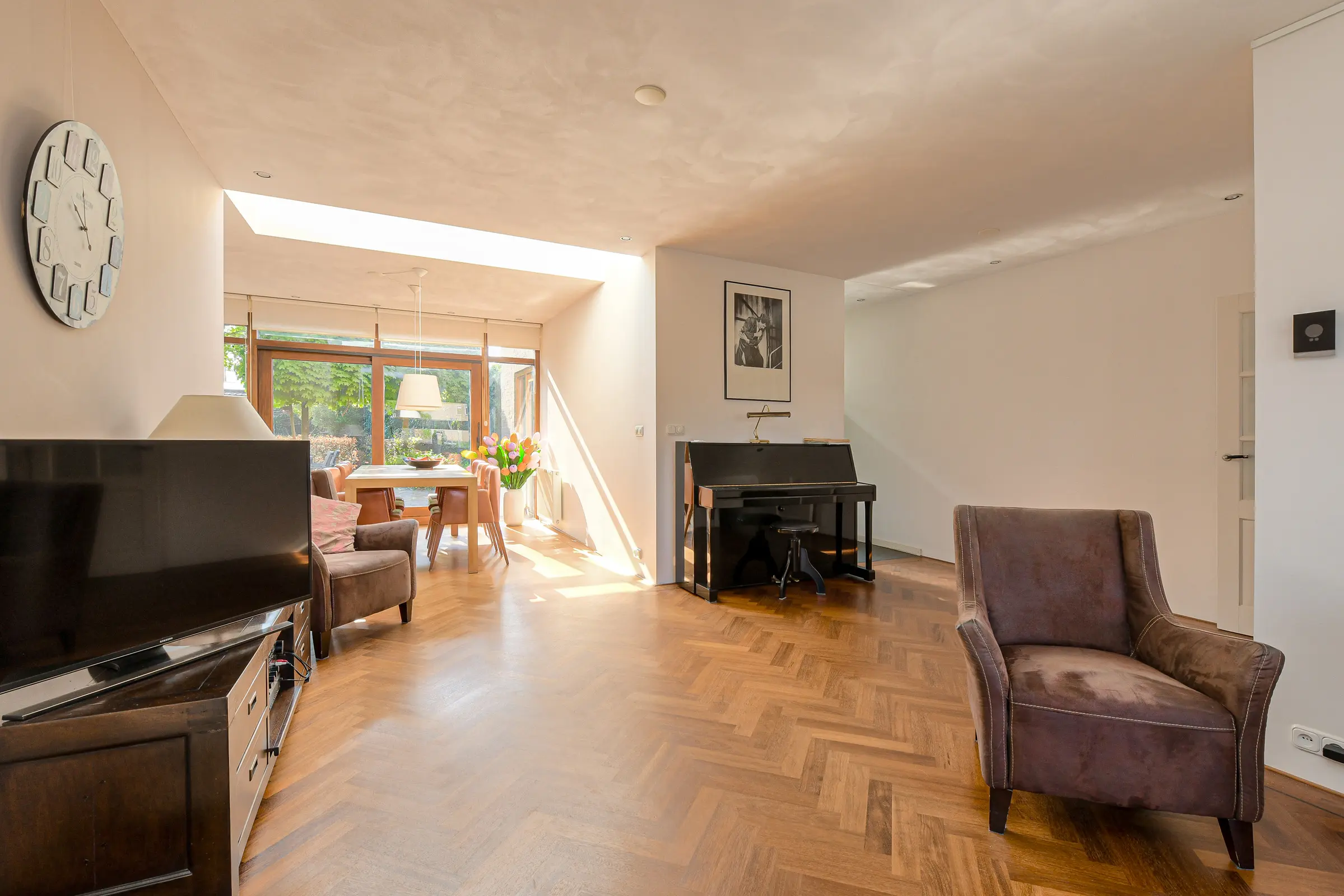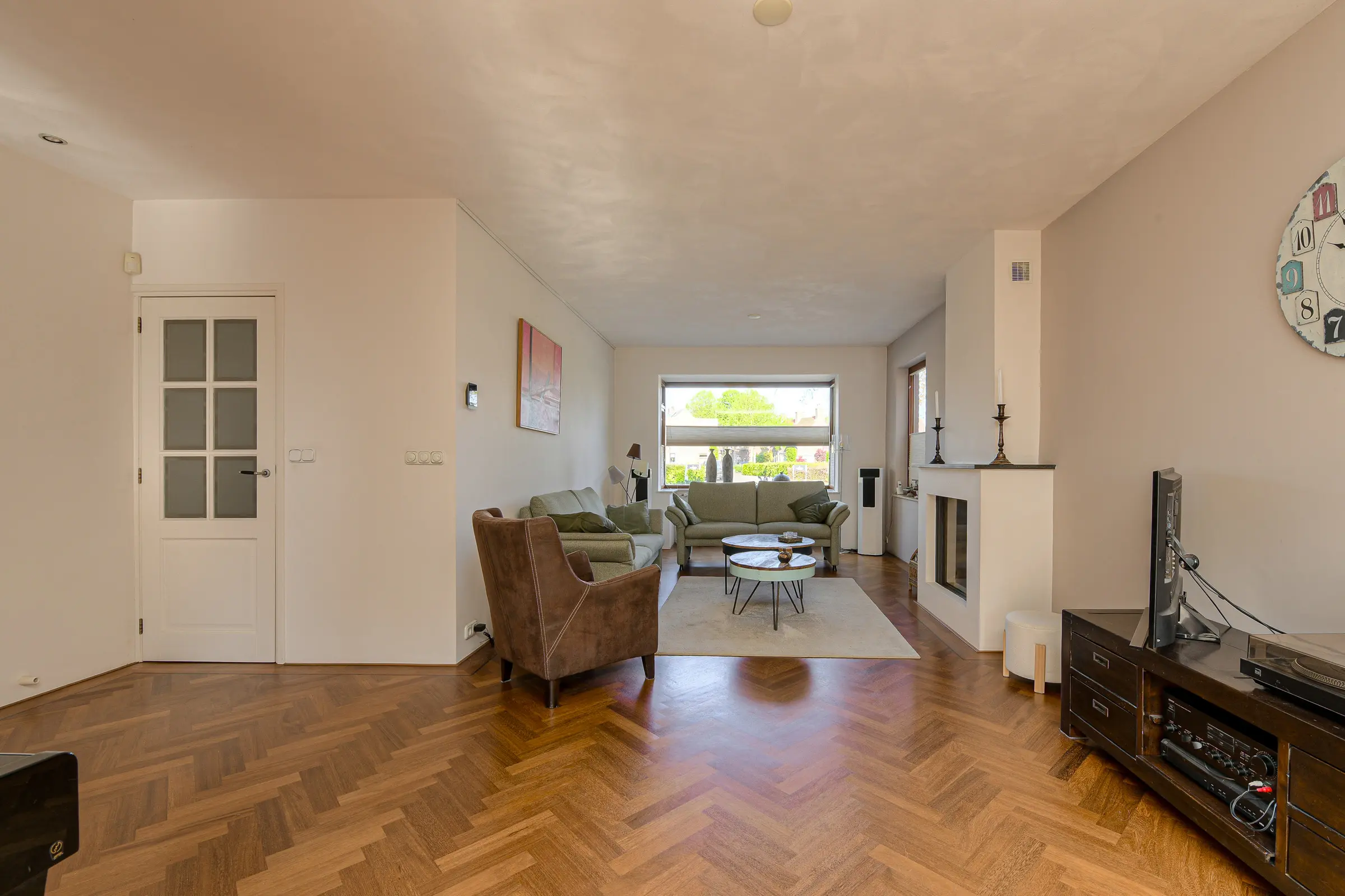- Woonkamer (afm. 33,6 m2) voorzien van een Afzelia houten visgraat vloer, een gashaard en een erker waar veel licht doorheen komt;