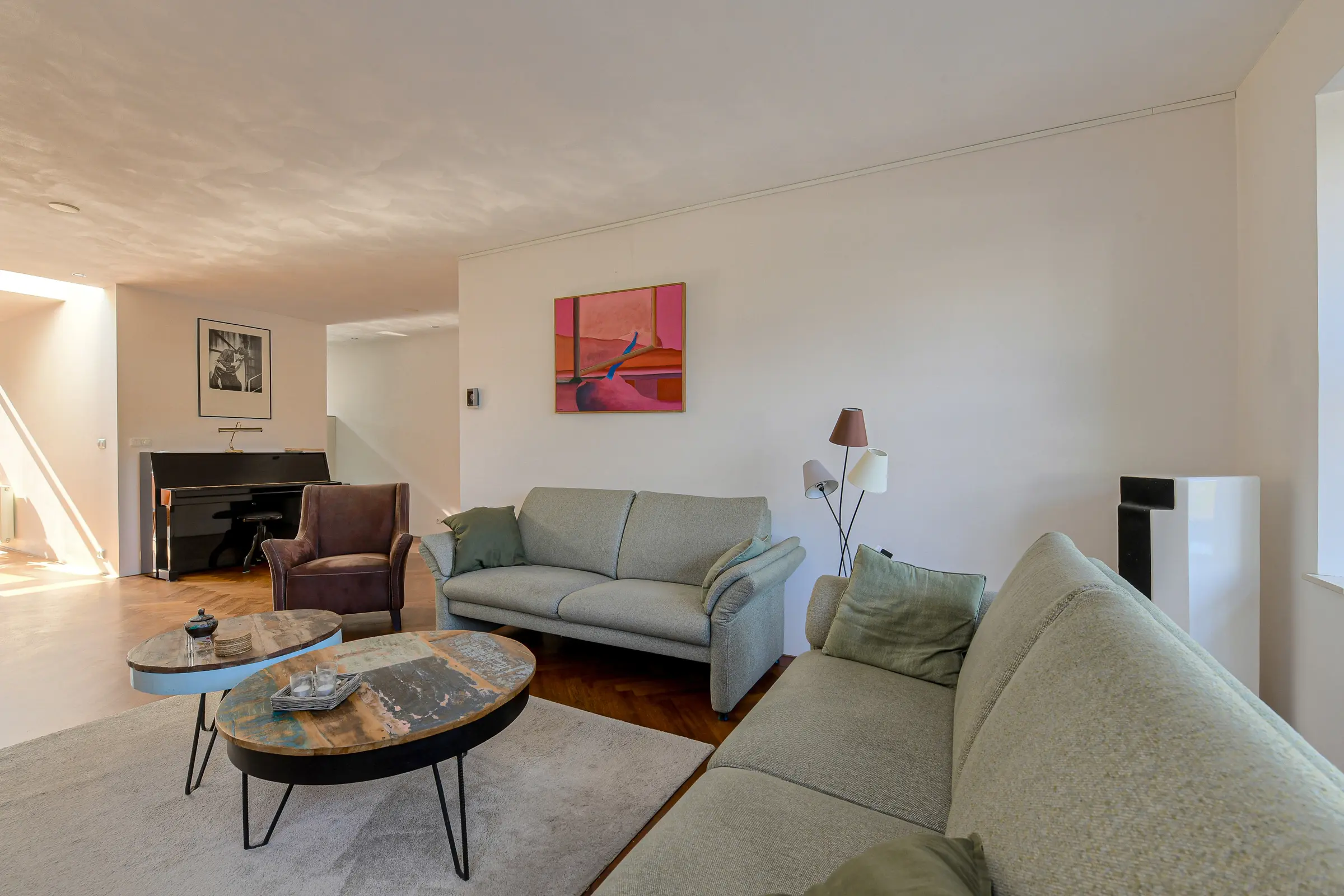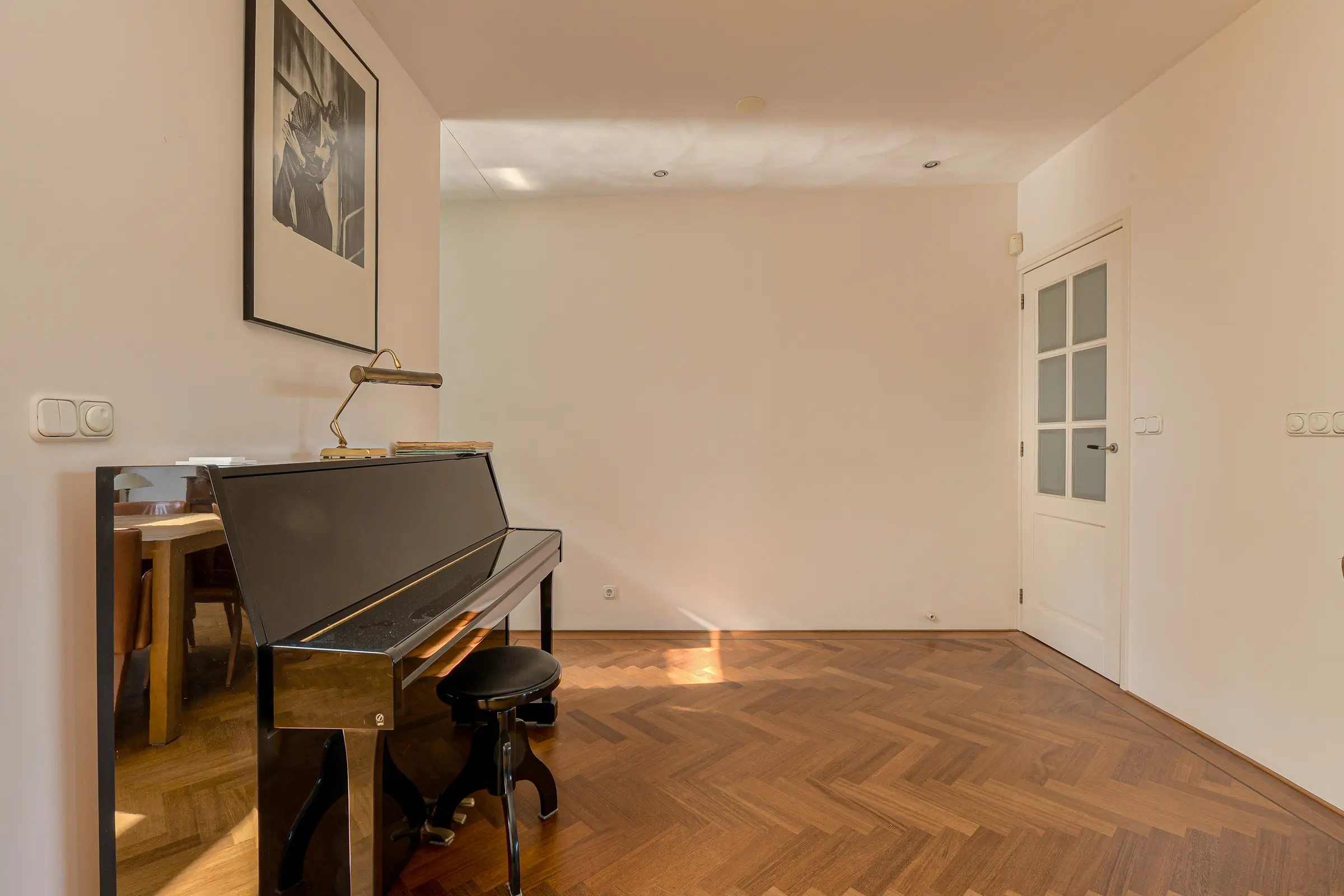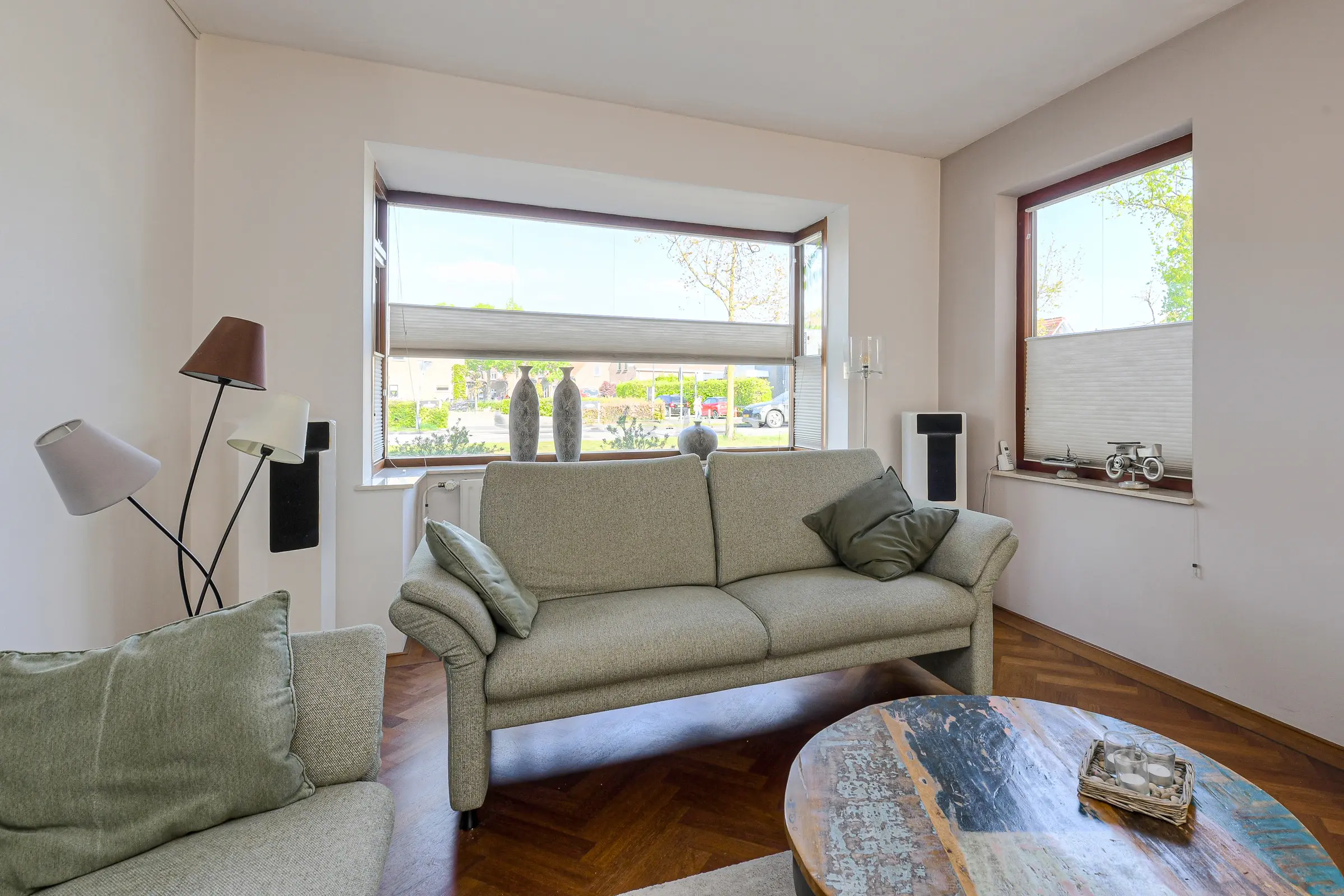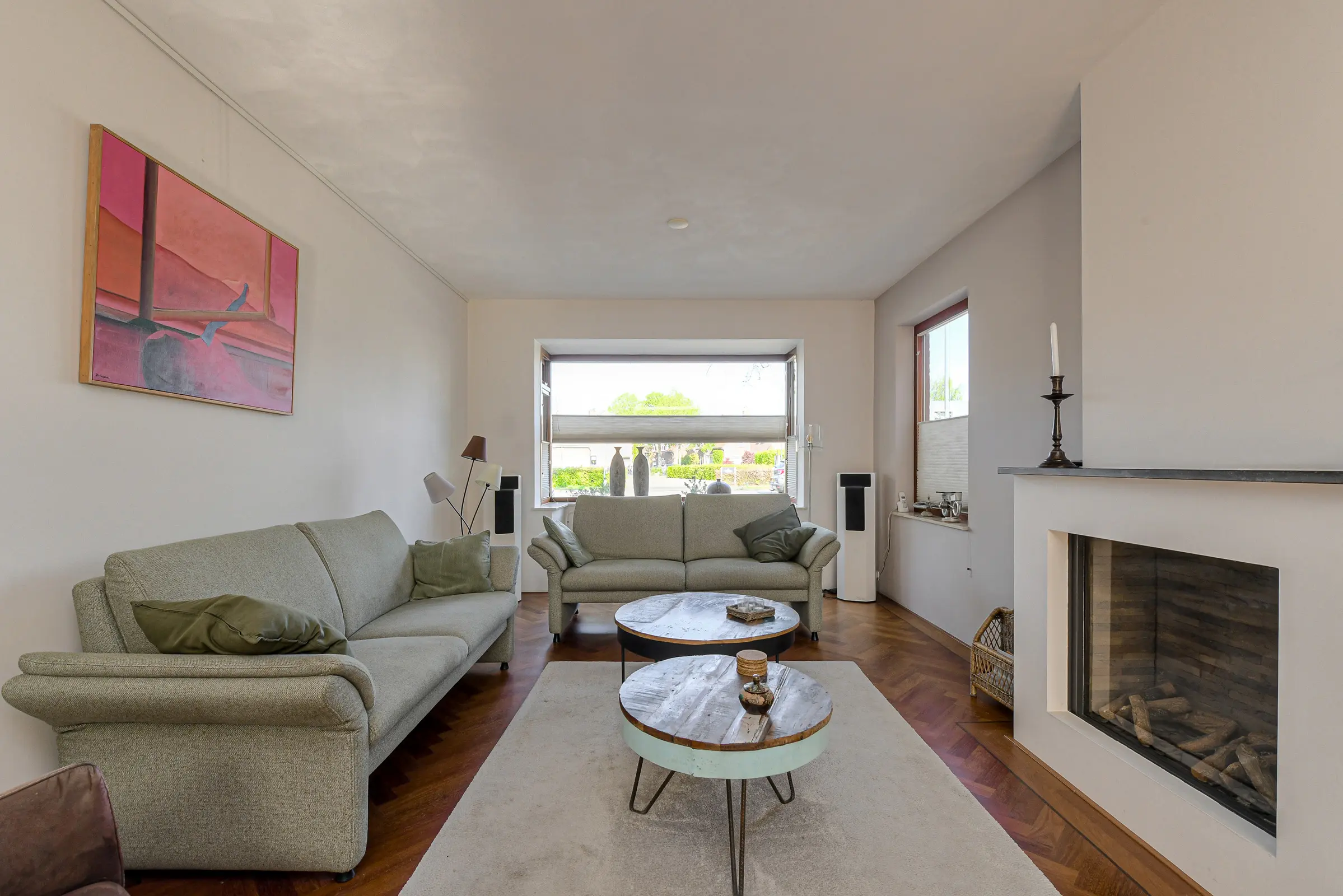 - Woonkamer (afm. 33,6 m2) voorzien van een Afzelia houten visgraat vloer, een gashaard en een erker waar veel licht doorheen komt;