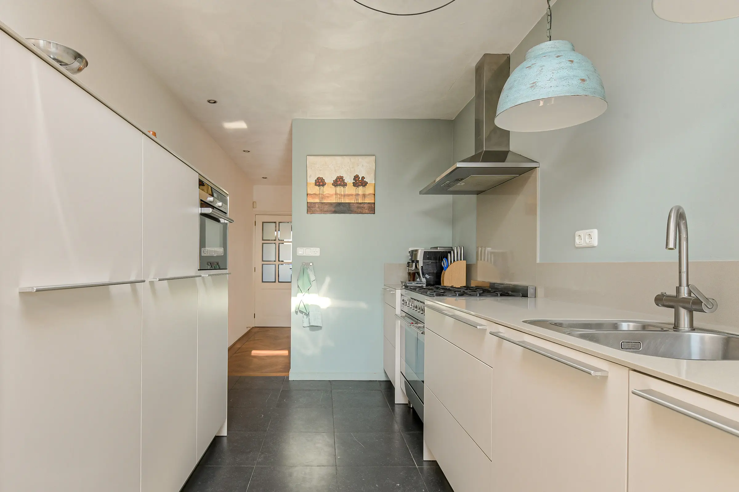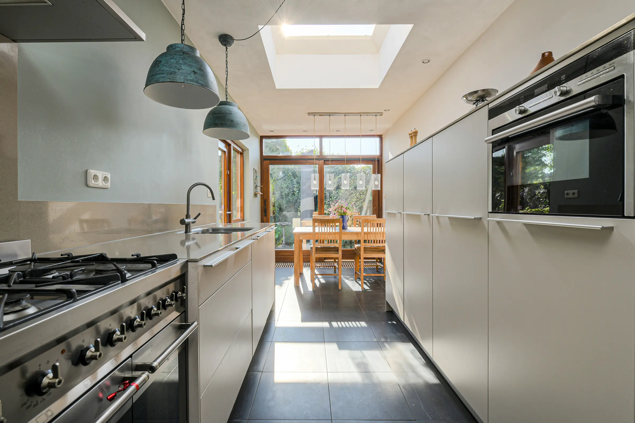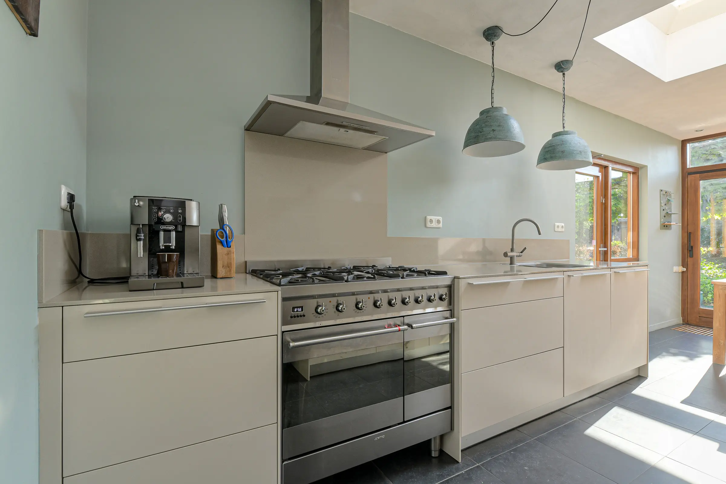 - Leefkeuken voorzien van een plavuizenvloer, ook hier weer veel lichtinval door zowel een schuifpui als een lichtkoepel. Ook is er een aparte tuindeur. De keukeninrichting staat een 2 kanten en biedt veel bergruimte en is voorzien van een composiet blad en diverse apparatuur zoals combimagnetron, Smeg fornuis met 6 pits kookplaat en 2 ovens, vaatwasmachine, een kraan met kokend water, RVS afzuigkap en een koelkast.