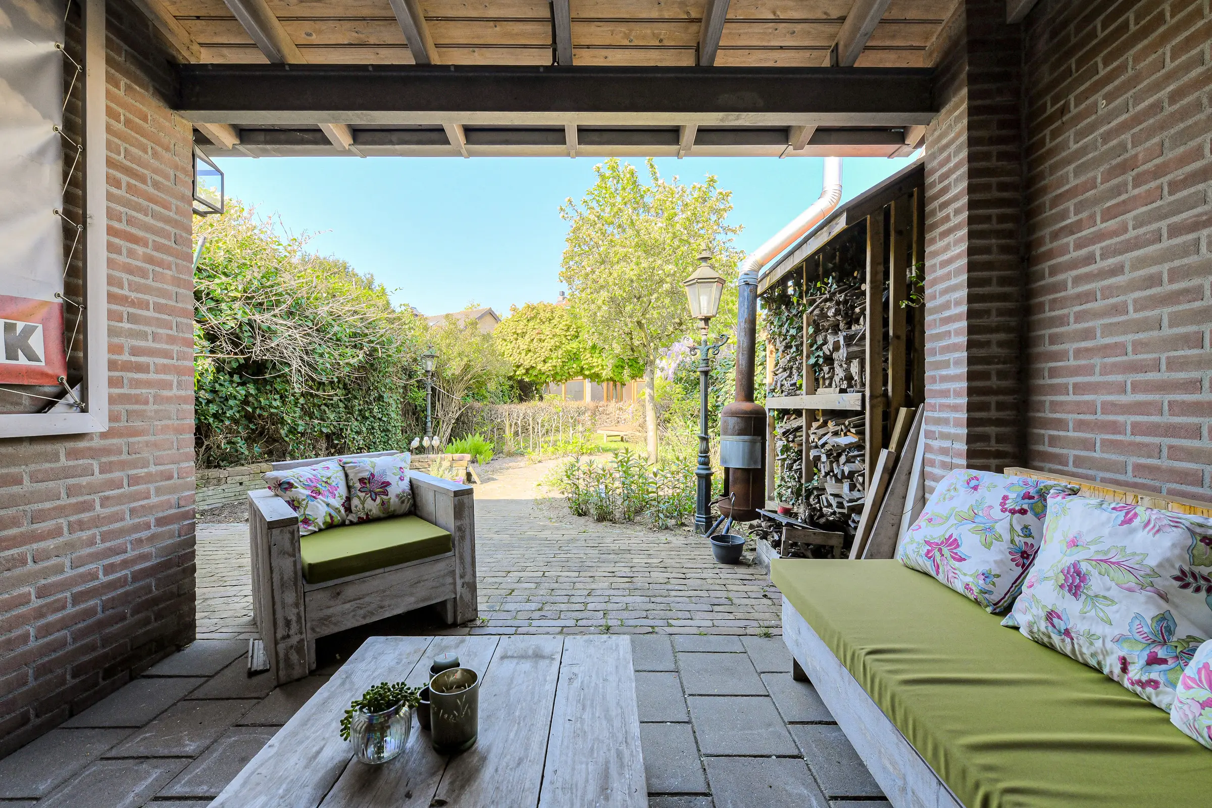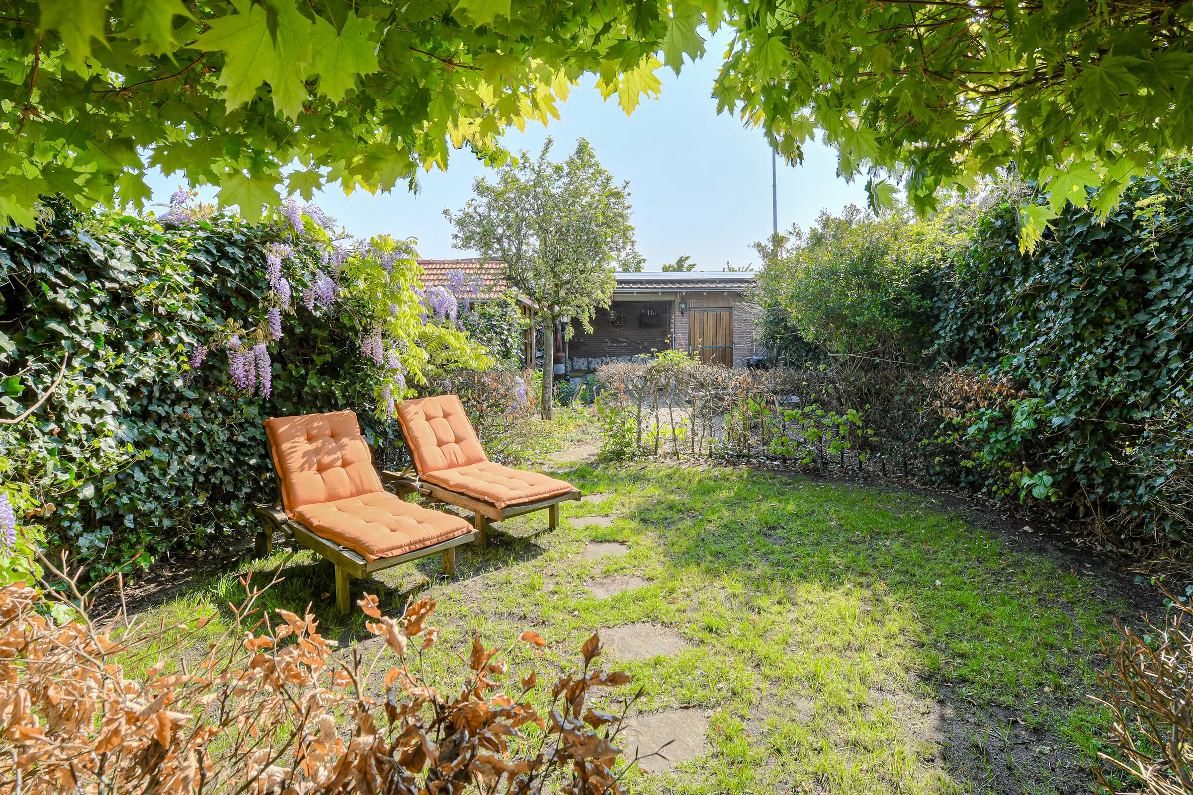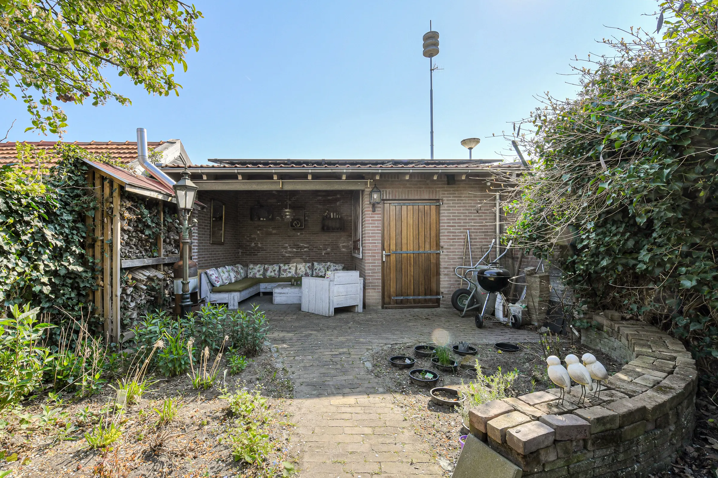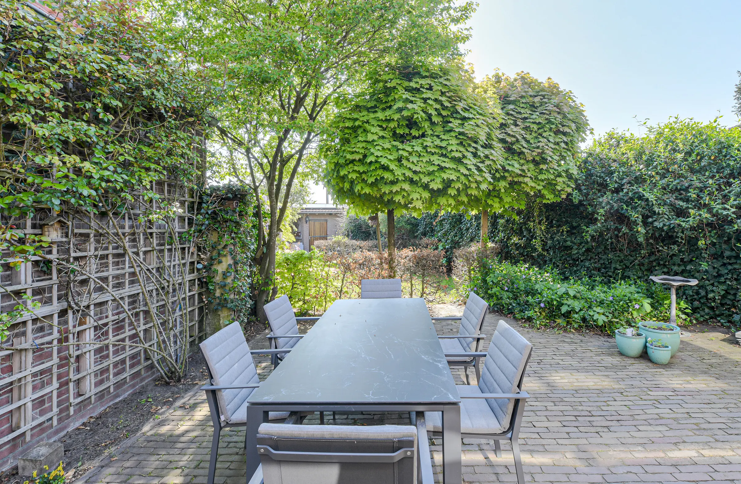 De achtertuin is heeft 2 terrassen met sierbestrating, een gazon, borders met vaste beplanting en achterop het perceel, achter in de tuin is een berging en een fraai overkapping. De berging is voorzien van elektra en er liggen leidingen voor water en afvoer van het water.
