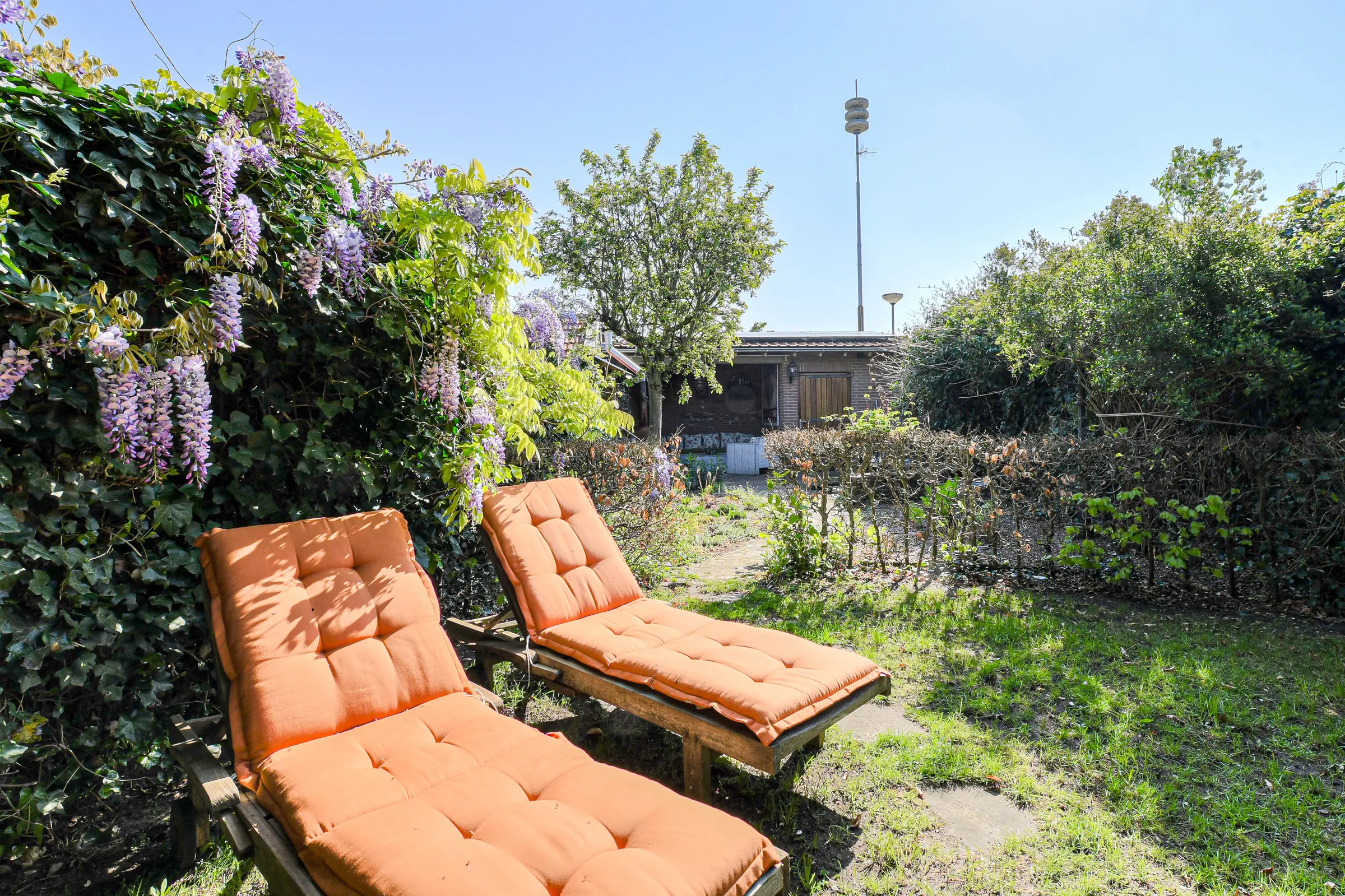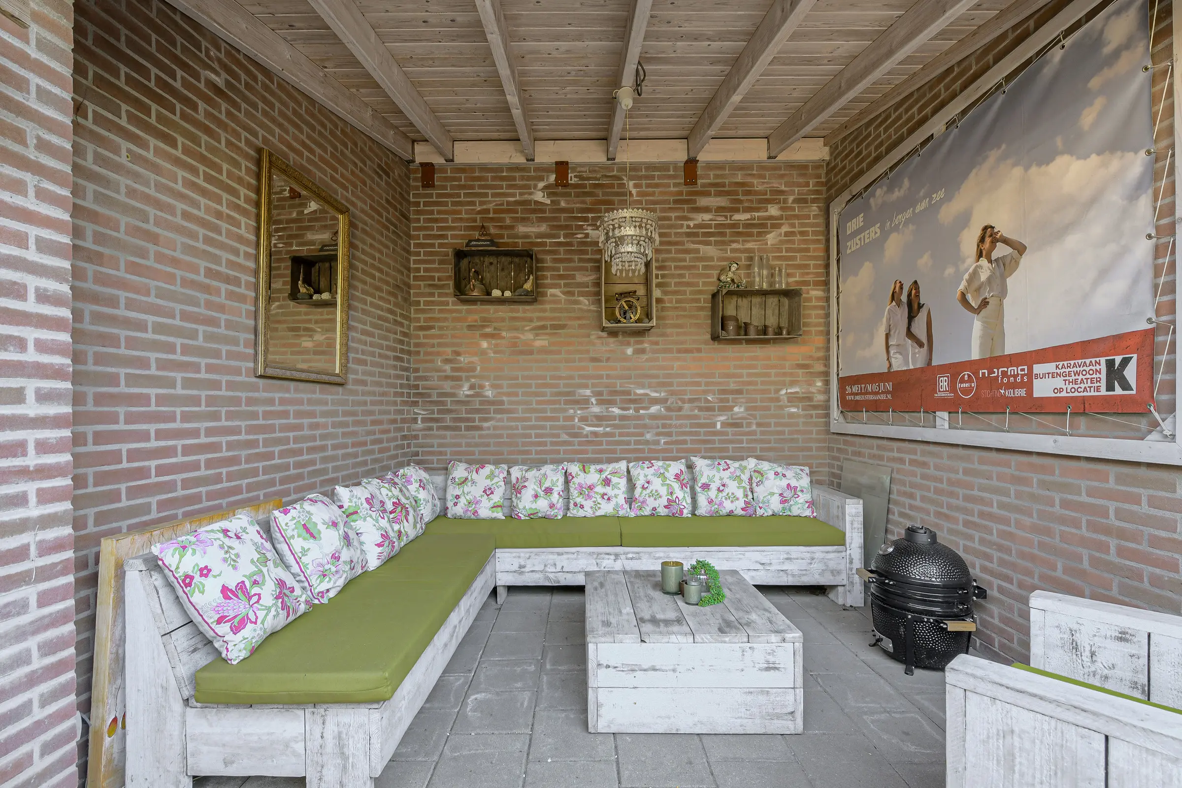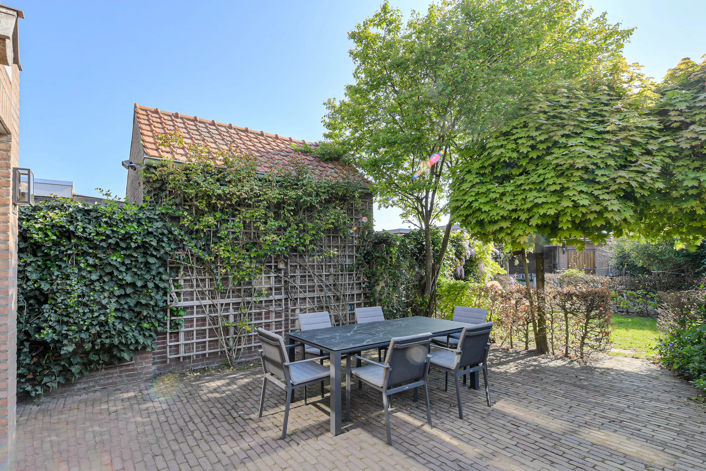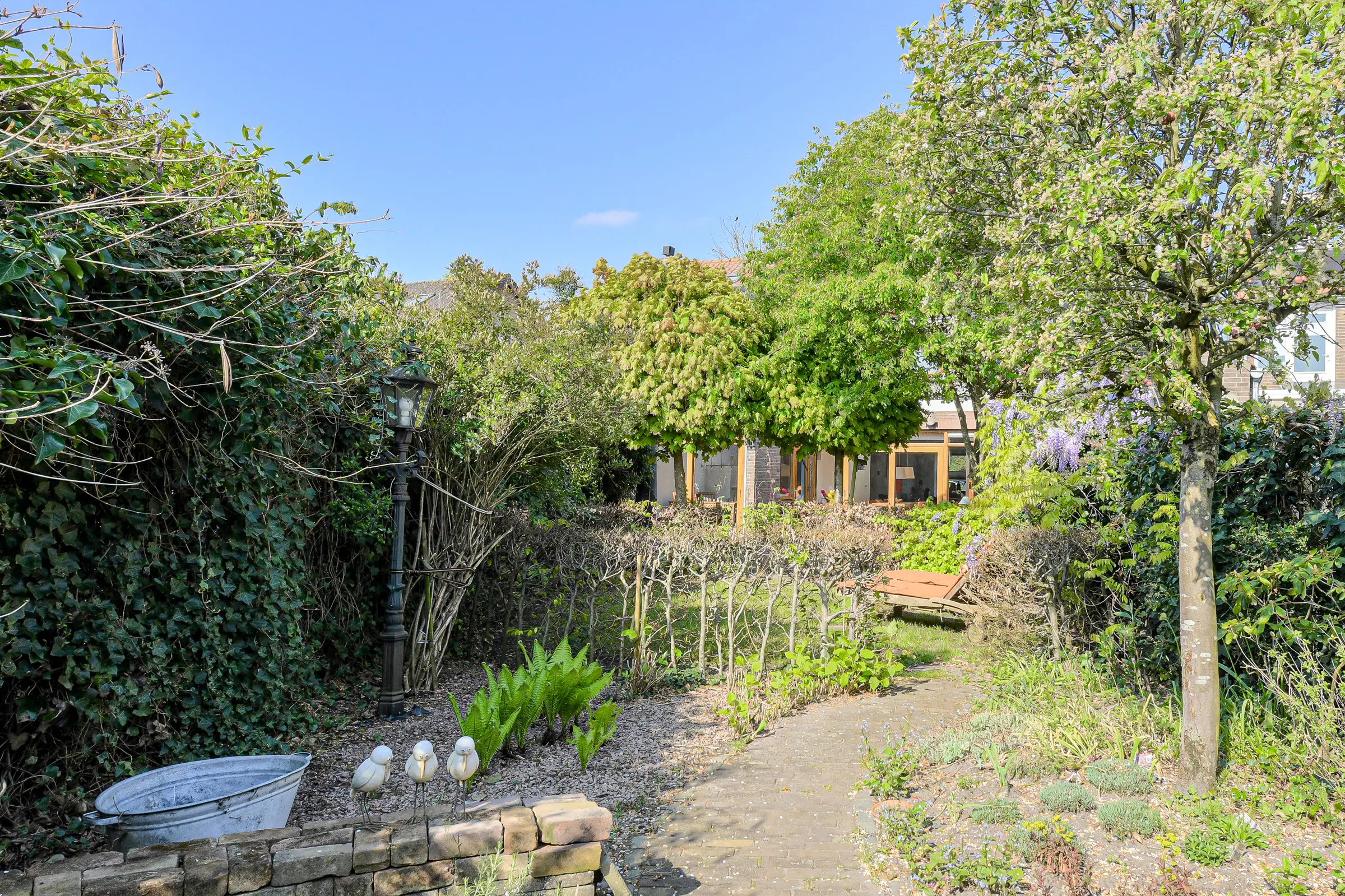 De achtertuin is heeft 2 terrassen met sierbestrating, een gazon, borders met vaste beplanting en achterop het perceel, achter in de tuin is een berging en een fraai overkapping. De berging is voorzien van elektra en er liggen leidingen voor water en afvoer van het water.