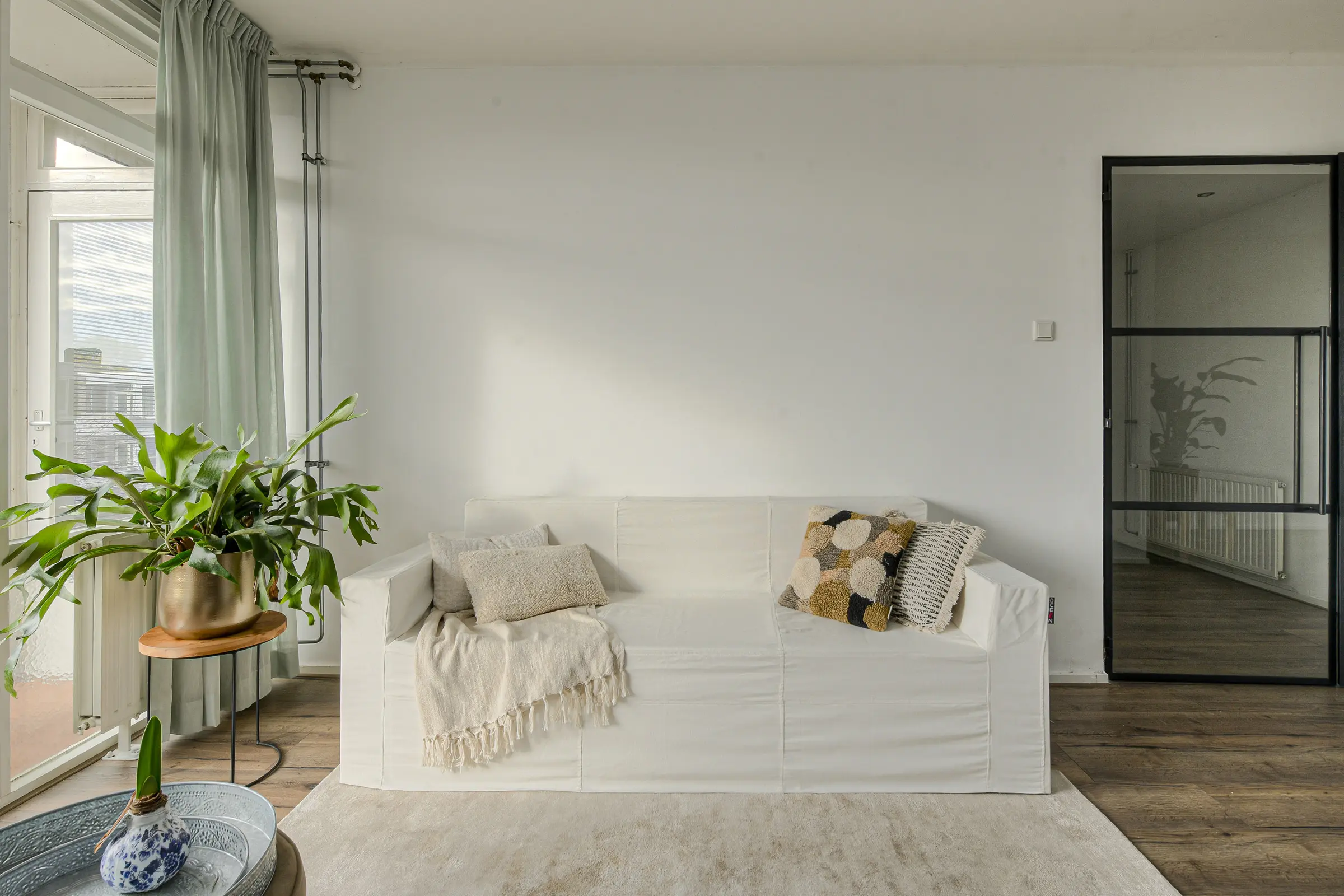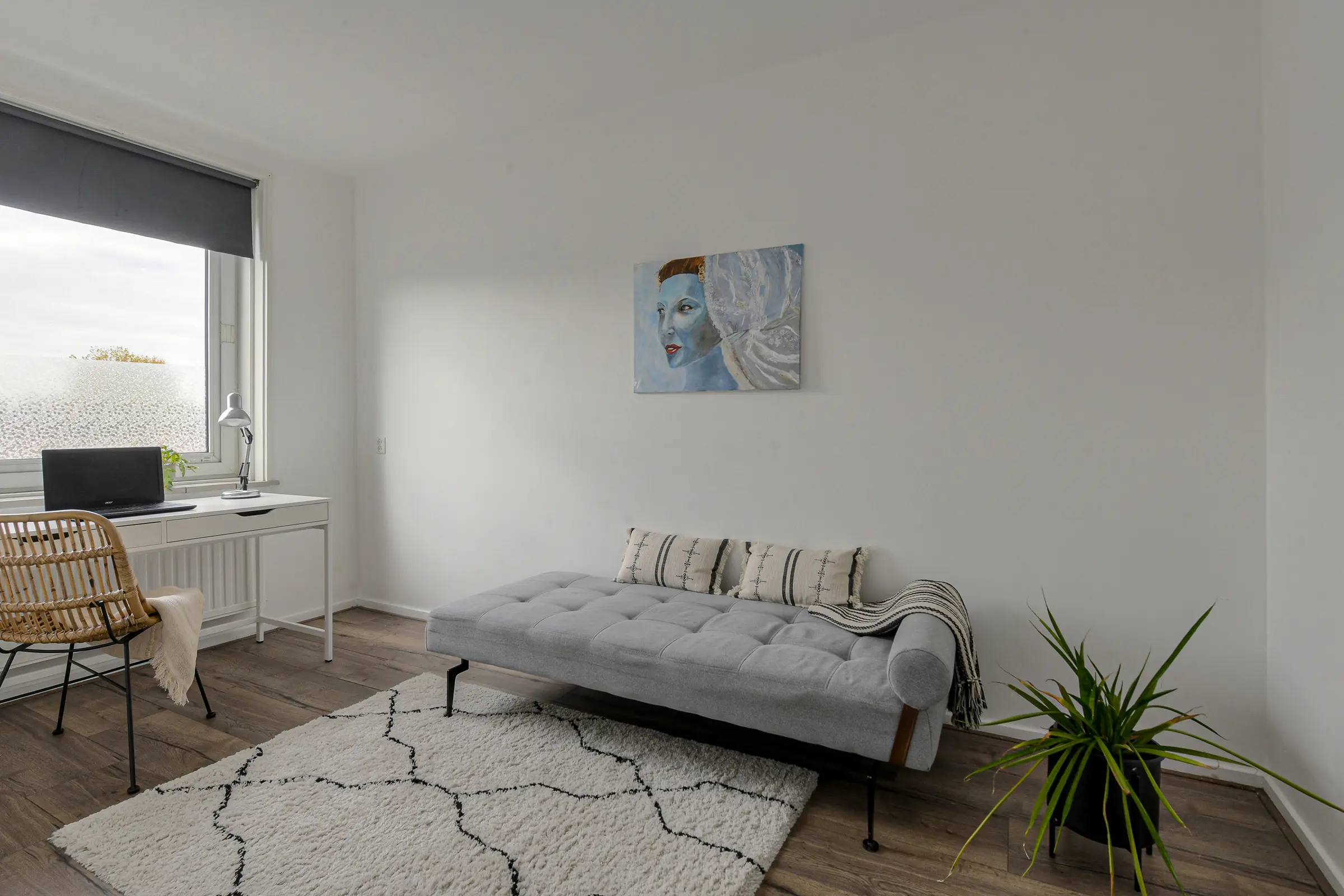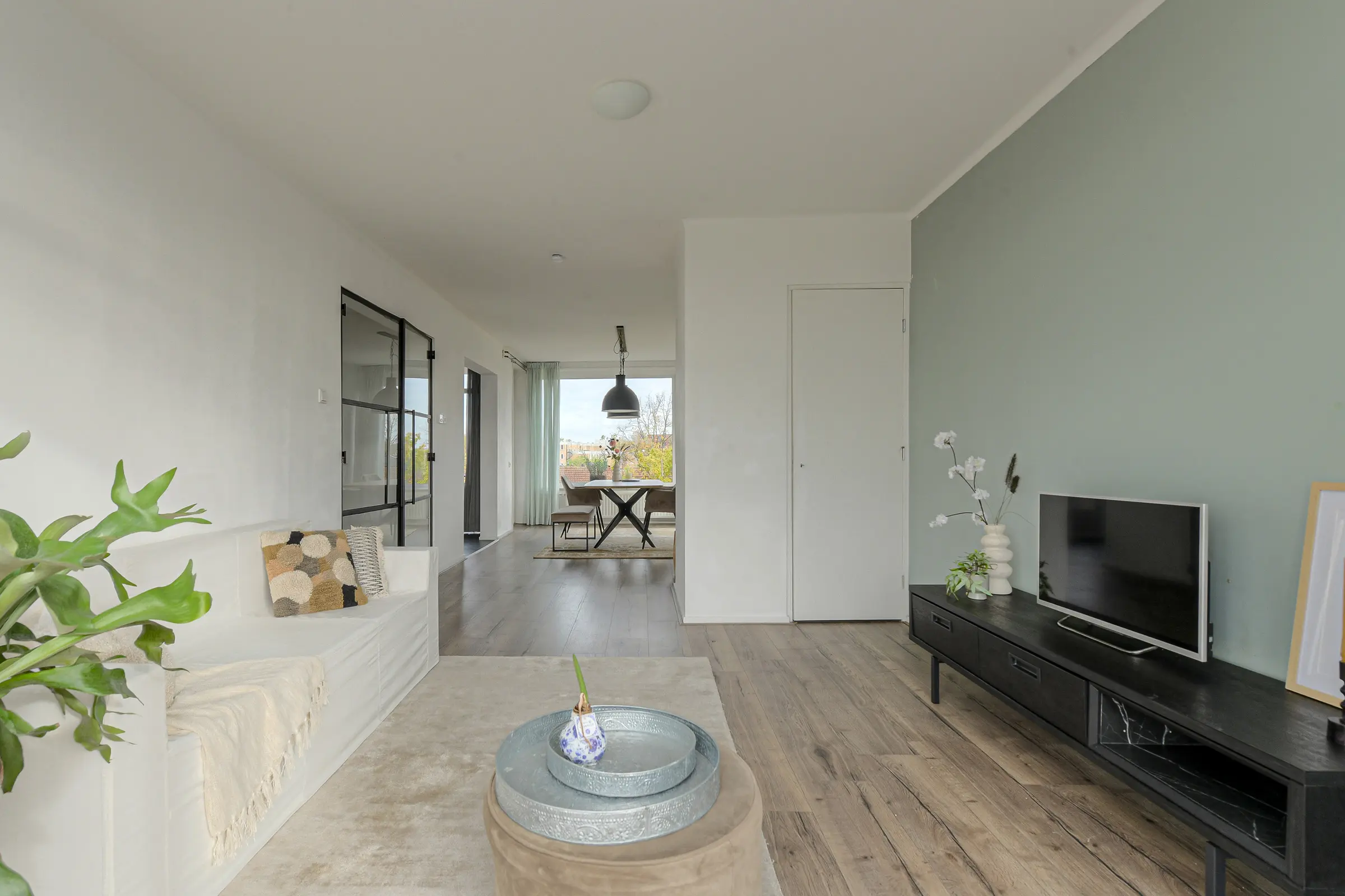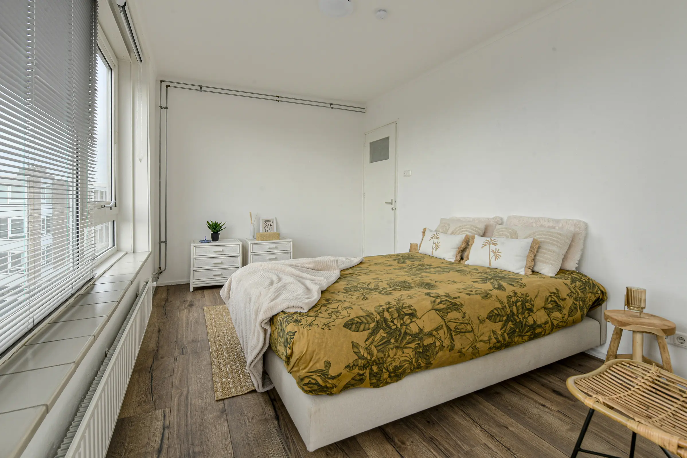 * Door het hele appartement (m.u.v. badkamer en keuken) ligt een doorlopende laminaatvloer, wat zorgt voor een rustige en ruimtelijke uitstraling.
