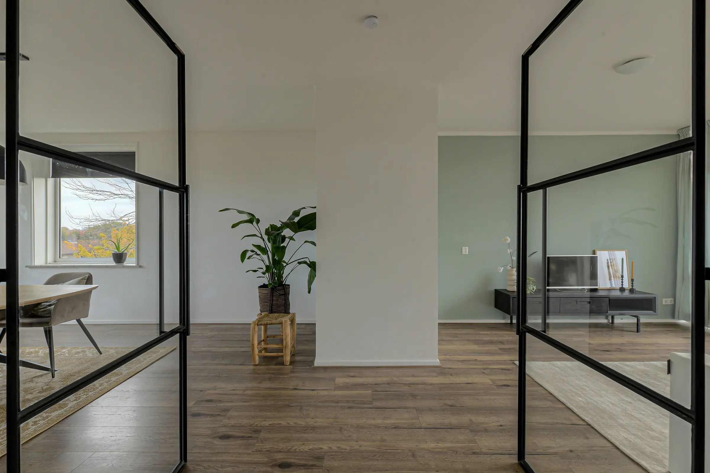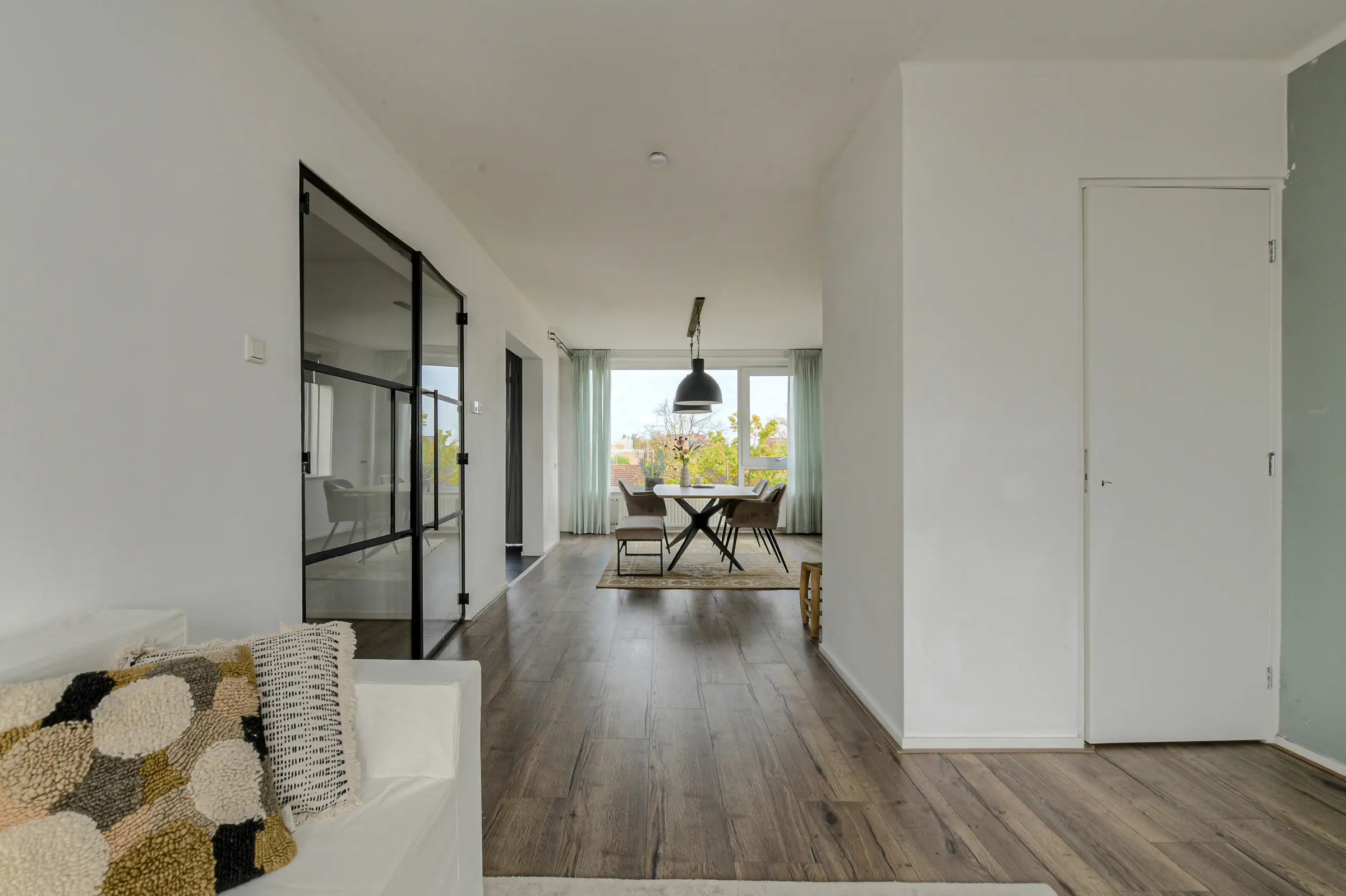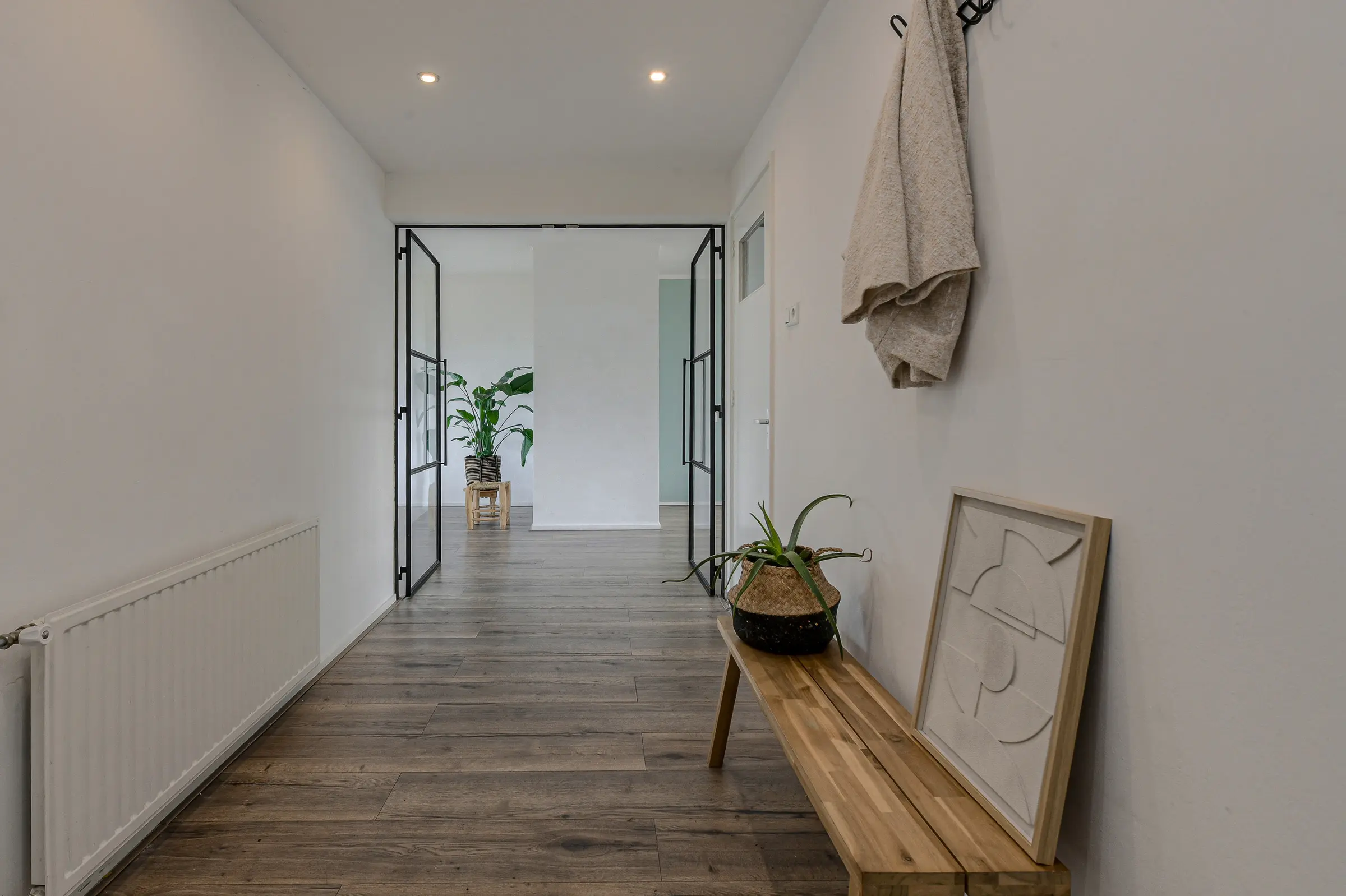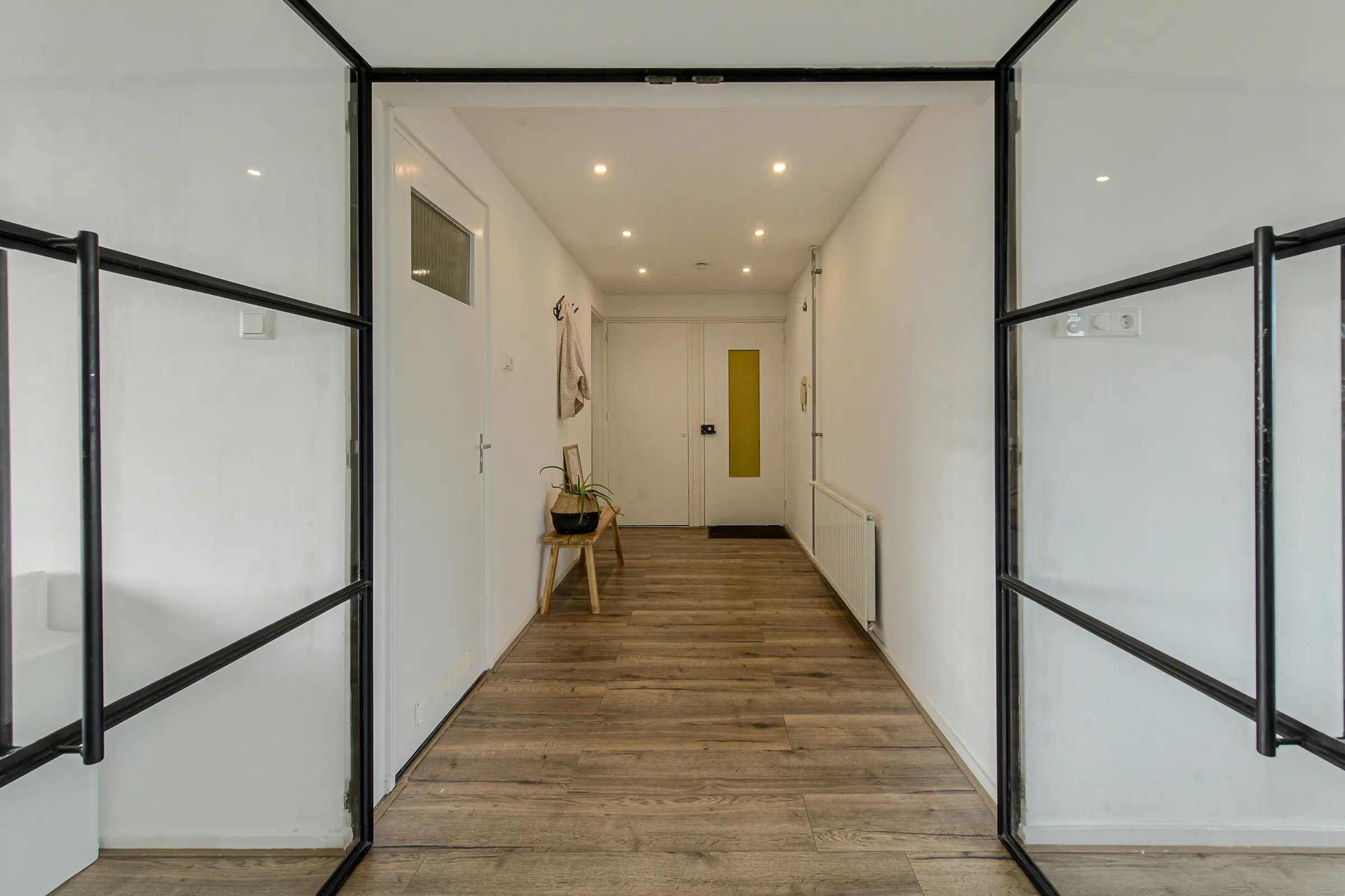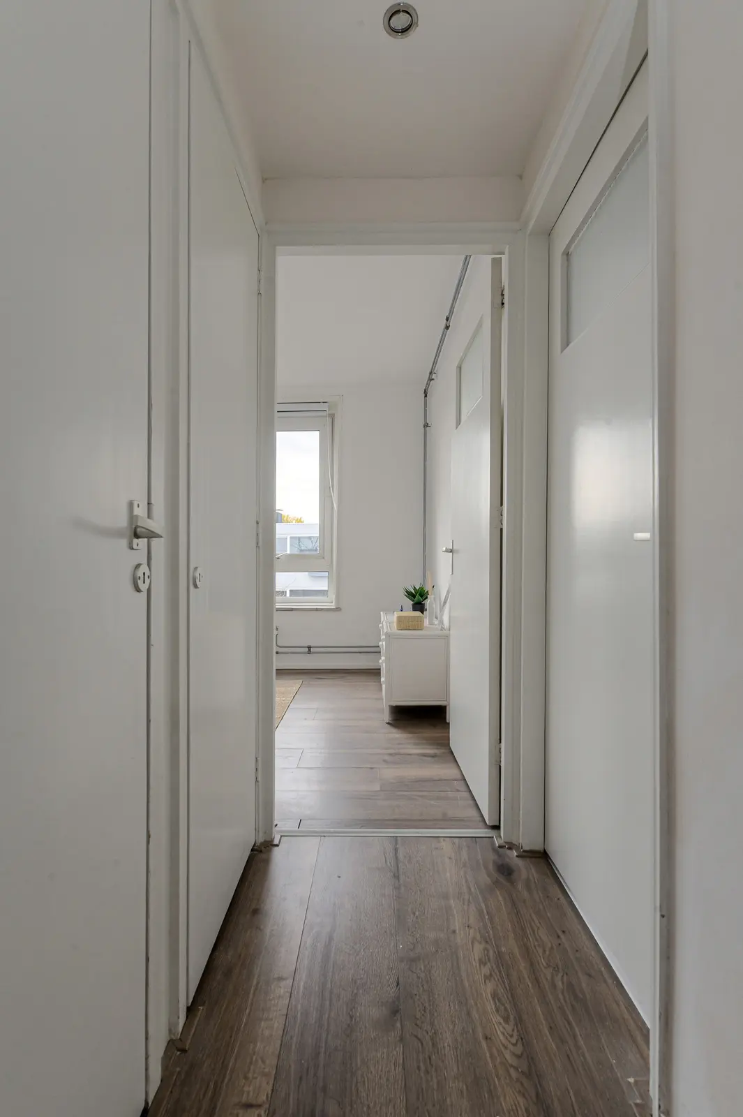 Ruime hal/entree met laminaatvloer, stalen pui en vaste kast. Vanuit hier zijn de woonkamer, keuken, badkamer, toilet en tussenhal bereikbaar. De tussenhal biedt toegang tot beide slaapkamers en beschikt eveneens over een vaste kast.