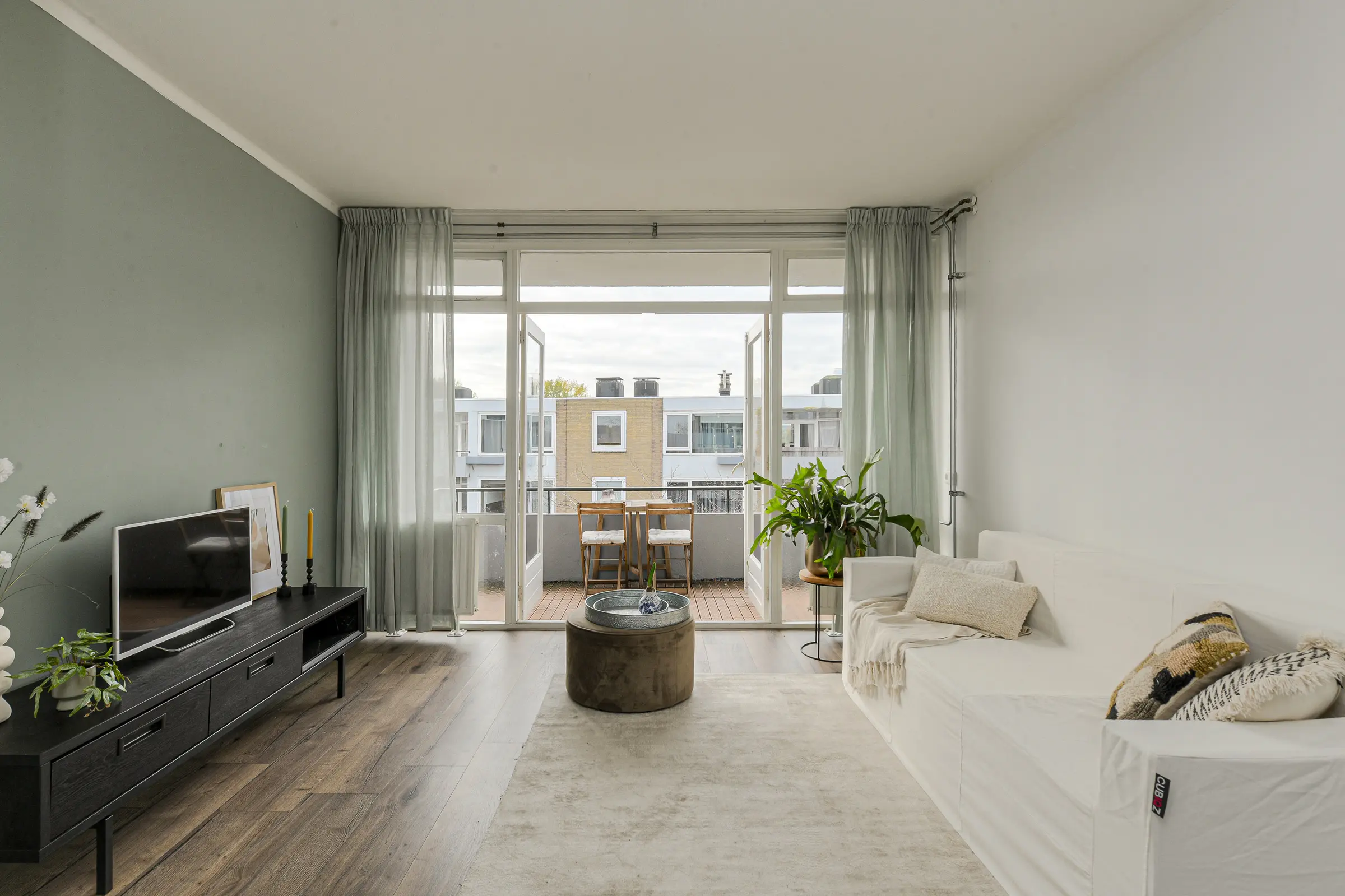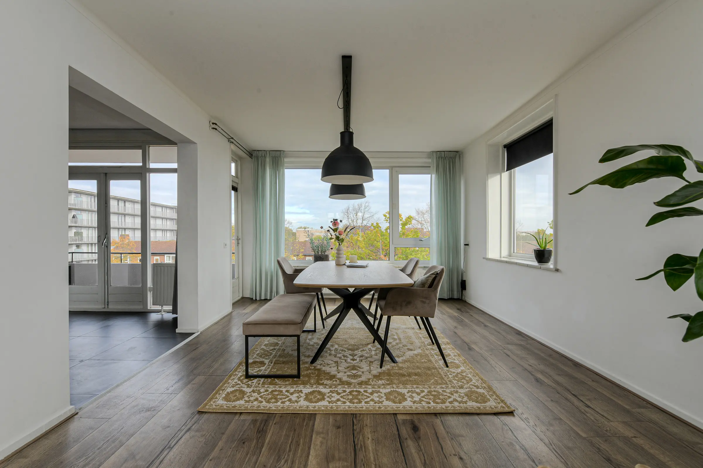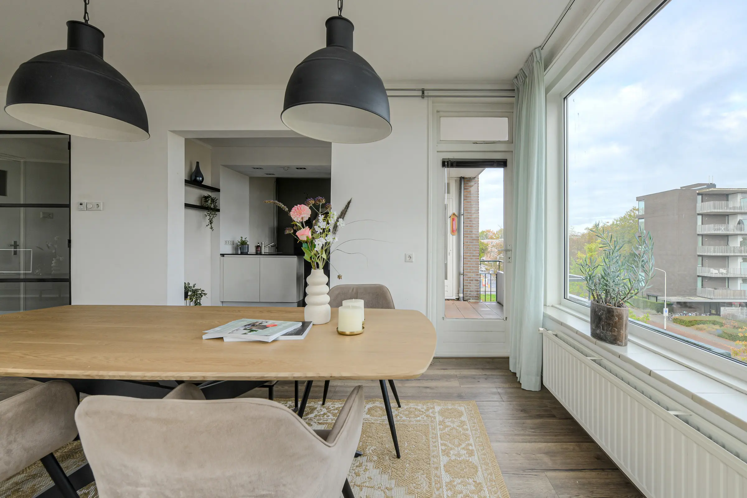 De royale WOONKAMER is heerlijk licht dankzij de grote raampartijen en biedt voldoende ruimte voor een zit- en eetgedeelte. Dubbele openslaande deuren geven toegang tot balkon op het zuiden, waar je volop van de zon kunt genieten.