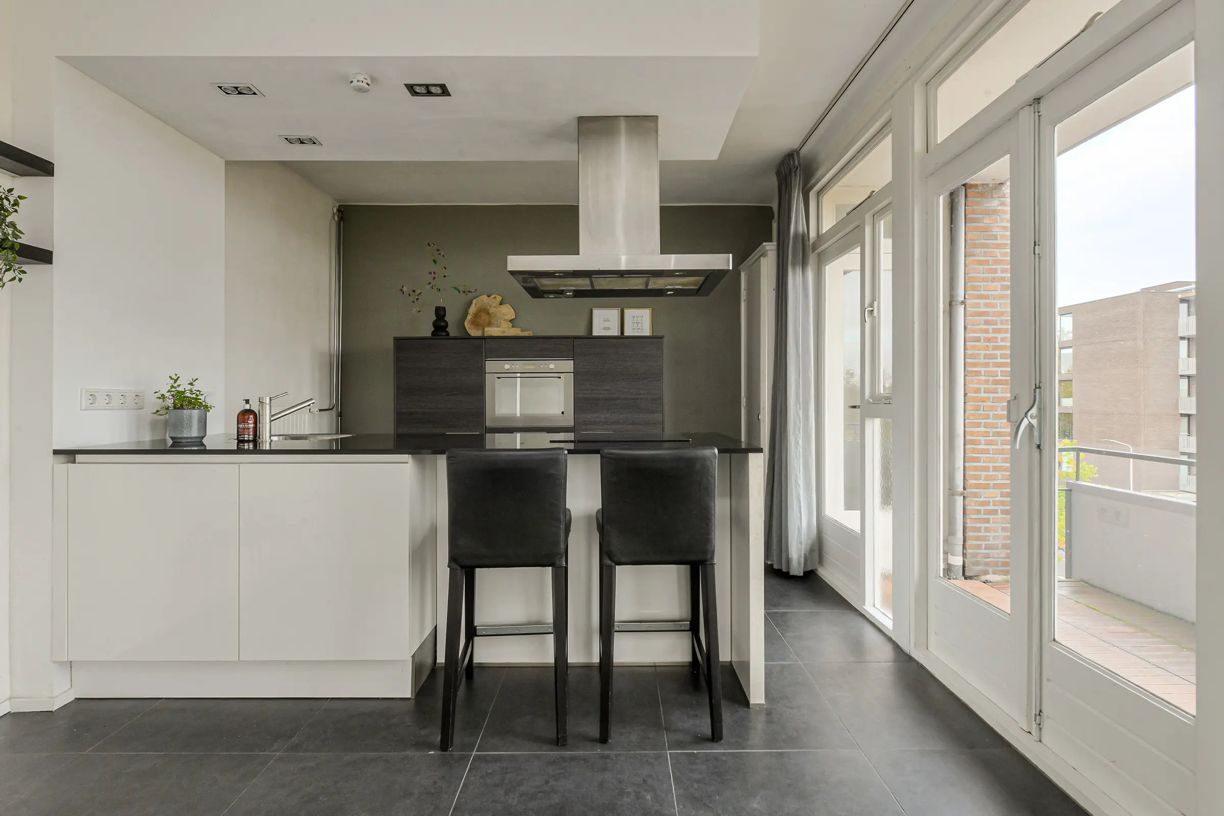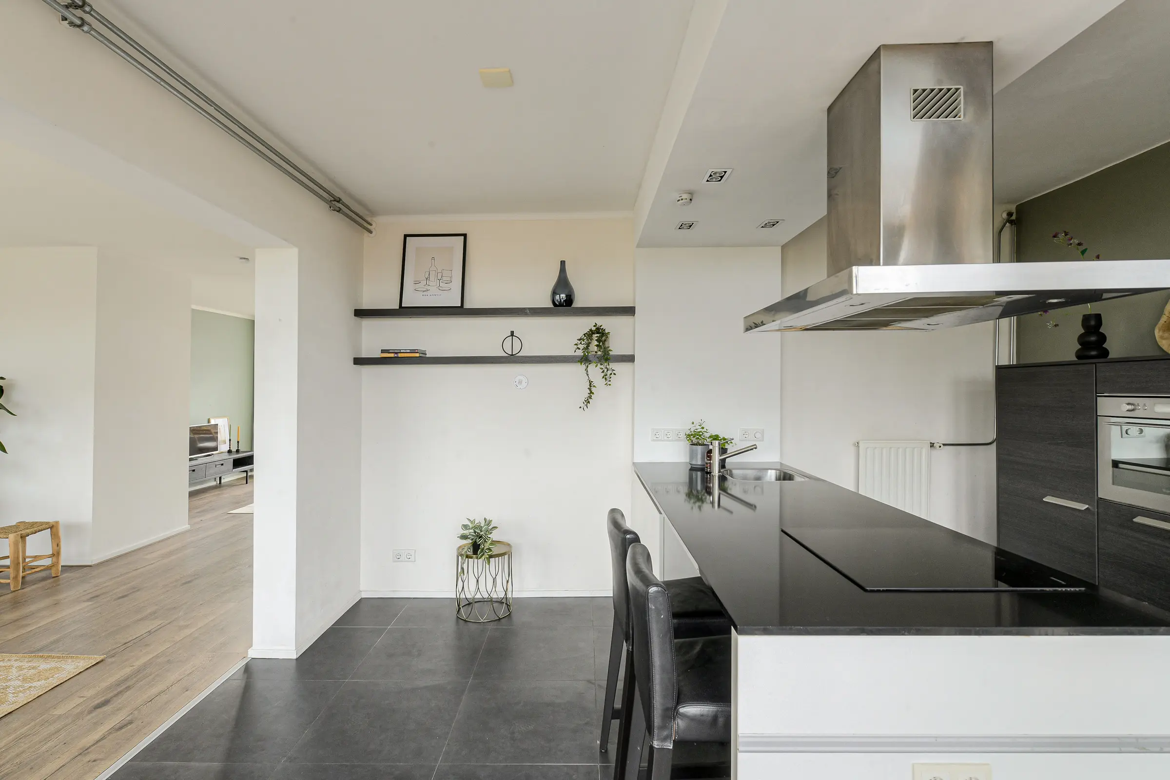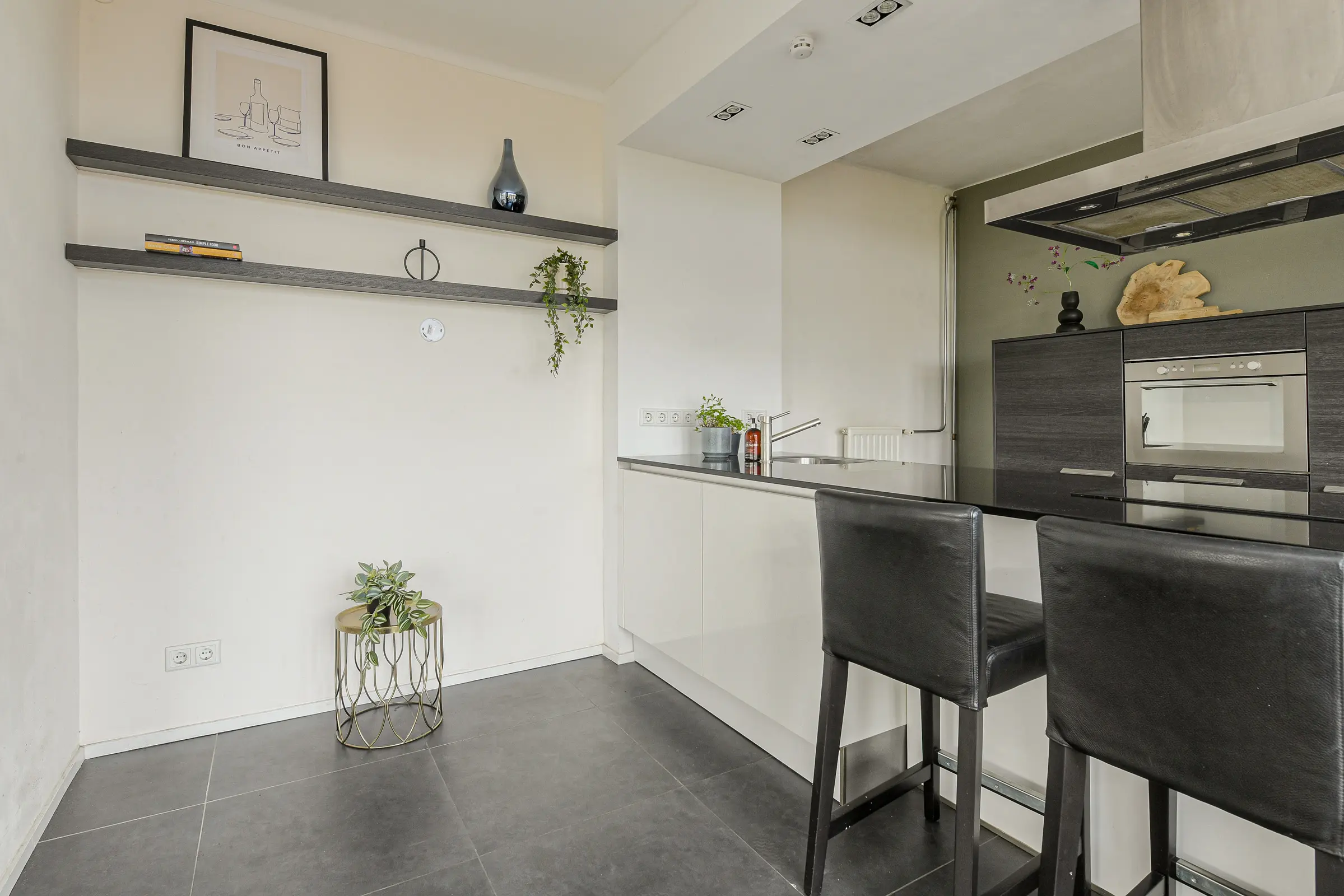 De aangrenzende (woon)keuken is modern ingericht met een hardstenen werkblad, keramische kookplaat, afzuigkap, koelkast, combi-oven, vaatwasser en een vaste kast met aansluitingen voor wasapparatuur. Vanuit de keuken leiden openslaande deuren naar balkon op het noorden — perfect om tijdens warme dagen de schaduw op te zoeken.