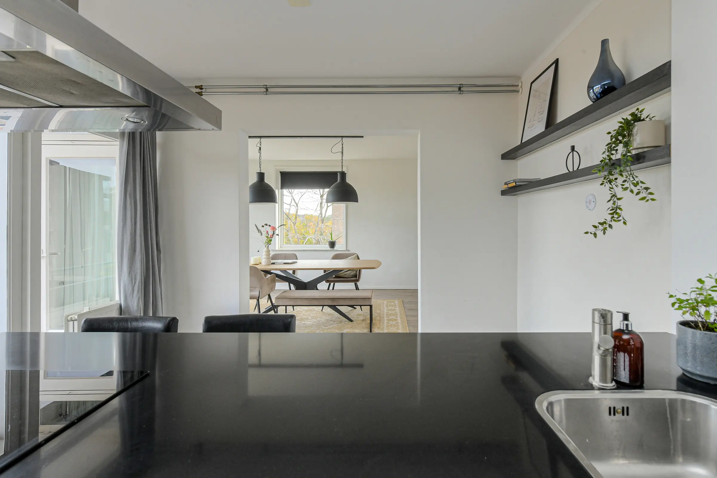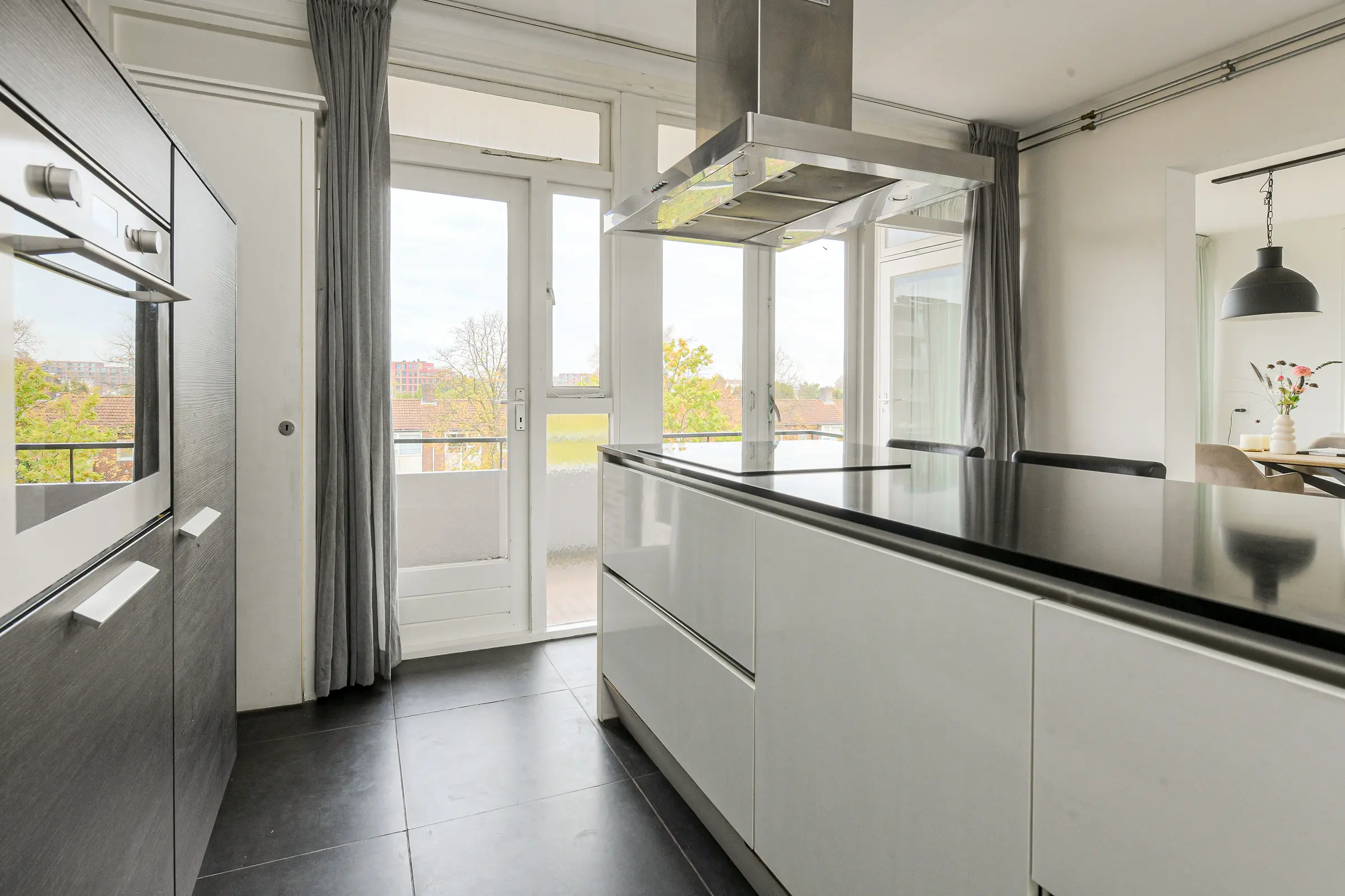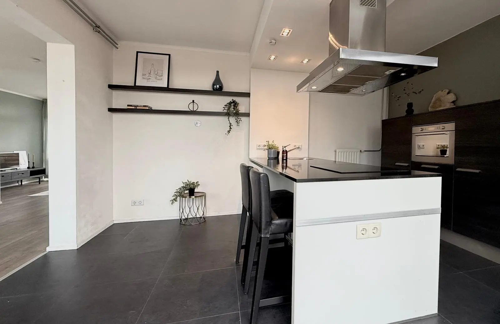 De aangrenzende (woon)keuken is modern ingericht met een hardstenen werkblad, keramische kookplaat, afzuigkap, koelkast, combi-oven, vaatwasser en een vaste kast met aansluitingen voor wasapparatuur. Vanuit de keuken leiden openslaande deuren naar balkon op het noorden — perfect om tijdens warme dagen de schaduw op te zoeken.