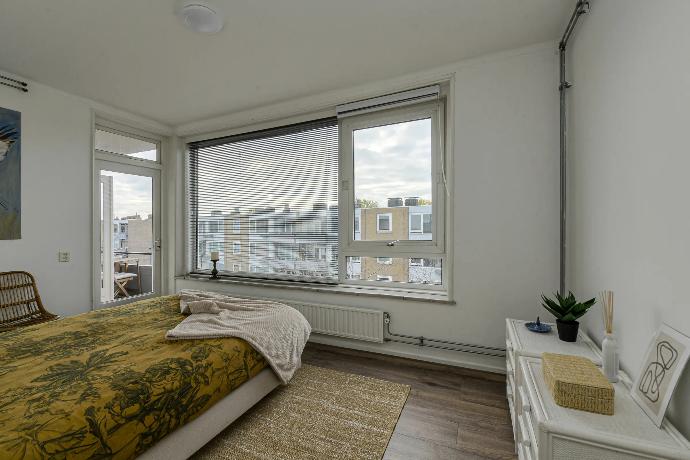 SLAAPKAMER I ligt aan de zuidzijde en heeft een laminaatvloer en openslaande deur naar het zonnige balkon.