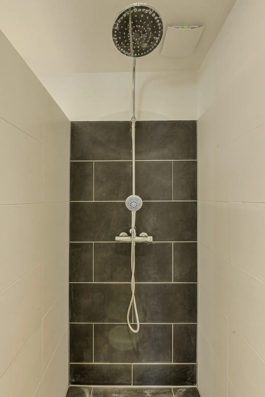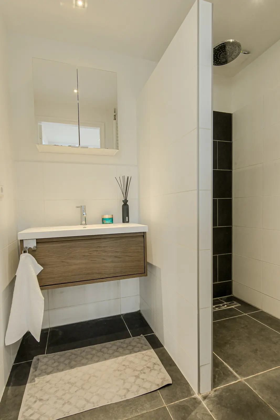 De moderne BADKAMER is keurig afgewerkt en uitgerust met een wastafelmeubel, automatische ventilatie en een ruime inloopdouche met thermostaatkraan, hand- en regendouche.